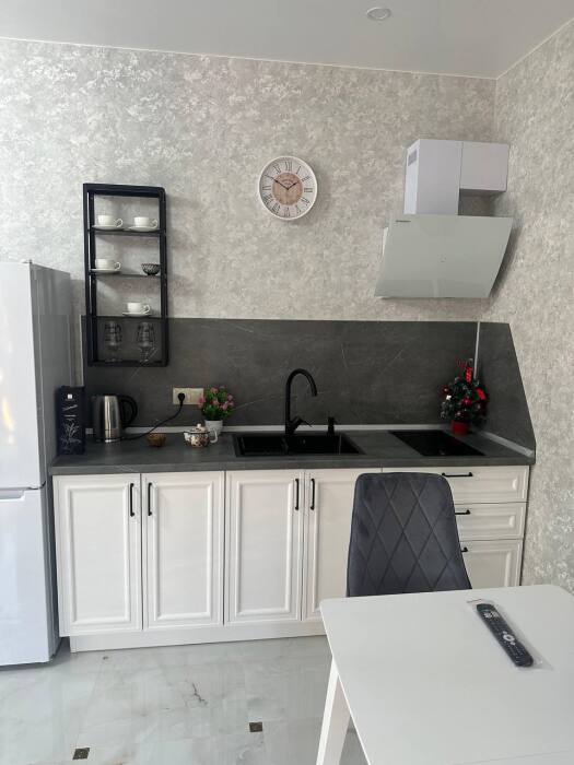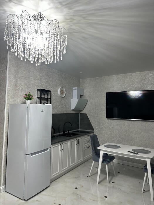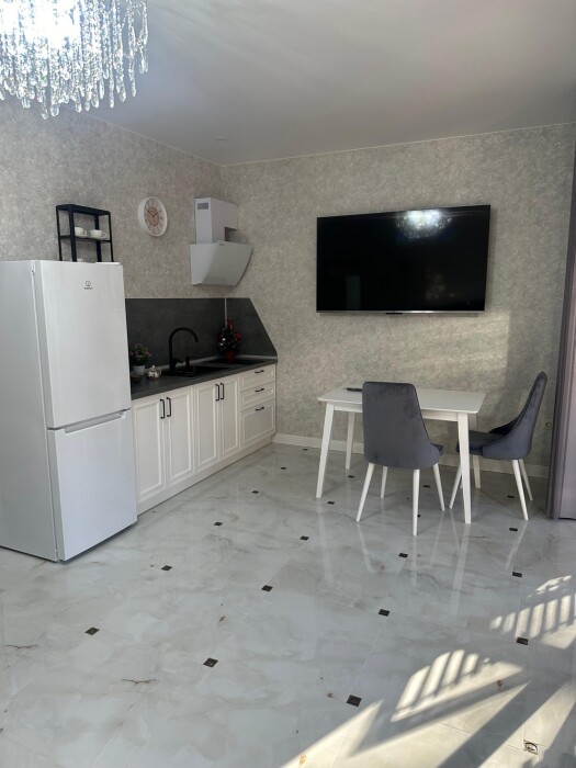 Отдельная кухня: Электрическая плита, микроволновая печь, холодильник, чайник, обеденный стол, стулья, посуда, столовые приборы.