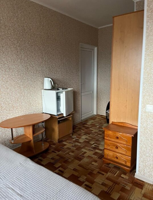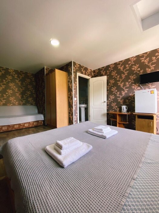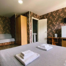 Номер двухкомнатный с отдельным входом и всеми удобствами. Отлично подойдет для троих или семьи с 1-2 детьми. Отдельный вход. В номере в одной комнате 2-спальная кровать, вторая комната небольшая, в ней 1 спальная кровать и детское доп. место (кресло-кровать до 9 лет) душ, туалет, телевизор, холодильник, шкаф, тумбы, кондиционер, WI-FI. Доп. место входит в стоимость.