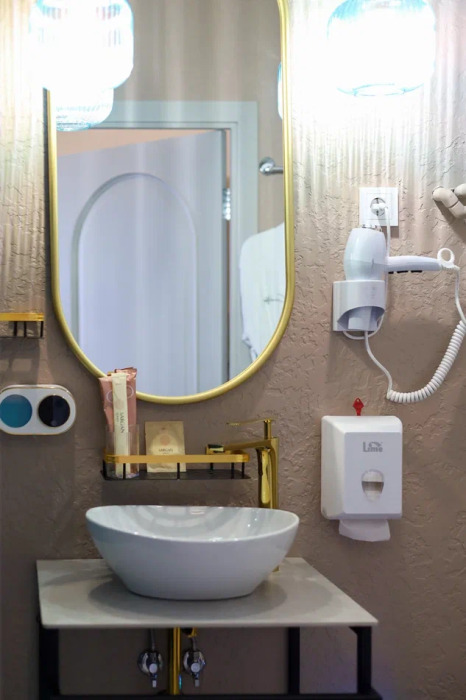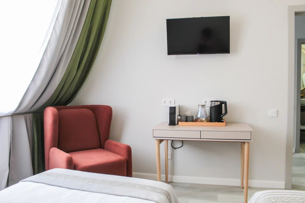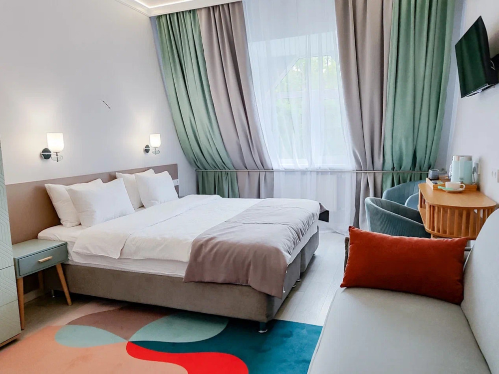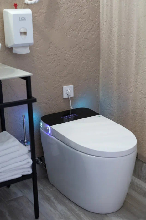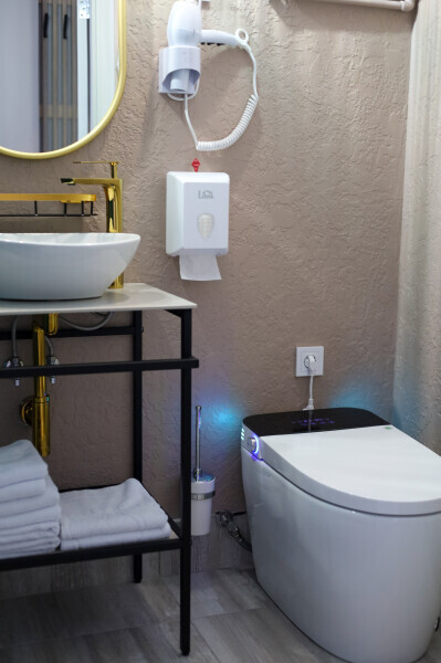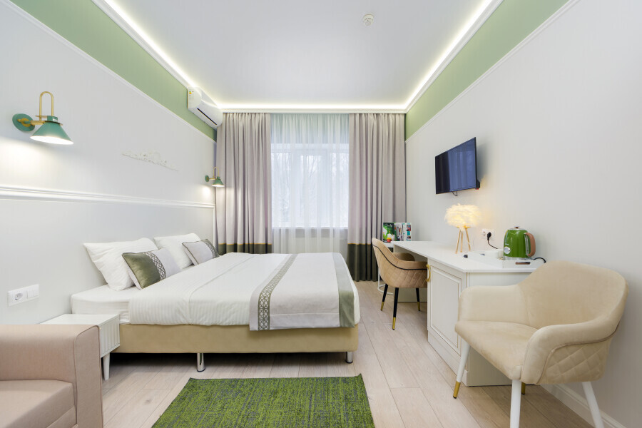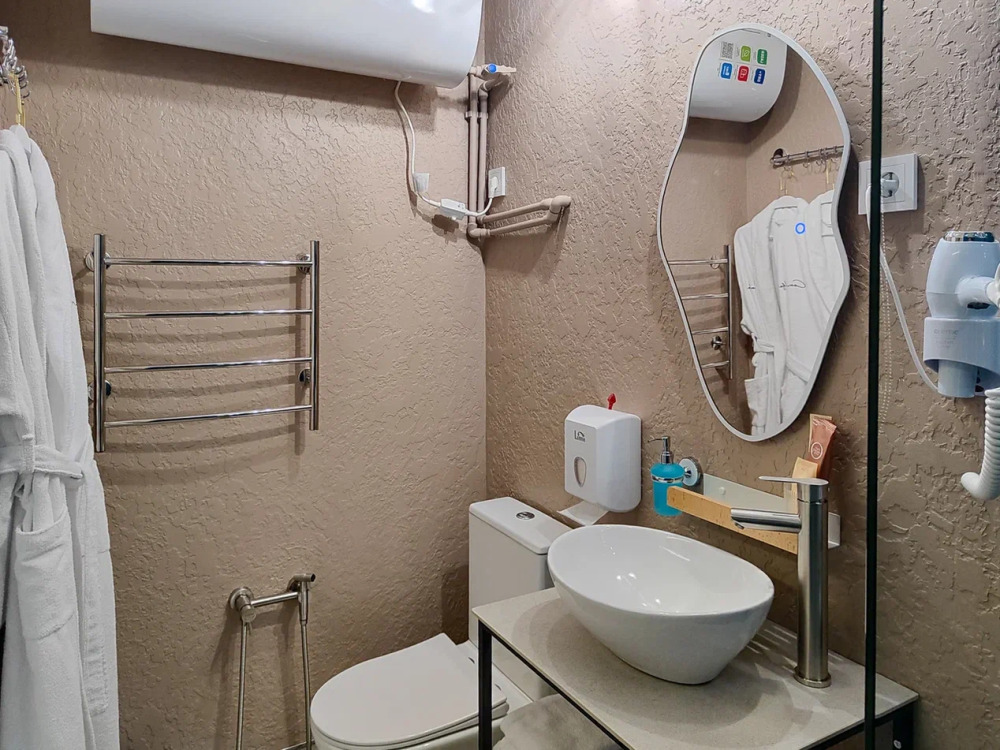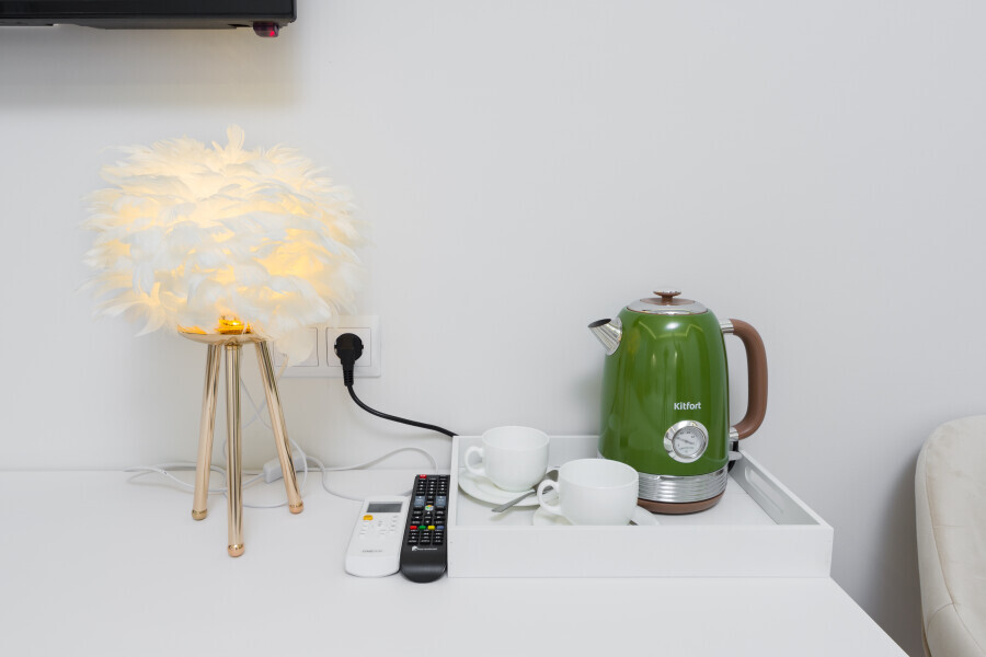 Красивый, уютный номер с максимально стильным и современным оснащением. В номере есть Яндекс колонка, капсульная кофе-машина, умный унитаз.