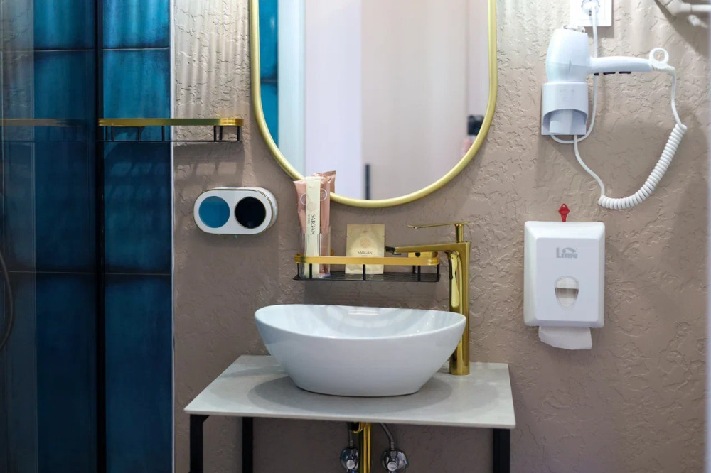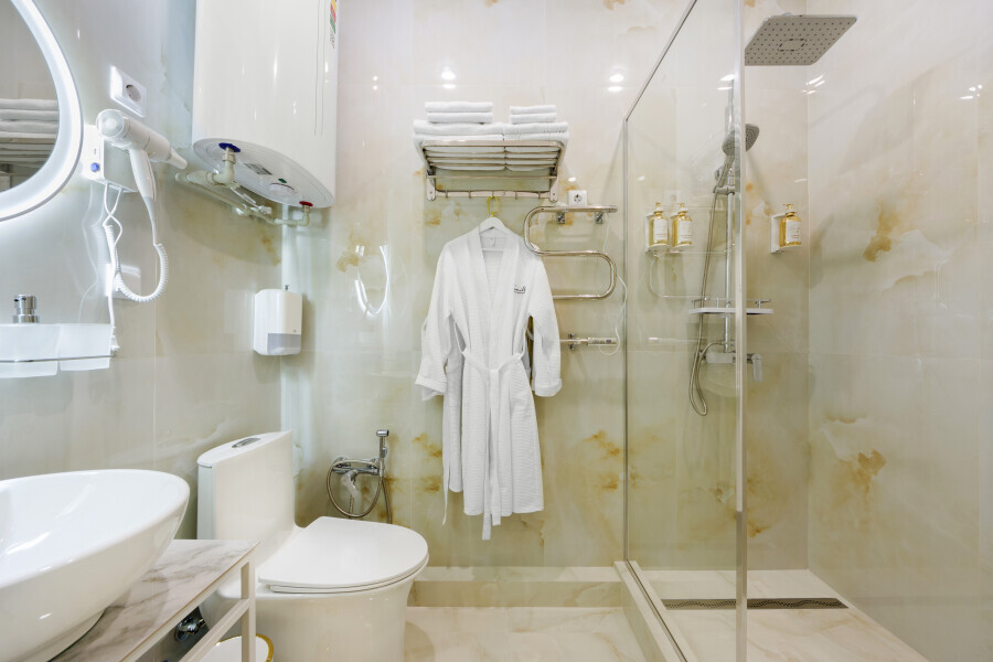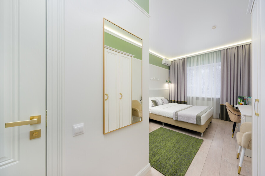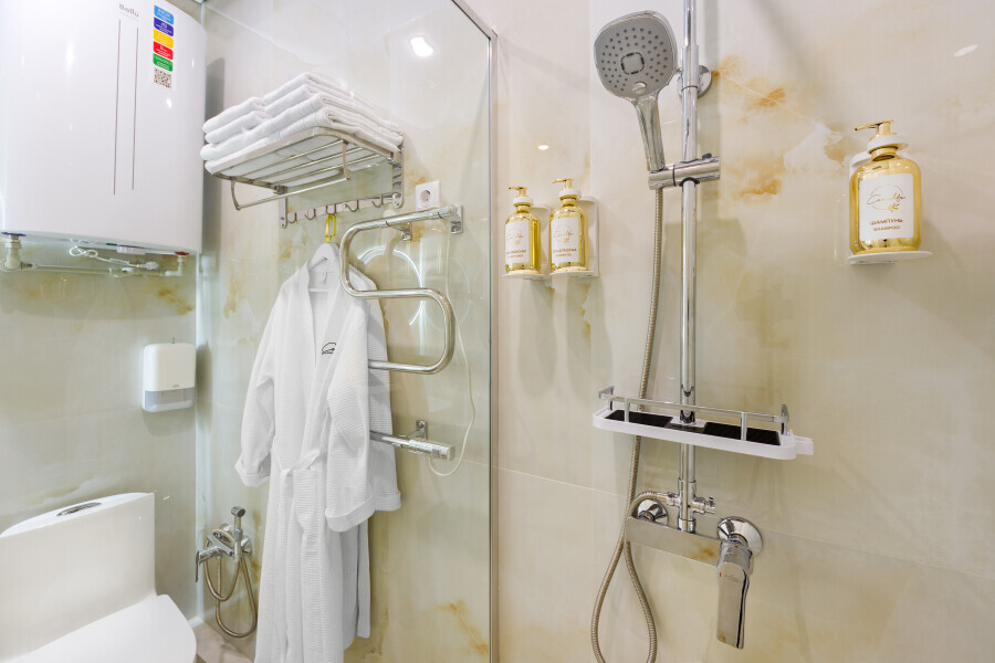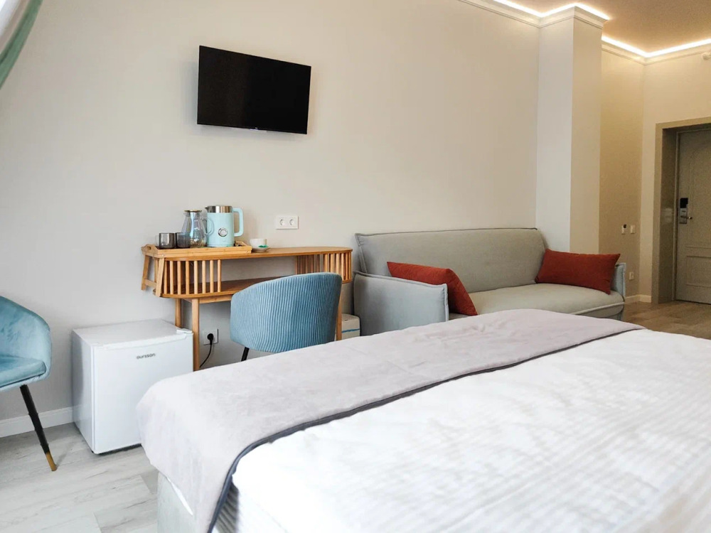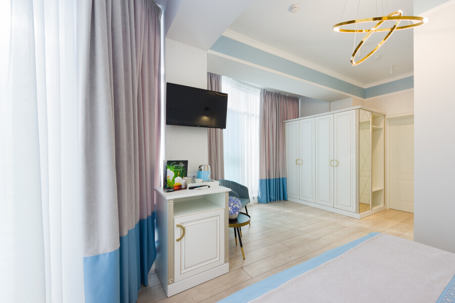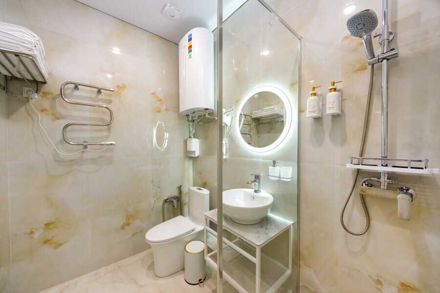 Красивый, уютный номер с максимально стильным и современным оснащением. В номере есть Яндекс колонка, капсульная кофе-машина, умный унитаз.