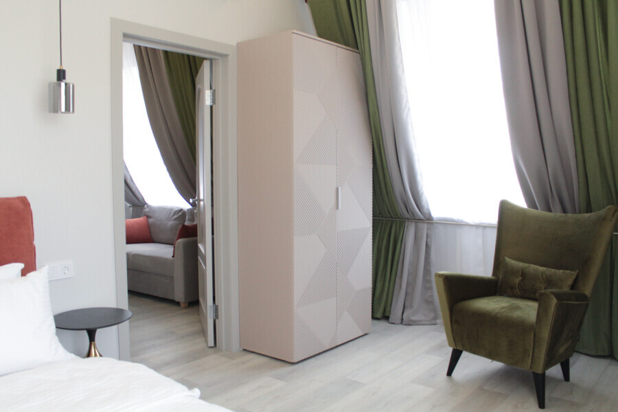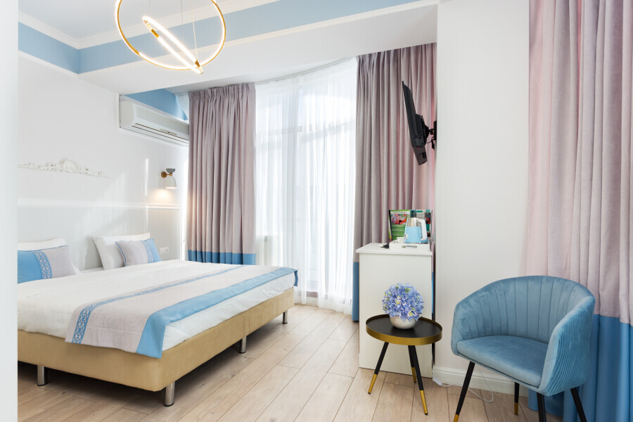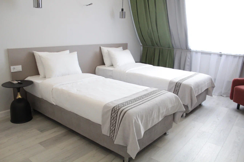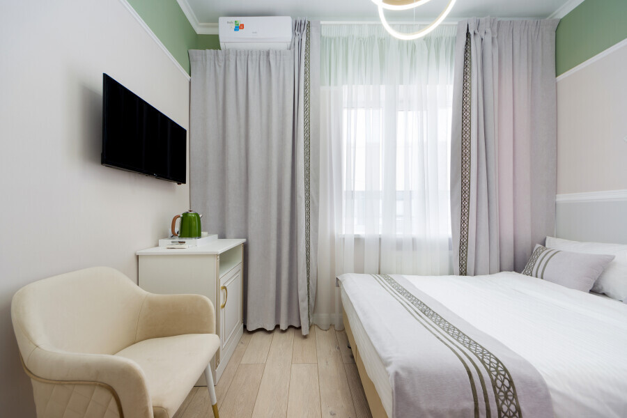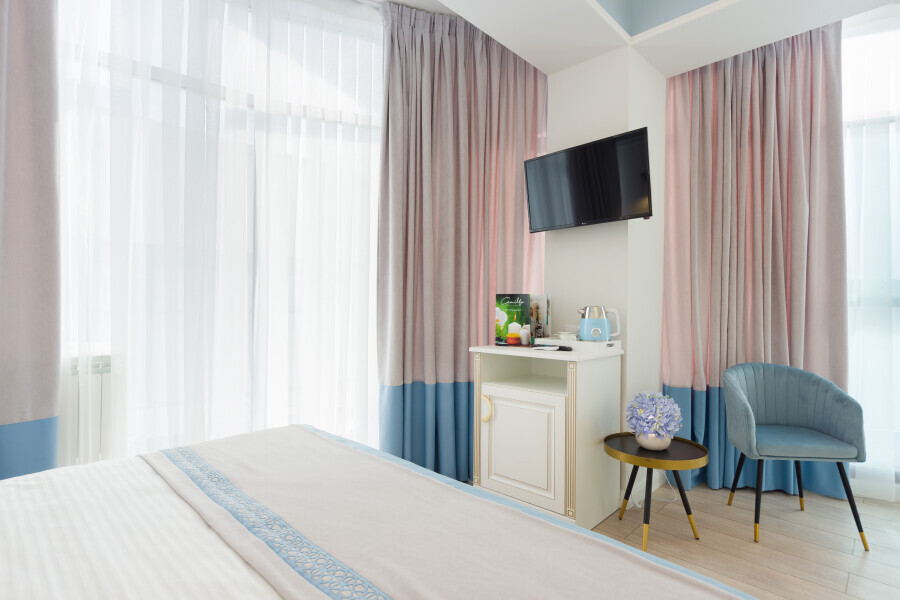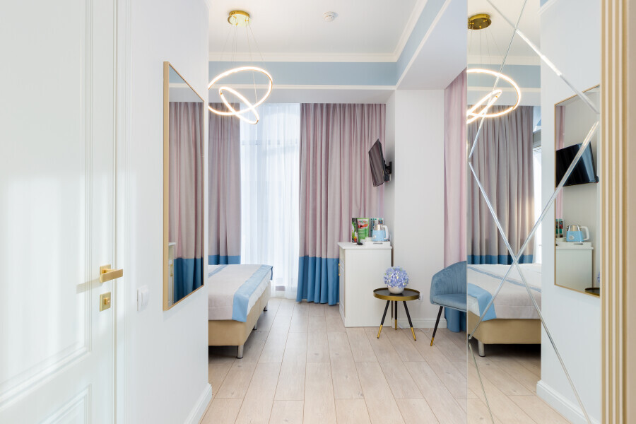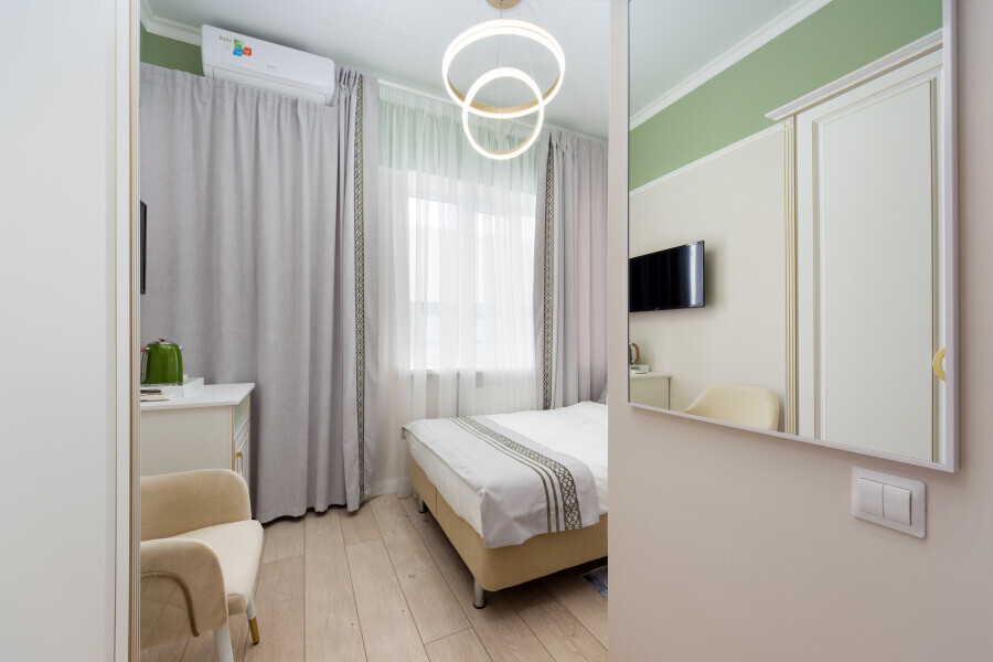 К услугам гостей в отеле 3 категории номеров, оформленных в индивидуальном стиле и цветовой гамме: Одноместный стандарт с одной кроватью, Двухместный стандарт с одной большой кроватью, и Улучшенный двухместный стандарт с одной большой кроватью. Все номера оснащены централизованной системой кондиционирования воздуха, сейфом, мини-холодильником, телевизором, электрочайником и прочим необходимым оборудованием. Ванные комнаты оснащены полотенцами, халатами, тапочками, косметикой, имеется гигиенический душ. На этаже имеется кухонная зона с микроволновой печью и посудой.