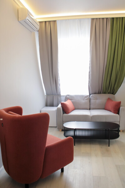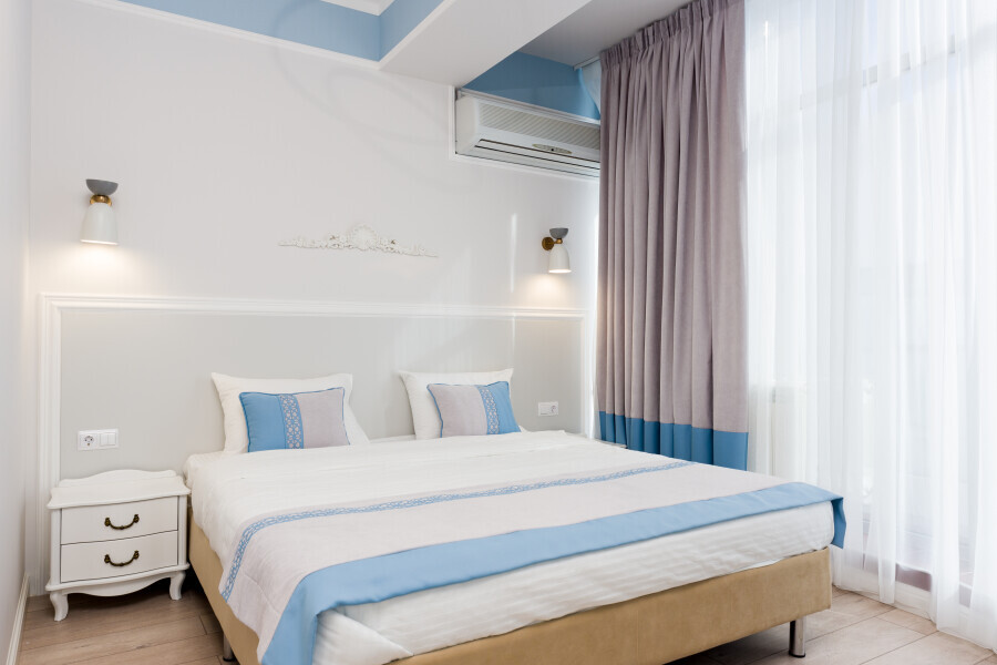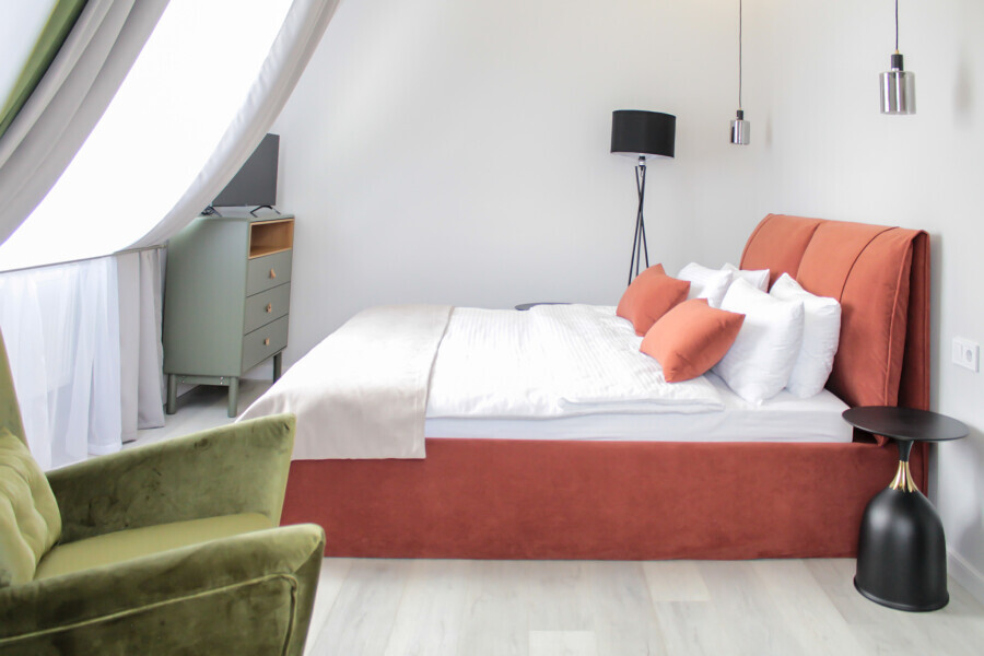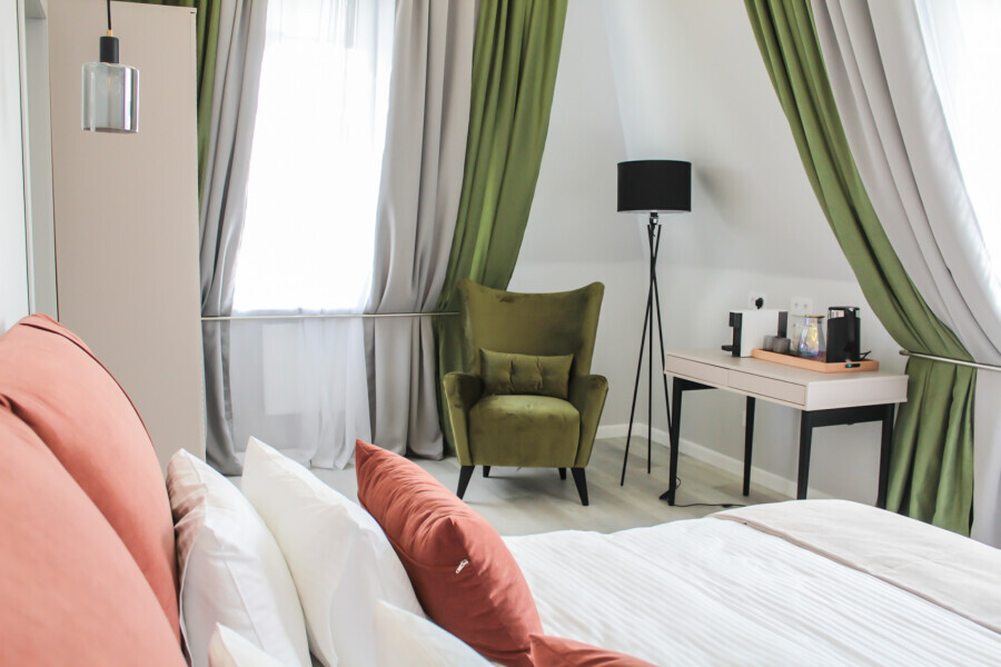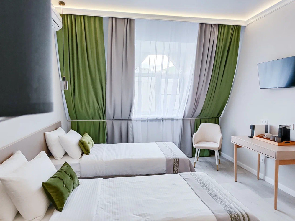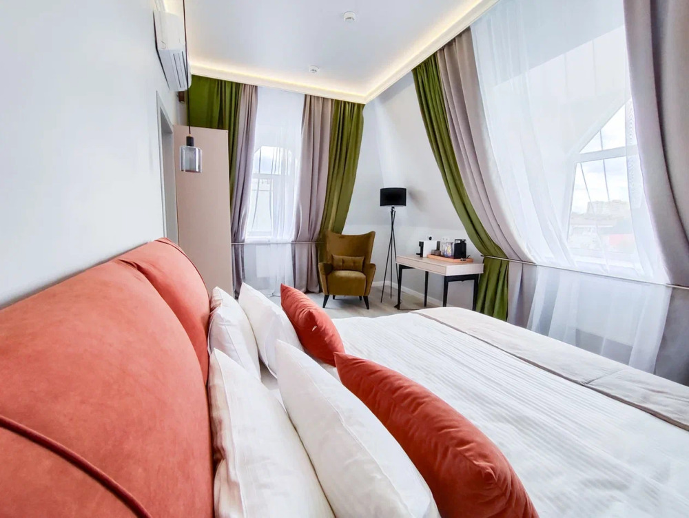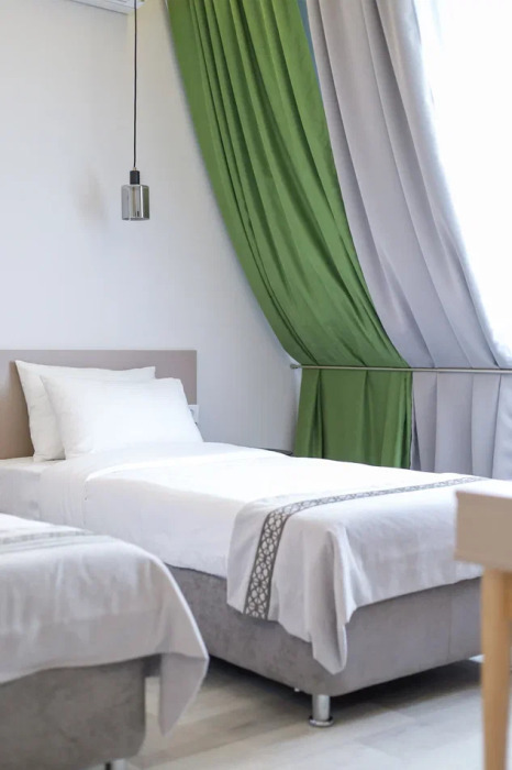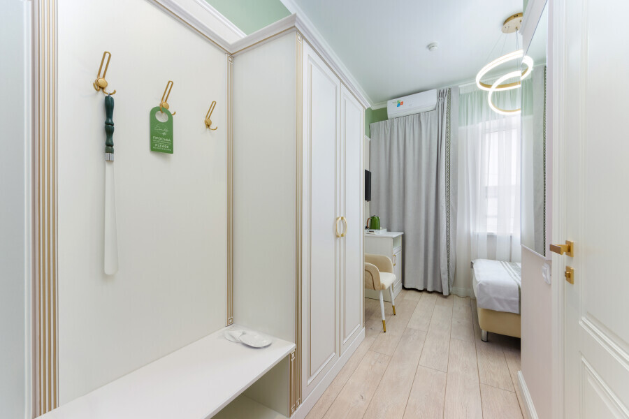 К услугам гостей в отеле 3 категории номеров, оформленных в индивидуальном стиле и цветовой гамме: Одноместный стандарт с одной кроватью, Двухместный стандарт с одной большой кроватью, и Улучшенный двухместный стандарт с одной большой кроватью. Все номера оснащены централизованной системой кондиционирования воздуха, сейфом, мини-холодильником, телевизором, электрочайником и прочим необходимым оборудованием. Ванные комнаты оснащены полотенцами, халатами, тапочками, косметикой, имеется гигиенический душ. На этаже имеется кухонная зона с микроволновой печью и посудой.