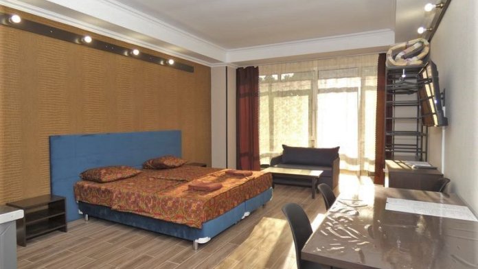 Уютные студия, полностью оборудованная для комфортного проживания и отдыха. Есть кухня со всем необходимым: посуда, плита, микроволновая печь, холодильник, электрический чайник, вытяжка.