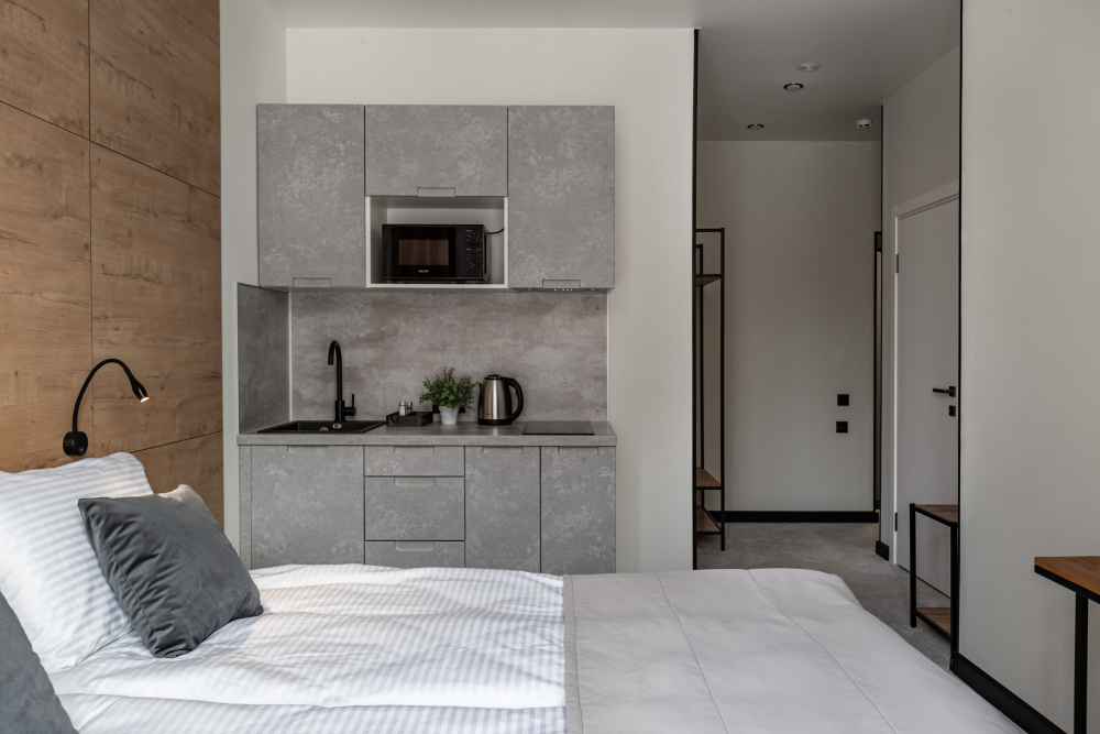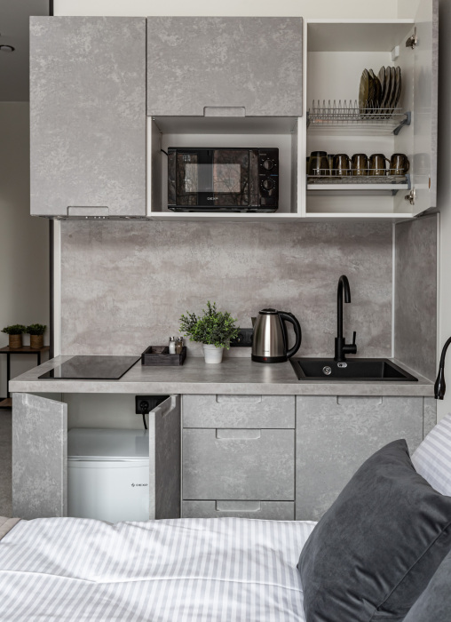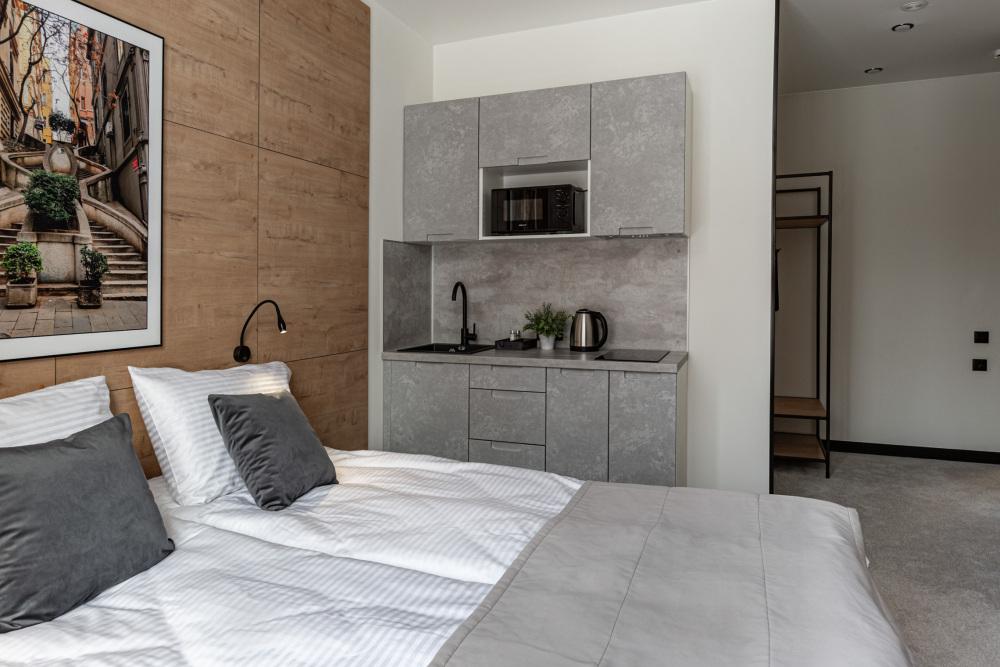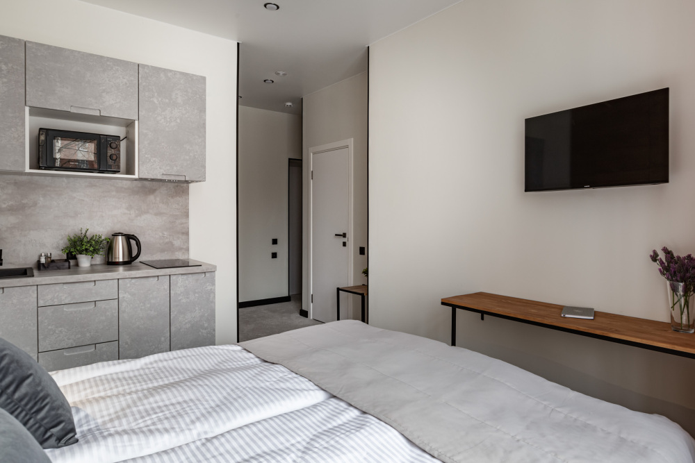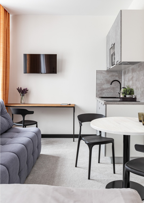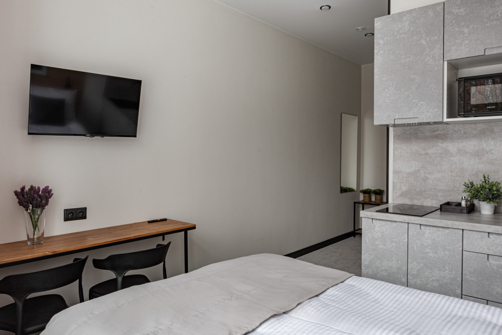 В номере: мини-кухня (микроволновая печь, плита, холодильник, посуда, столовые приборы, чайник), телевизор, кондиционер, обеденный стол, шкаф, вешалки, письменный стол, гостиная зона, зеркало, тумба, стул, тапочки, светонепроницаемые шторы.