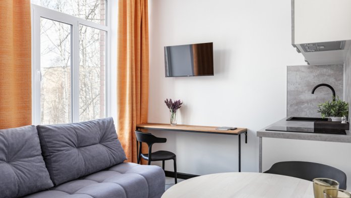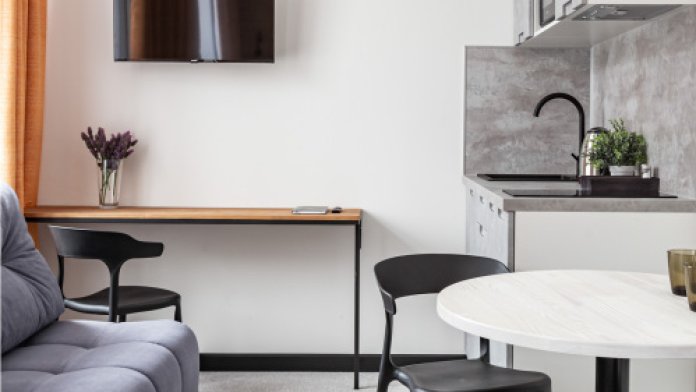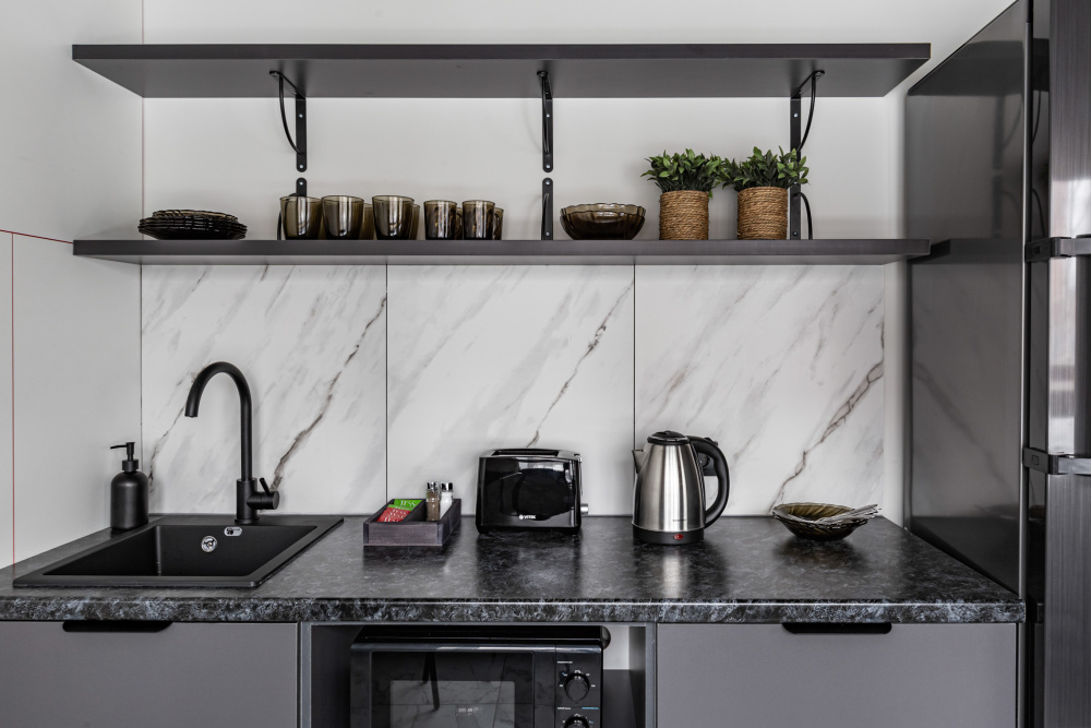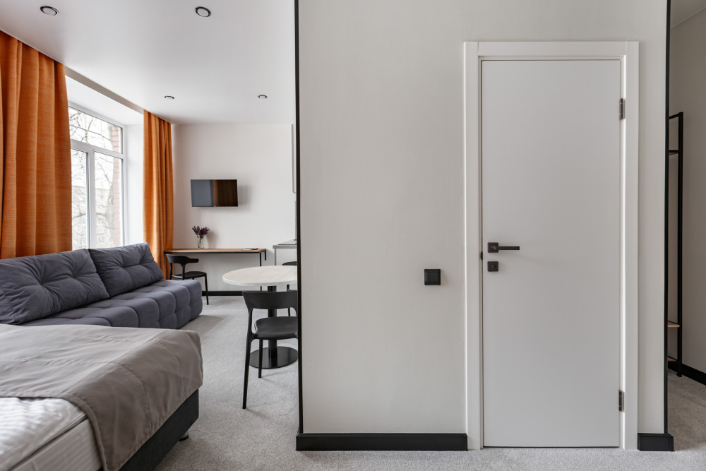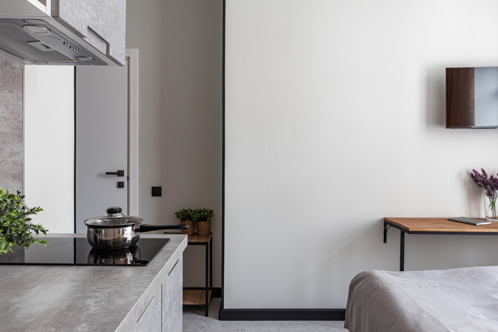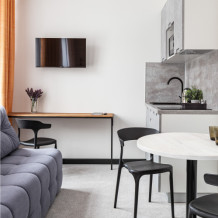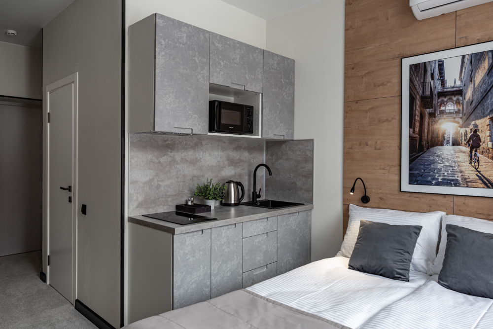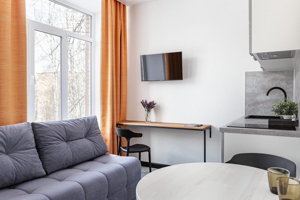 В номере: мини-кухня (микроволновая печь, плита, холодильник, посуда, столовые приборы, чайник), телевизор, кондиционер, обеденный стол, шкаф, вешалки, письменный стол, гостиная зона, зеркало, тумба, стул, тапочки, светонепроницаемые шторы.