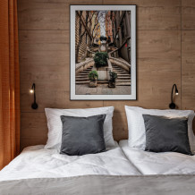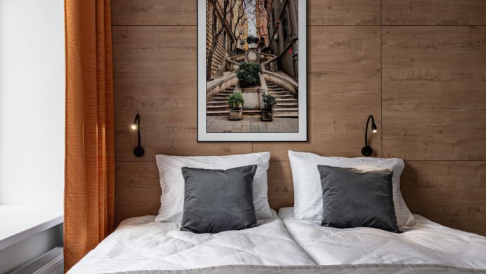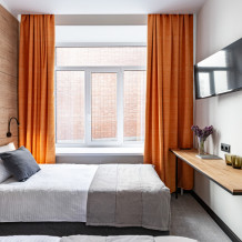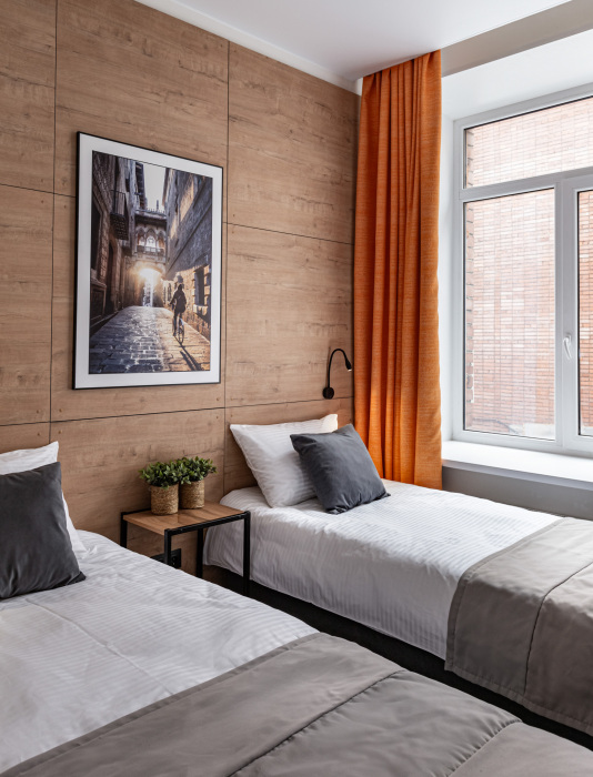 Номер площадью 18 м2. с 1 двуспальной кроватью 160*200 см. или 2 односпальными кроватями 80*200 см. Вместимость номера - 4 гостя.