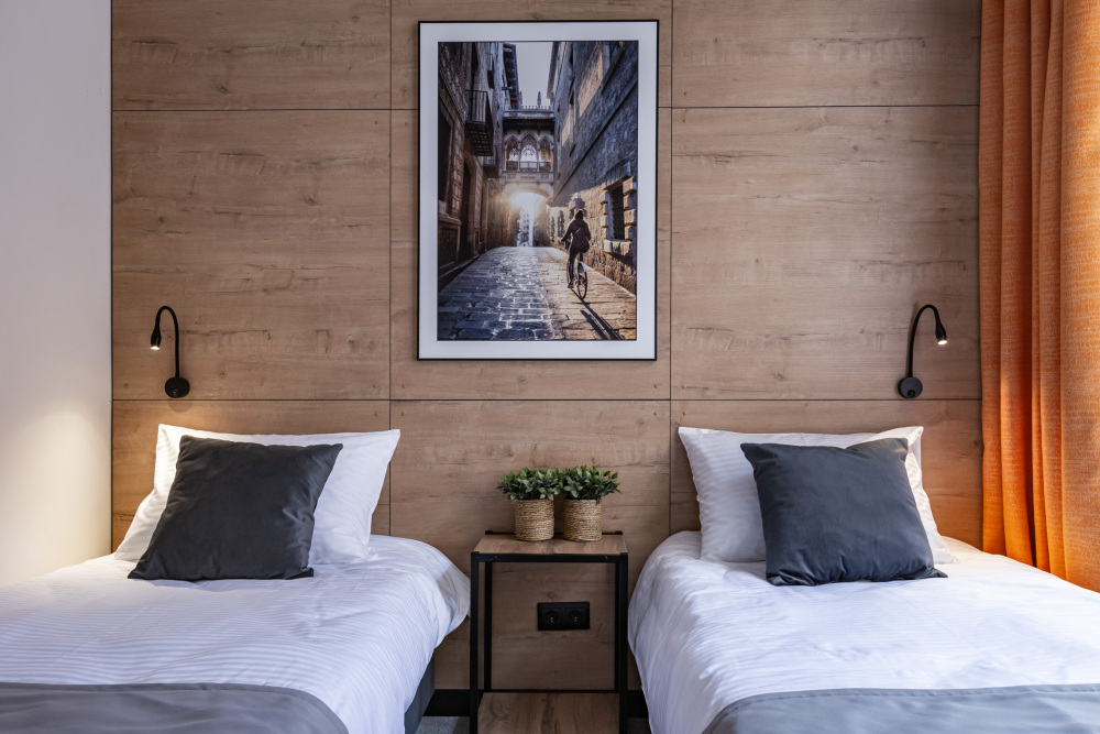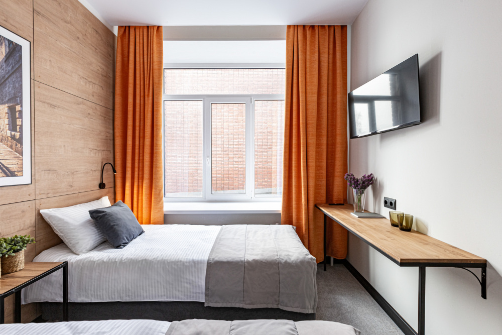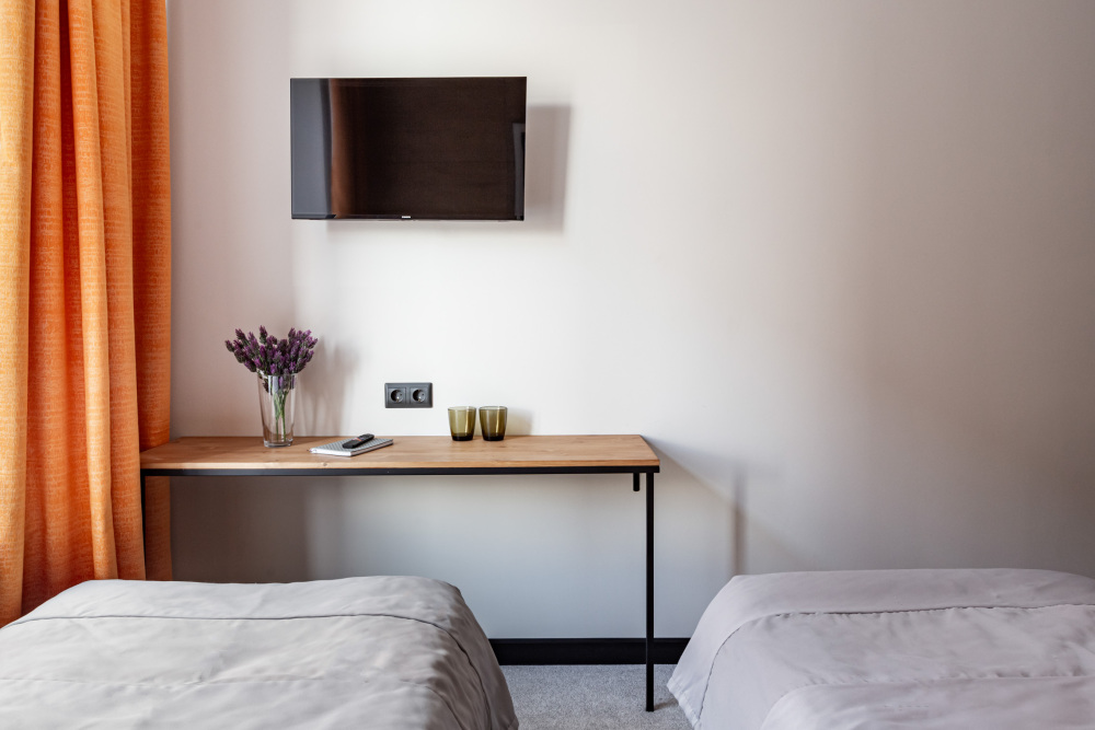 Номер площадью 12 м2. с 1 двуспальной кроватью 160*200 см или 2 односпальными кроватями 80*200 см. Вместимость номера - 2 гостя.