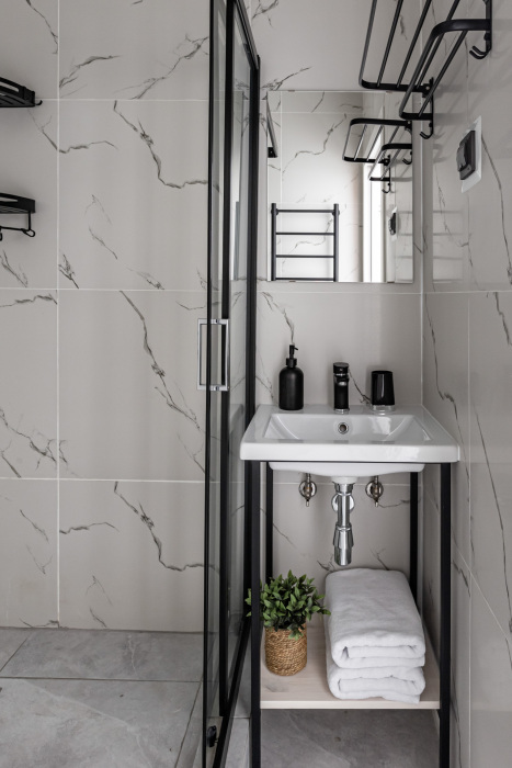 В ванной комнате: душ, туалет, раковина, полотенца, туалетно-косметические принадлежности, фен, зубной набор.