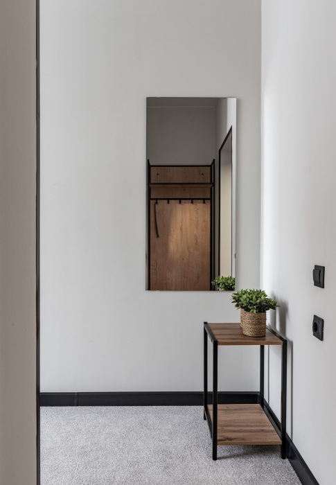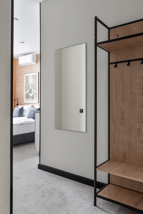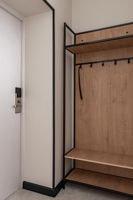 В номере: мини-кухня (микроволновая печь, плита, холодильник, посуда, столовые приборы, чайник), телевизор, кондиционер, обеденный стол, шкаф, вешалки, зеркало, тумба, стул, тапочки, светонепроницаемые шторы.