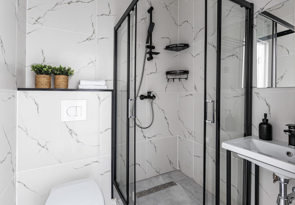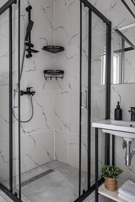 В ванной комнате: душ, туалет, раковина, полотенца, туалетно-косметические принадлежности, фен.