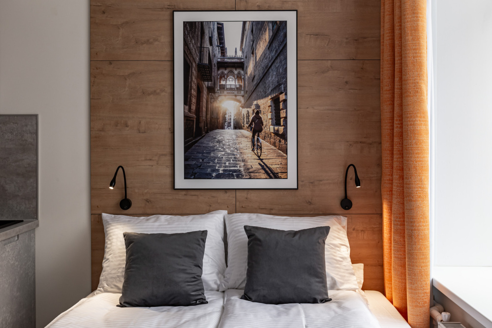 Номер площадью 14 м2. с 1 двуспальной кроватью 160*200 см. Вместимость номера - 2 гостя.