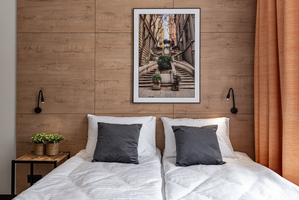 Номер площадью 14 м2. с 1 двуспальной кроватью 160*200 см. или 2 односпальными кроватями 80*200 см. Вместимость номера - 2 гостя.