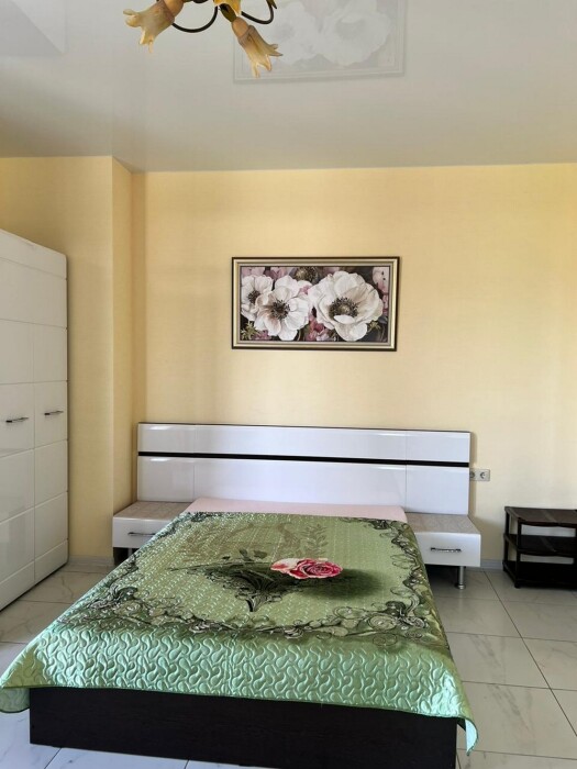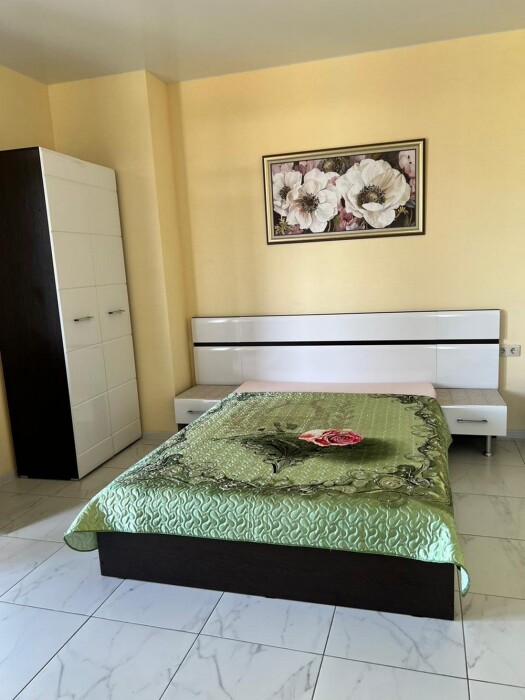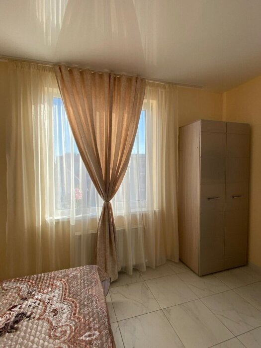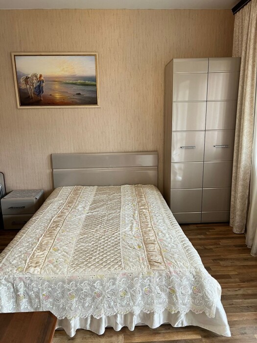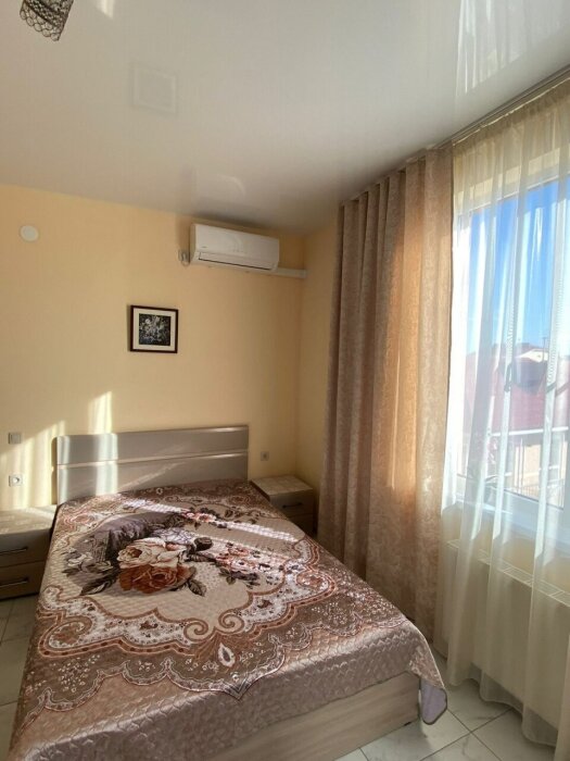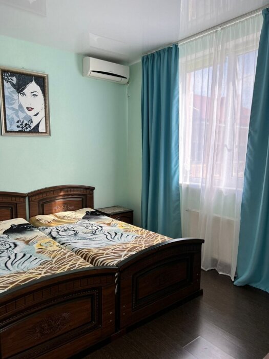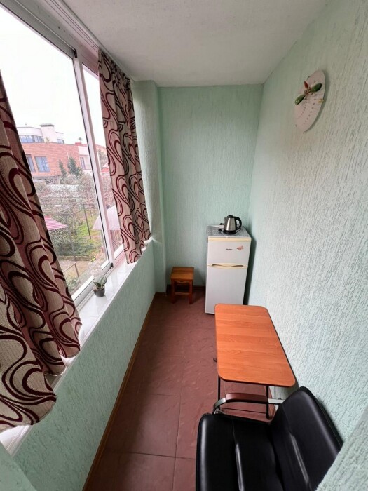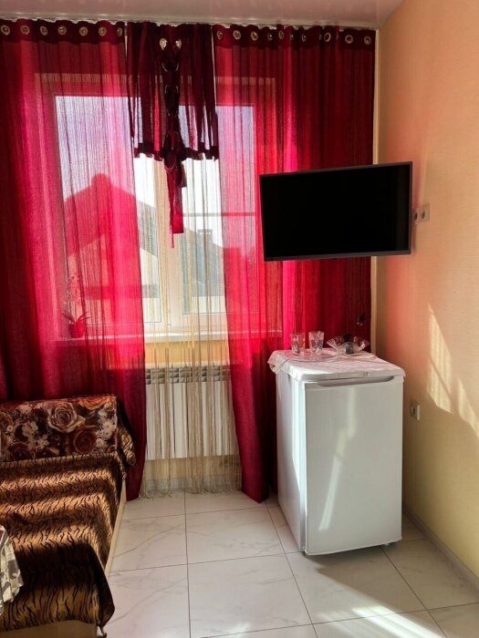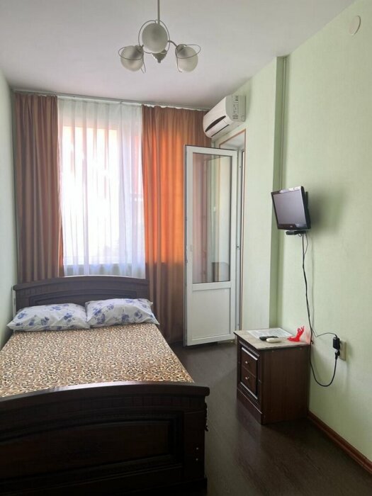 Имеется телевизор, кондиционер, шкаф, вешалка, зеркало, журнальный столик, холодильник, стулья, антимоскитная сетка