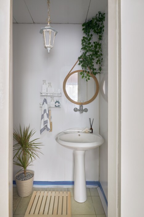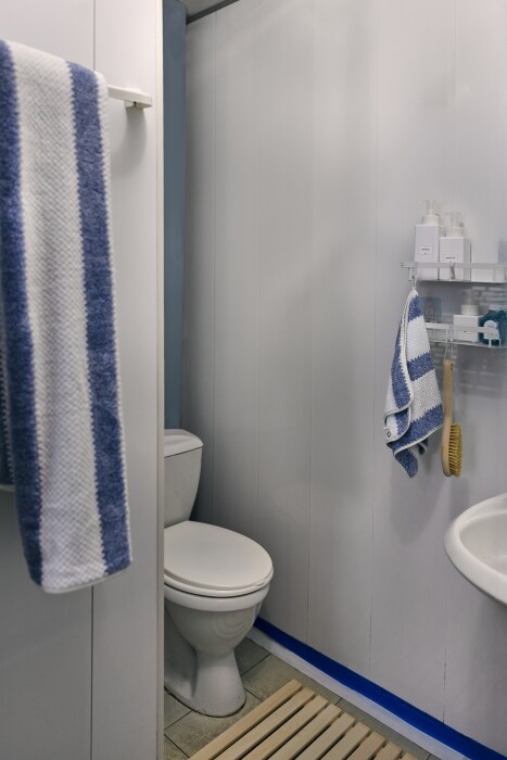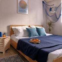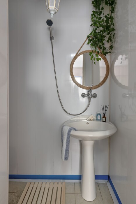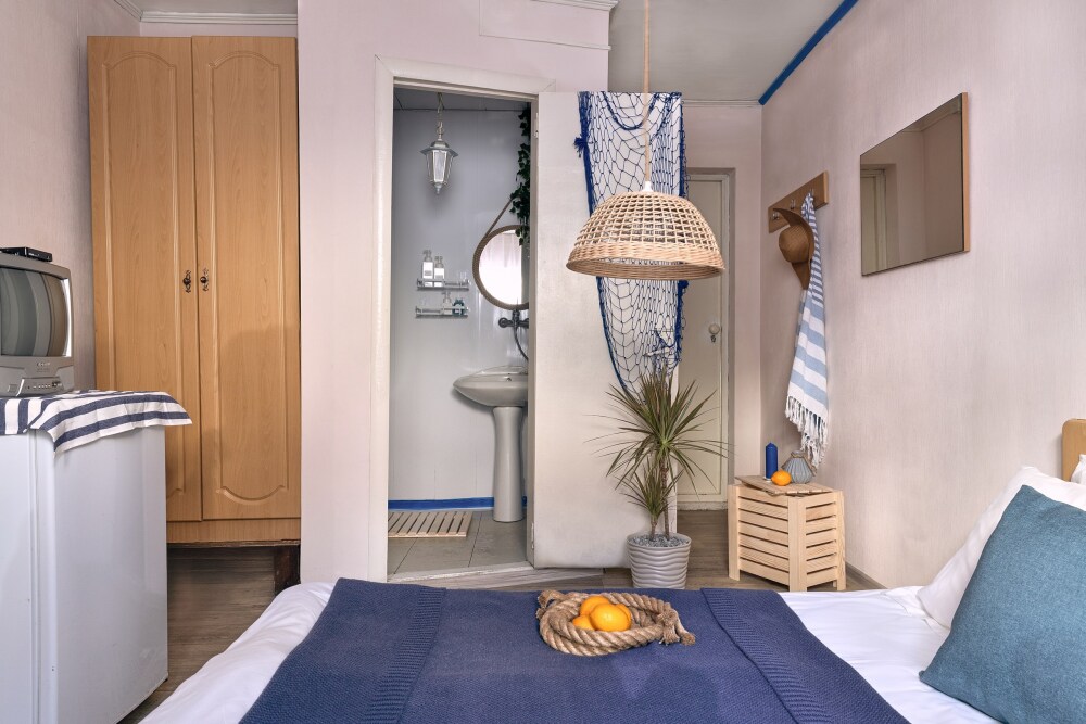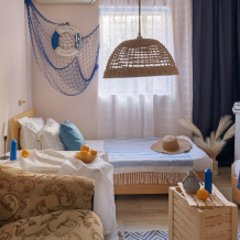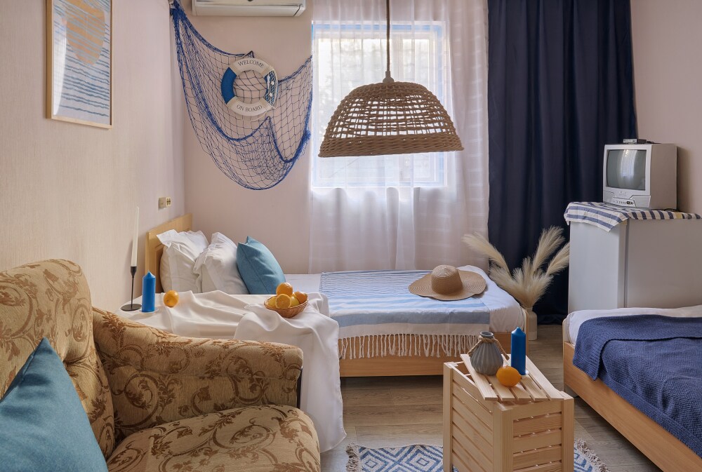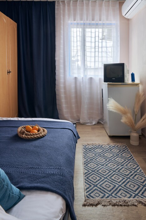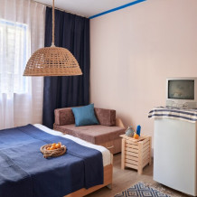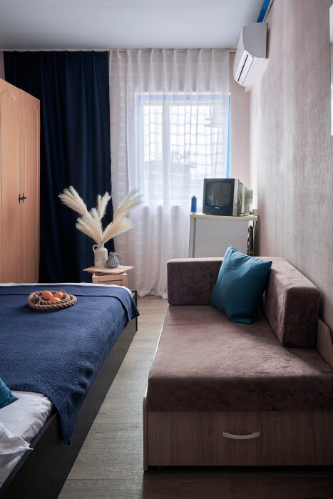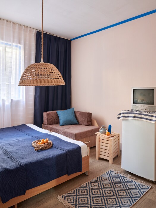 Трёхместный номер площадью 16 кв.м подойдёт для семьи или небольшой компании. Номера расположены на 1–2 этажах и выходят во внутренний двор, поэтому здесь тихо и спокойно. В номере: двуспальная кровать и кресло-кровать, шкаф для одежды, комод и зеркало. Для комфорта есть Wi-Fi, телевизор и кондиционер. Также имеется балкон с верёвками для сушки одежды. Собственная ванная комната оборудована душем, предоставляется постельное бельё. Гости могут пользоваться общей кухней с варочной поверхностью, микроволновкой, холодильником, чайником, посудой и столовыми приборами.