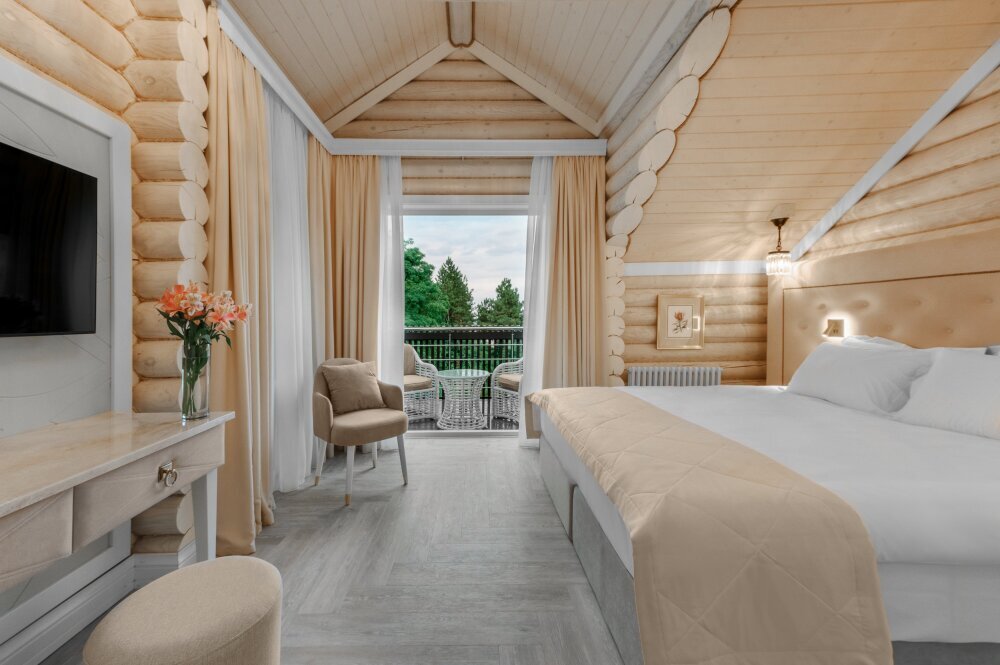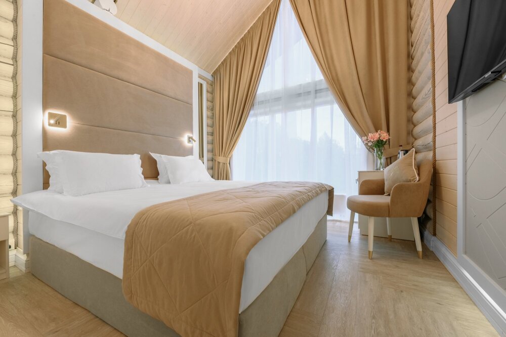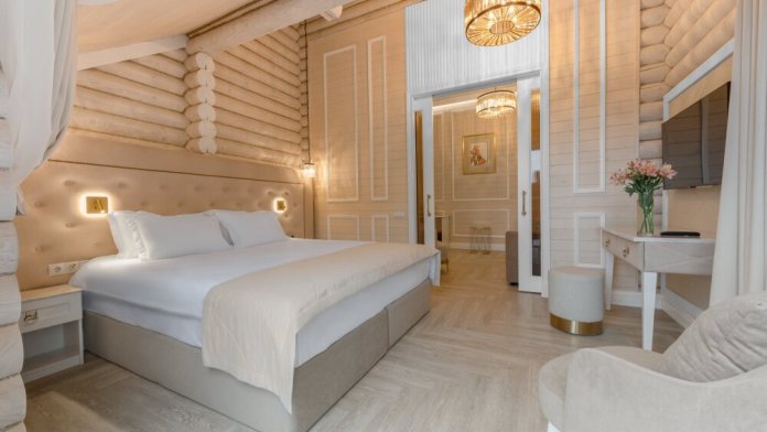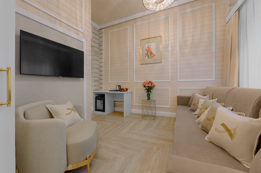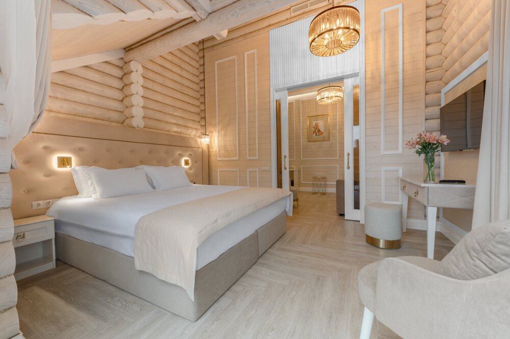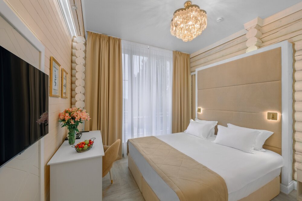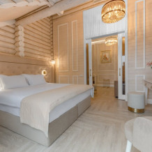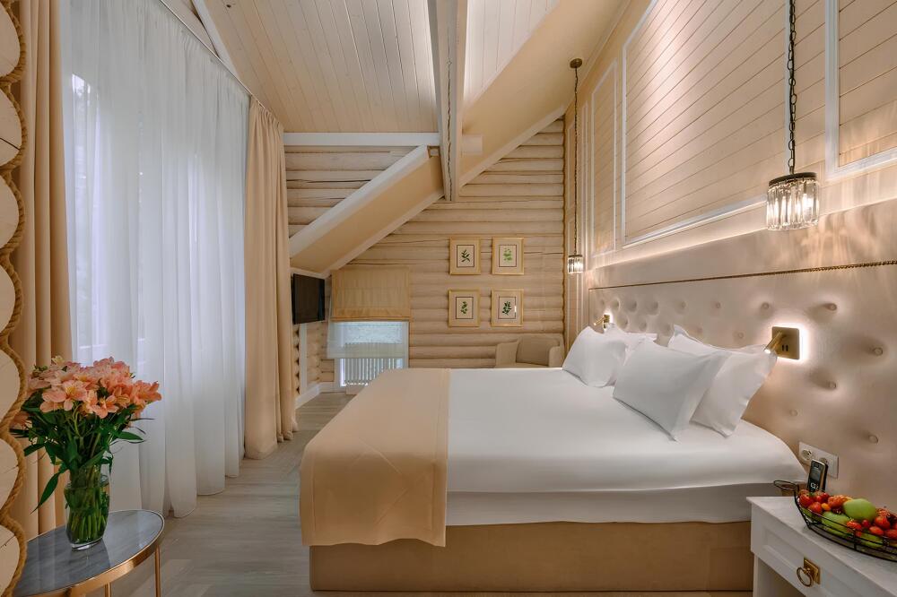 Пятизвездочный бутик-отель – это 17 номеров различных категорий в уникальном дизайне. Ряд номеров выполнен по мотивам швейцарского шале - экологичные материалы, сруб и теплая цветовая гамма. Новые номера - это воплощение и сочетание лучших элементов неоклассического стиля. Высокие потолки, пастельные оттенки, много живого света и простора.
