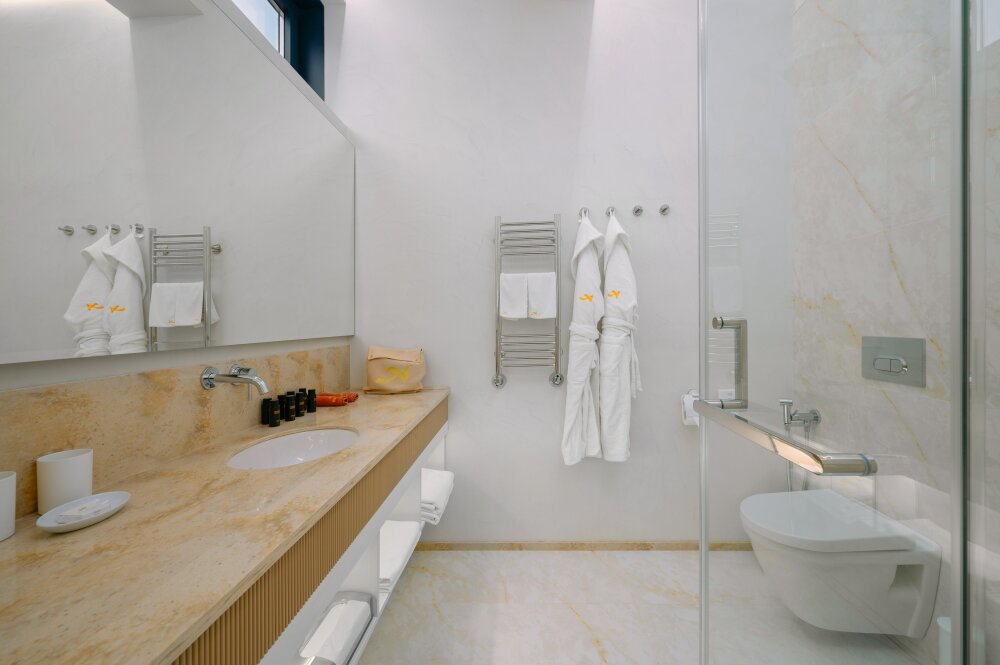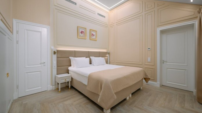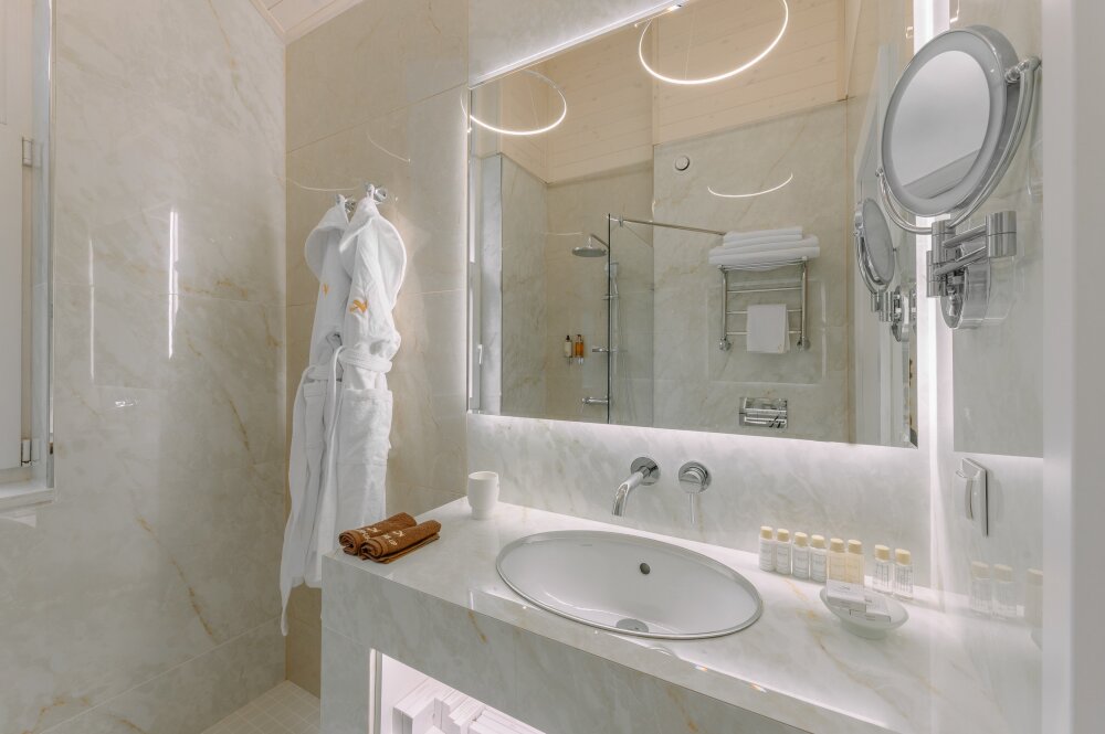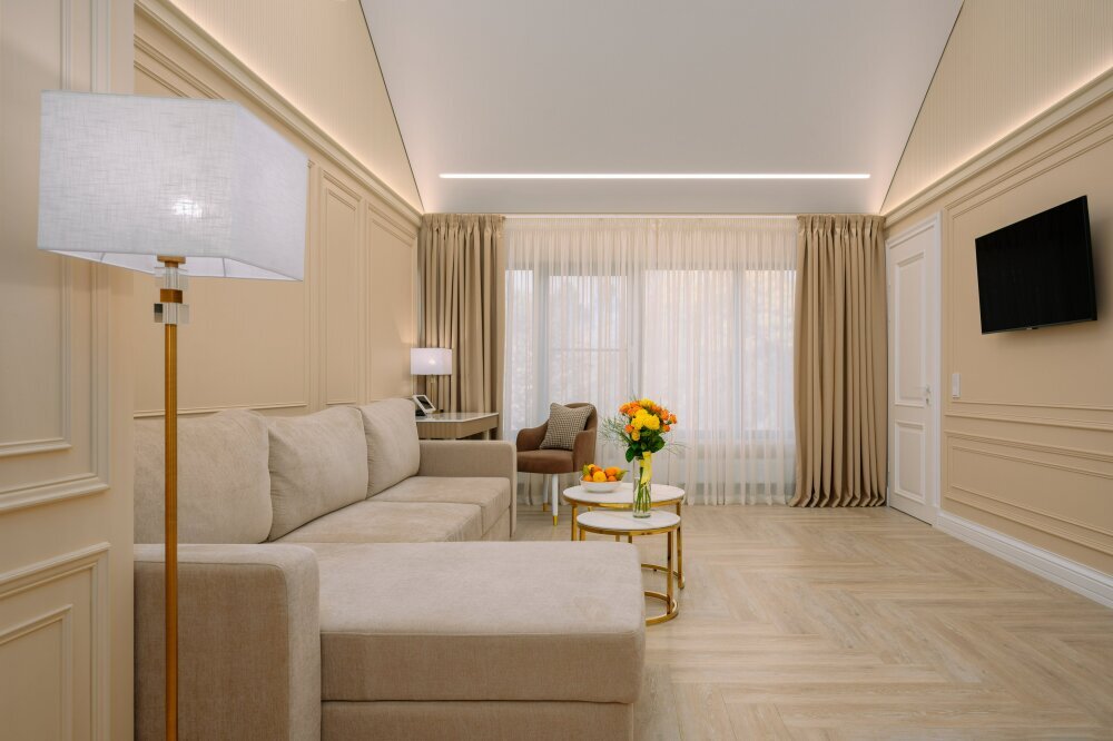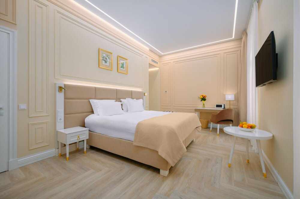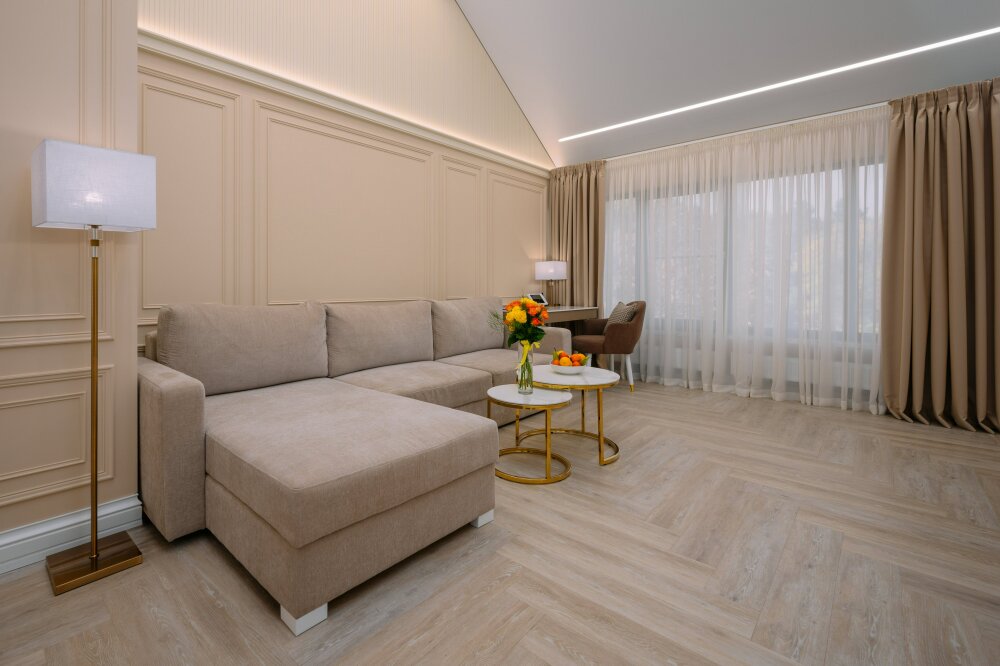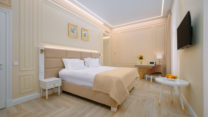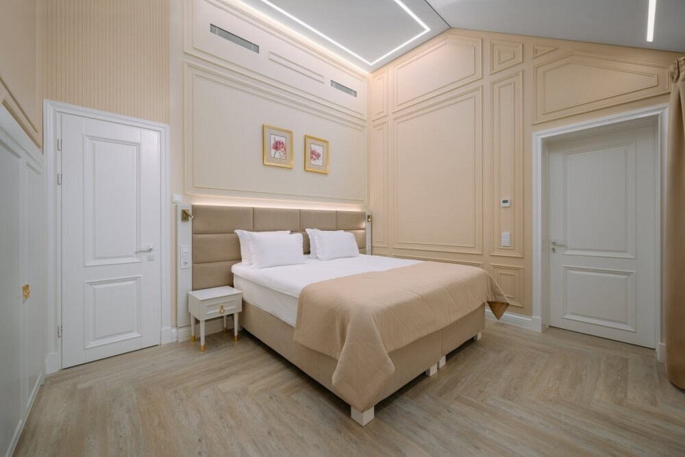 Пятизвездочный бутик-отель – это 17 номеров различных категорий в уникальном дизайне. Ряд номеров выполнен по мотивам швейцарского шале - экологичные материалы, сруб и теплая цветовая гамма. Новые номера - это воплощение и сочетание лучших элементов неоклассического стиля. Высокие потолки, пастельные оттенки, много живого света и простора.