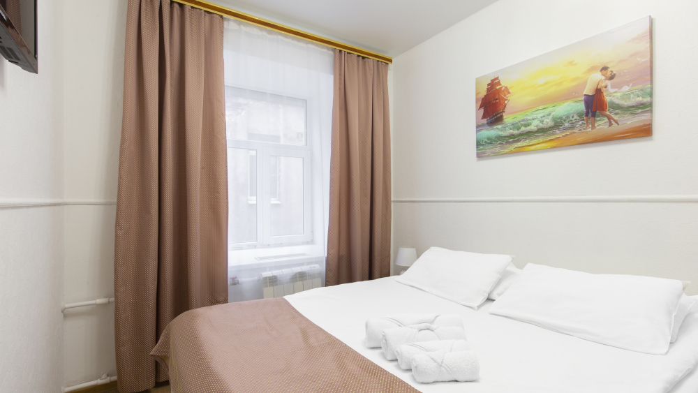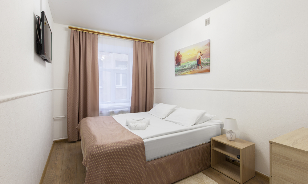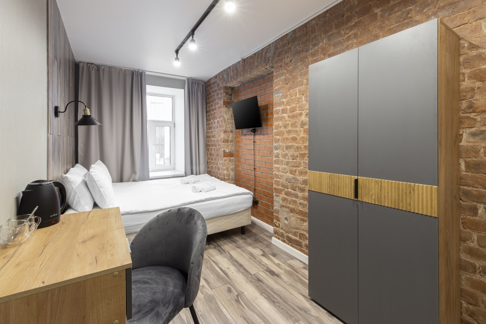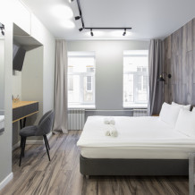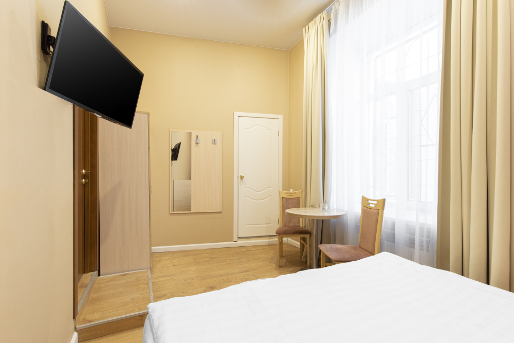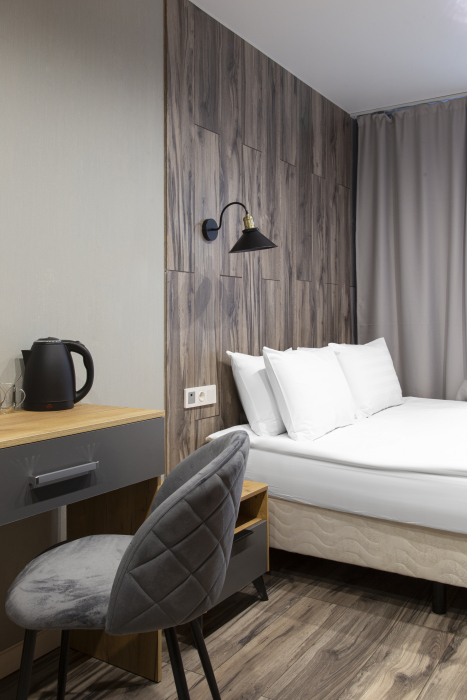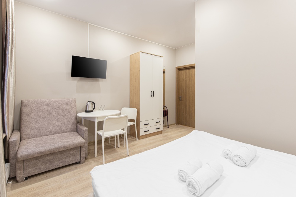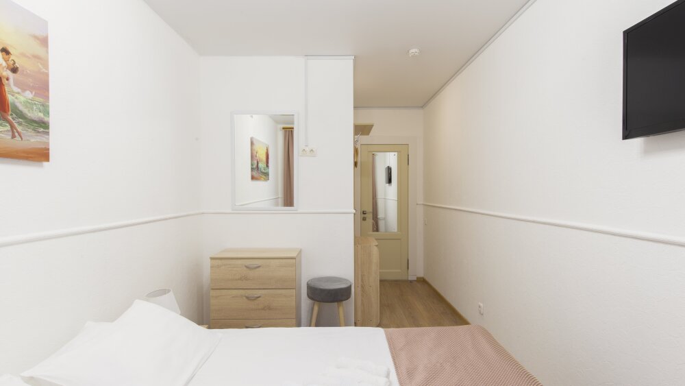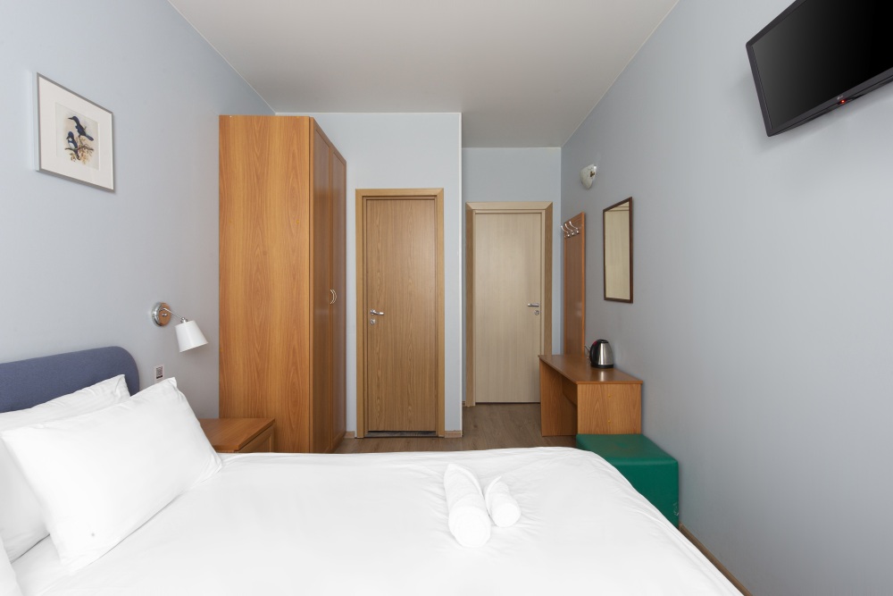 Номер выполнен в светлых тонах, предназначен для проживания одного или двух человек. Номер оснащен всем необходимым для комфортного проживания: удобная двуспальная кровать 160*200 с ортопедическим матрасом, рабочая зона, wi-fi, плазменный ТВ, место для хранения вещей.