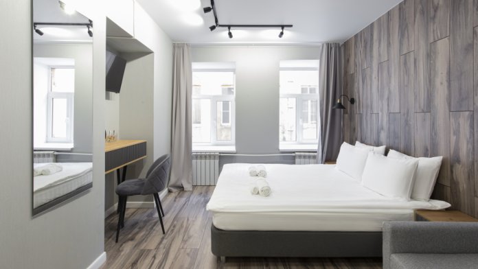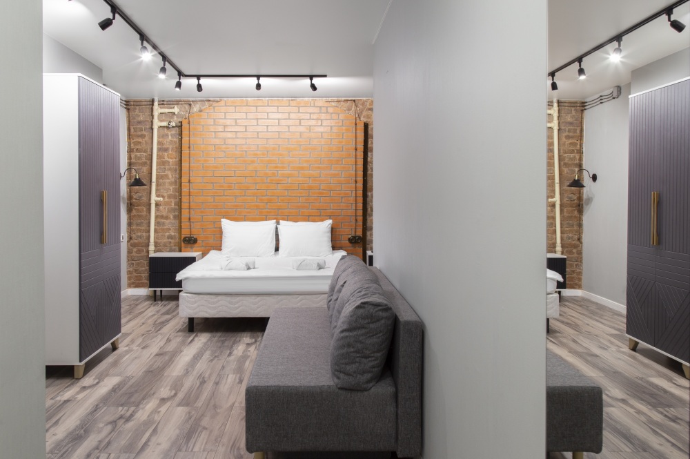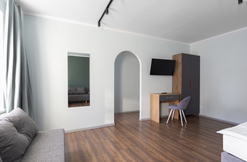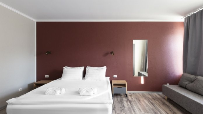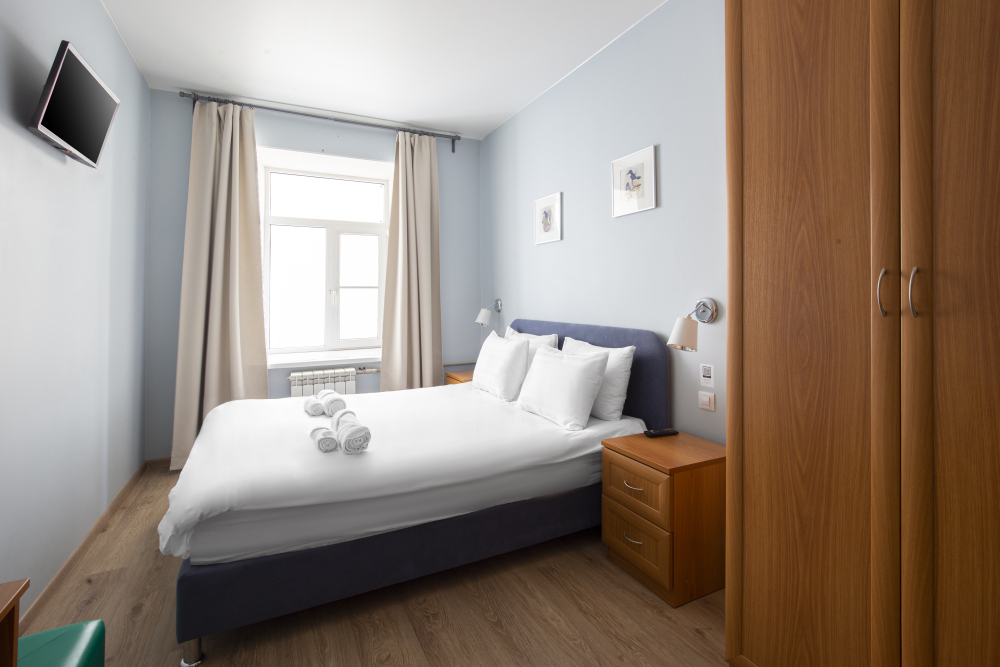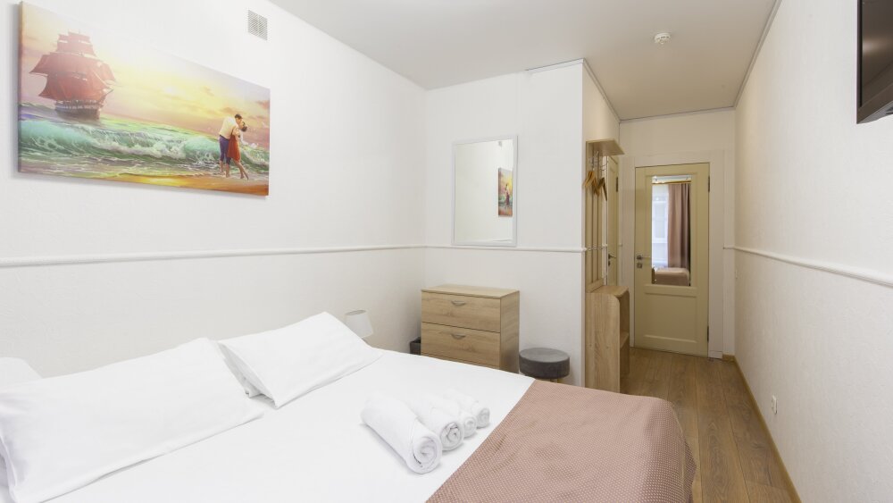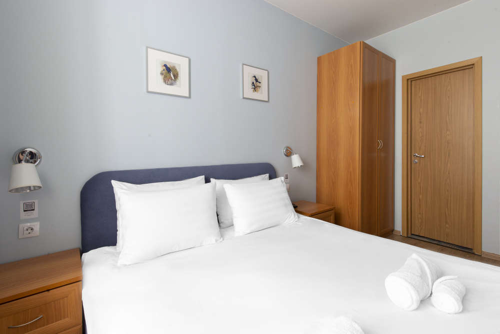 Номер выполнен в светлых тонах, идеально подходит для проживания семьи с детьми. Номер с двуспальной кроватью 160*200 или две односпальные кровати 80*200 с ортопедическим матрасом.