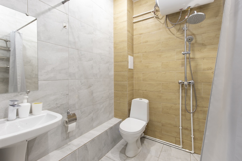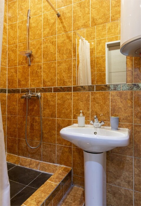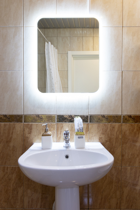 В ванной комнате: душ, тапочки, фен, полотенца, средства личной гигиены.