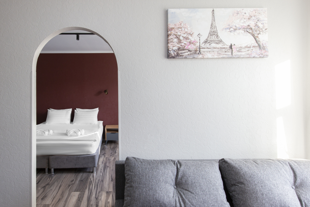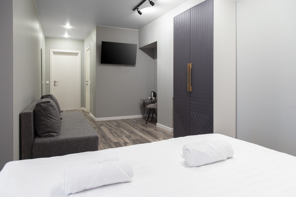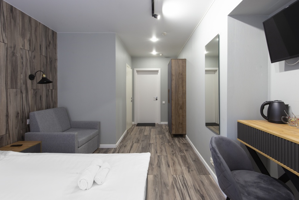 Есть возможность установить дополнительную односпальную кровать 80*200 и детскую кроватку. Номер оснащен всем необходимым для комфортного проживания: рабочая зона, wi-fi, плазменный ТВ, место для хранения вещей, гладильные принадлежности.