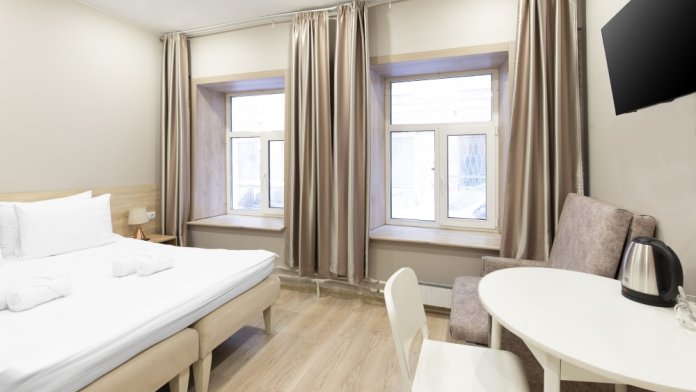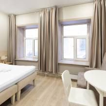 Номер выполнен в светлых тонах, предназначен для проживания одного или двух человек. Номер оснащен всем необходимым для комфортного проживания: удобная двуспальная кровать 160*200 или две односпальные кровати 80*200 с ортопедическим матрасом, рабочая зона, wi-fi, плазменный ТВ, место для хранения вещей.