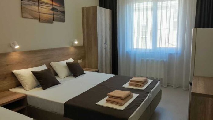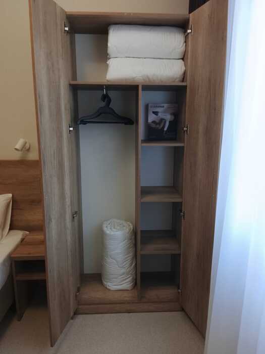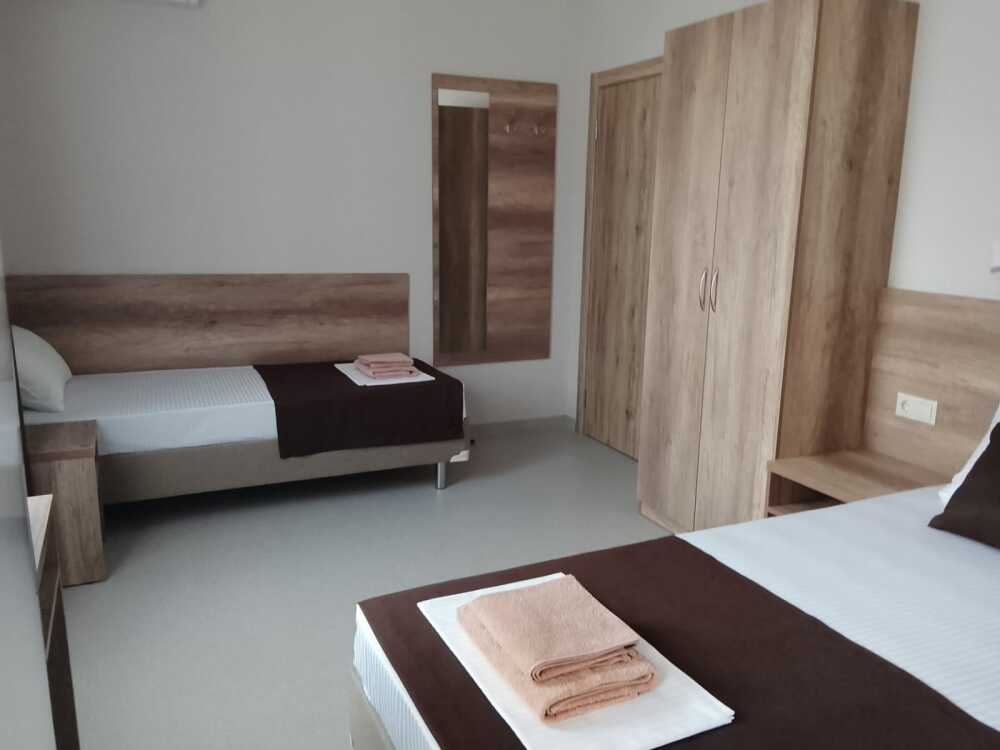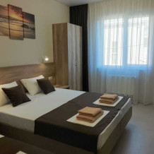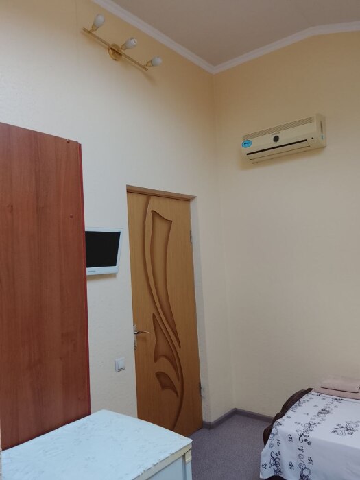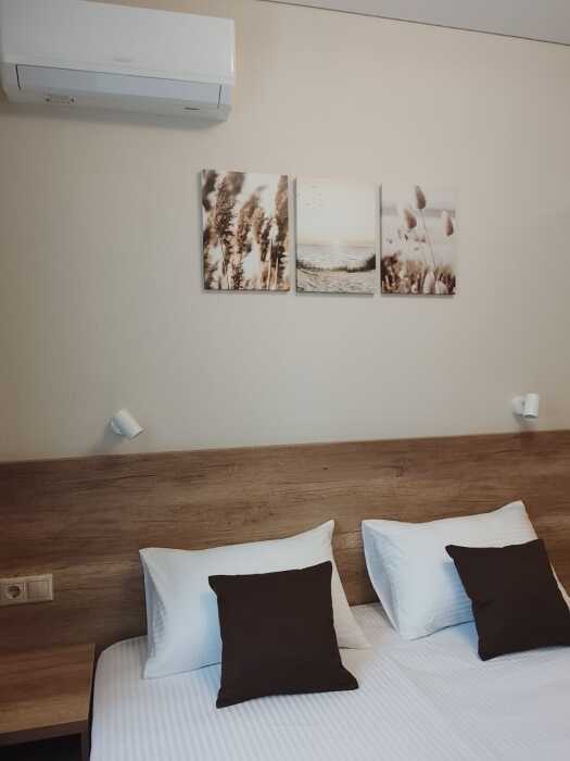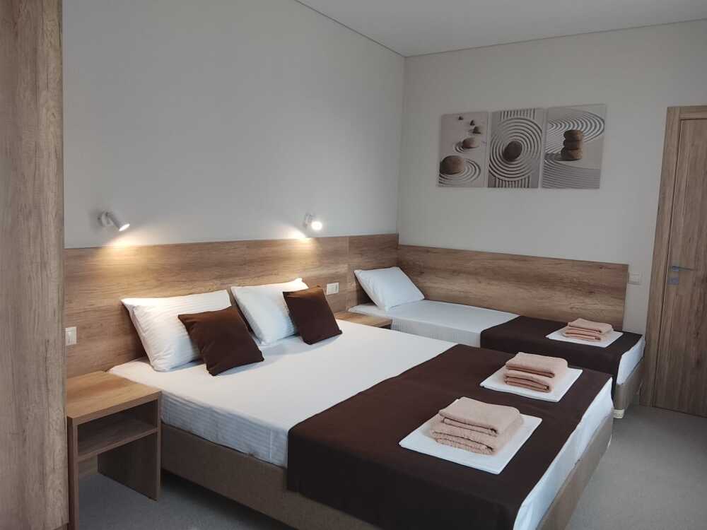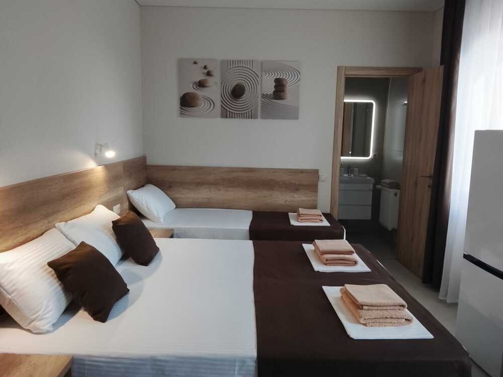 В номере 1 двуспальная и 1 односпальные кровати «бокс спринг», которые можно при желании разъединить, ортопедические матрасы, шкаф для одежды, телевизор, холодильник, сплит-система, прикроватные тумбочки, вешалка с зеркалом, стол, пуфик, фен, полотенца.