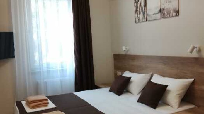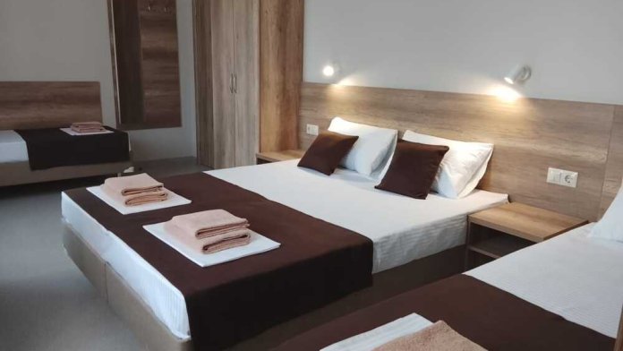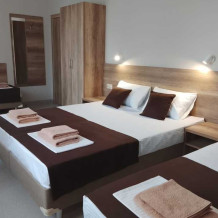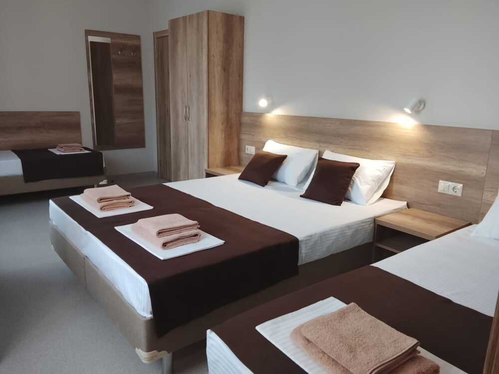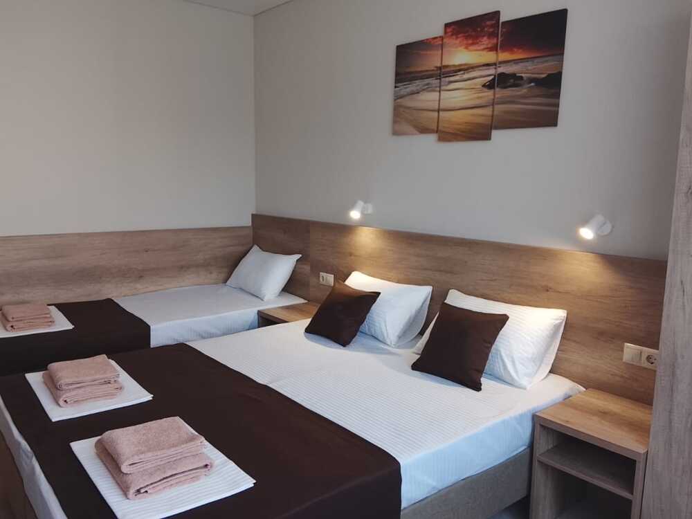 В номере 1 двуспальная и 2 односпальные кровати «бокс спринг», которые можно при желании разъединить, ортопедические матрасы, шкаф для одежды, телевизор, холодильник, сплит-система, прикроватные тумбочки, вешалка с зеркалом, стол, пуфик, фен, полотенца.