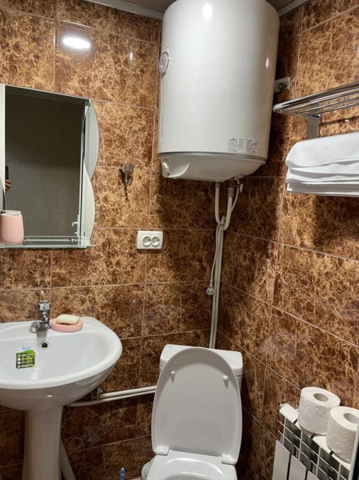Апартаменты-студия зонированы: мини-кухня и гостинная. Оборудование: холодильник, кондиционер, ТВ, интернет Wi-Fi, кабельное/цифровое ТВ, горячая/холодная вода – бесперебойно; фен, утюг, гладильная доска - по запросу, бесплатно; оборудованная мини-кухня: кухонный гарнитур, электро-печь, посуда, постельное белье, полотенца; стиральная машина. Удобства: санузел - душ, унитаз, умывальник.