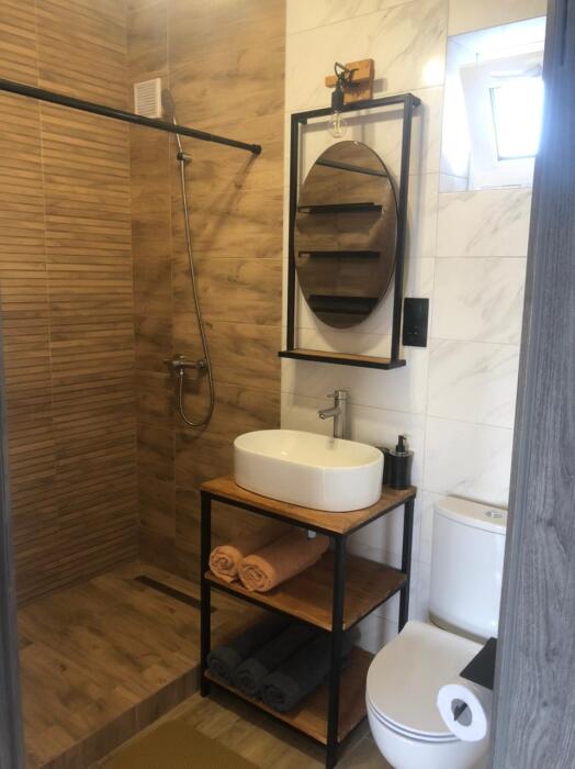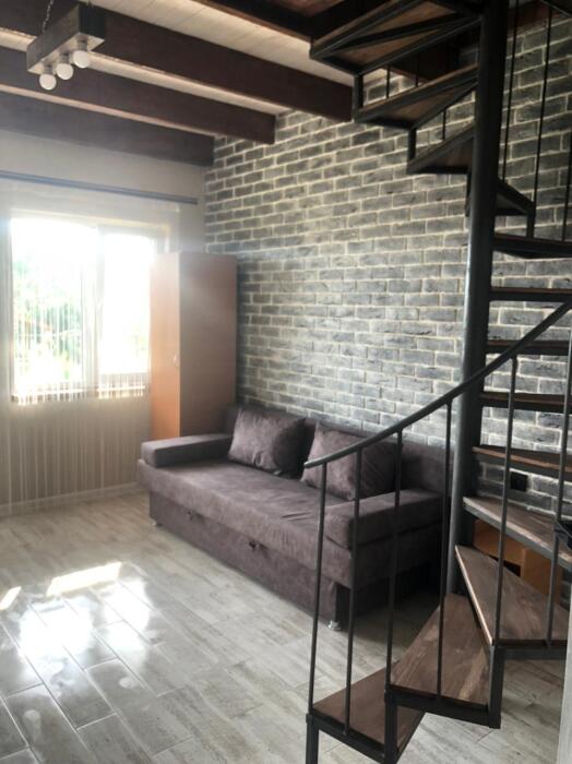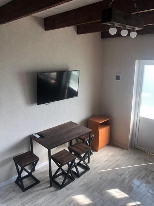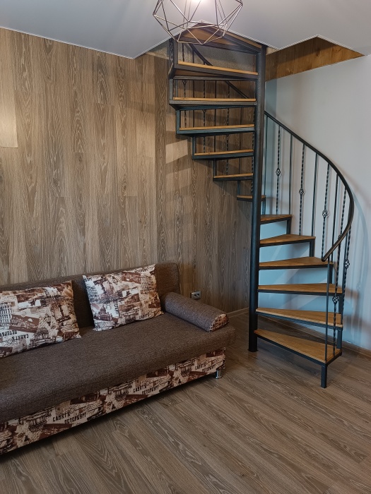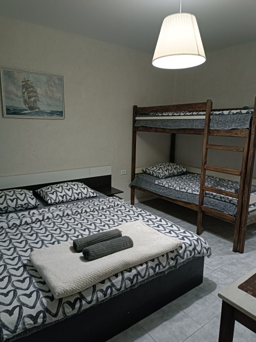 Двухуровневый номер, 1 этаж -гостиная совмещена с кухней и отдельно санузел, 2 этаж -две изолированные спальни и балкон,6 спальных мест, возможность доп. места.