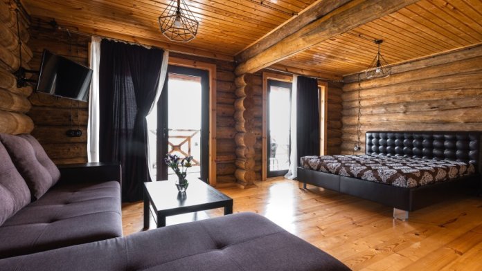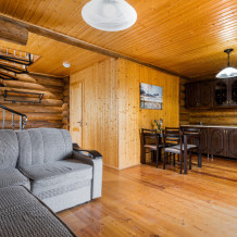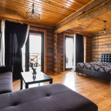 Номера повышенной комфортности представлены из деревянного сруба. Просторный однокомнатный номер визуально поделен на две функциональные зоны: гостиную и спальню.