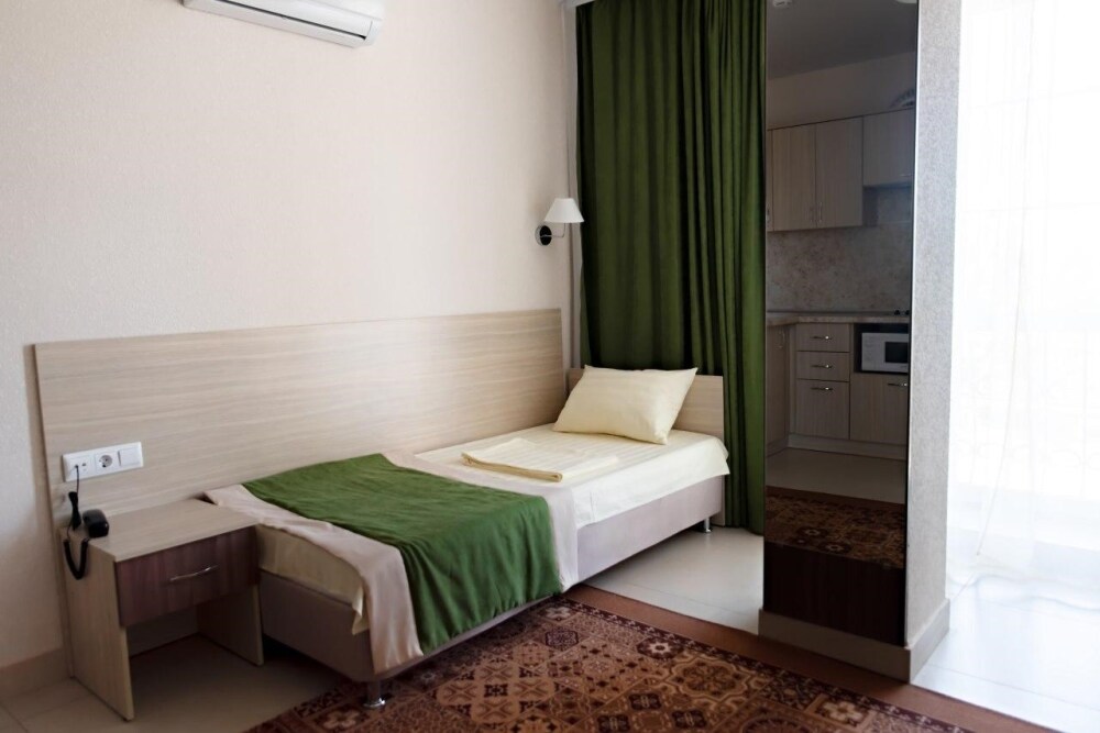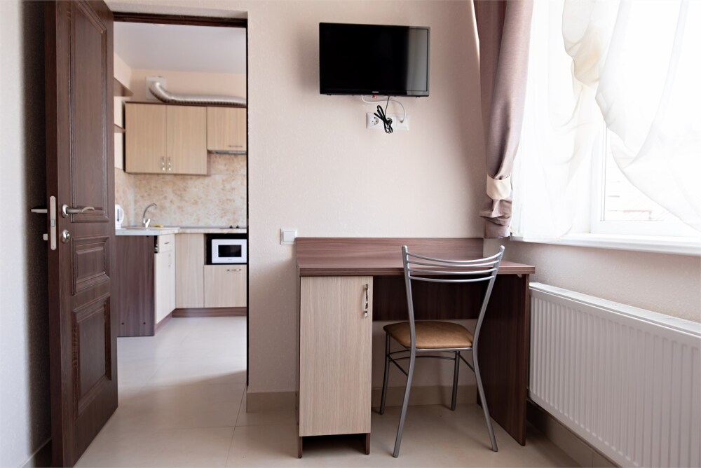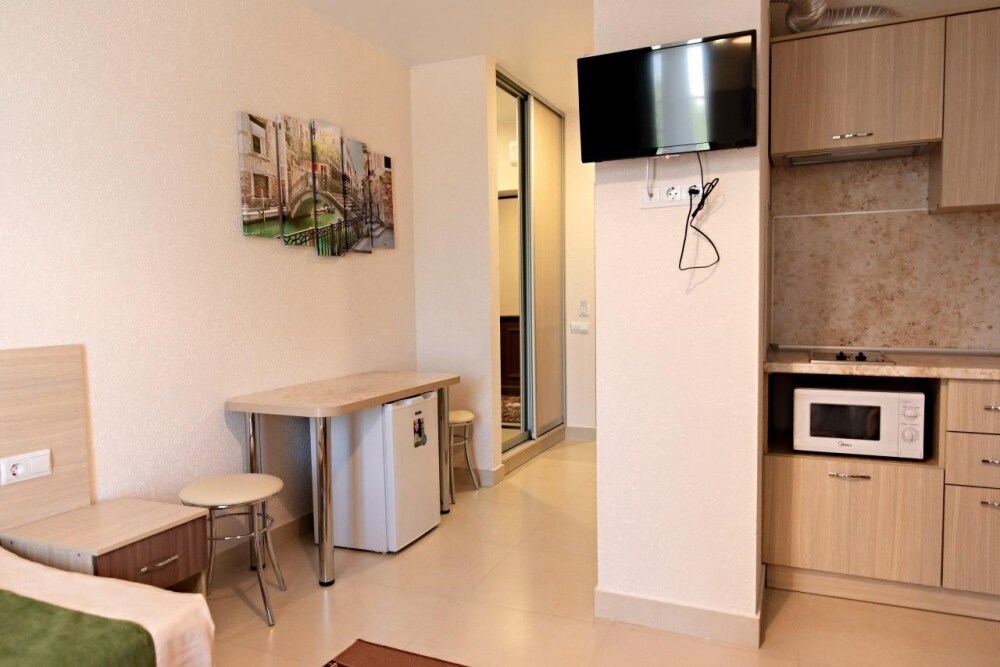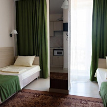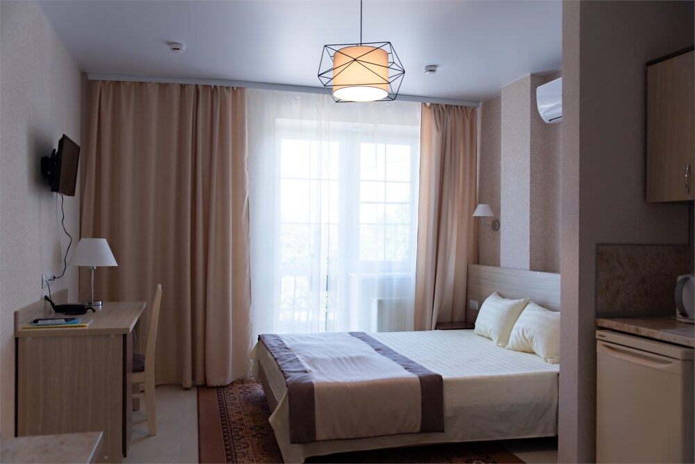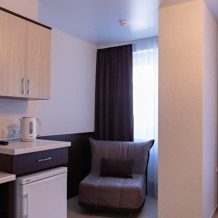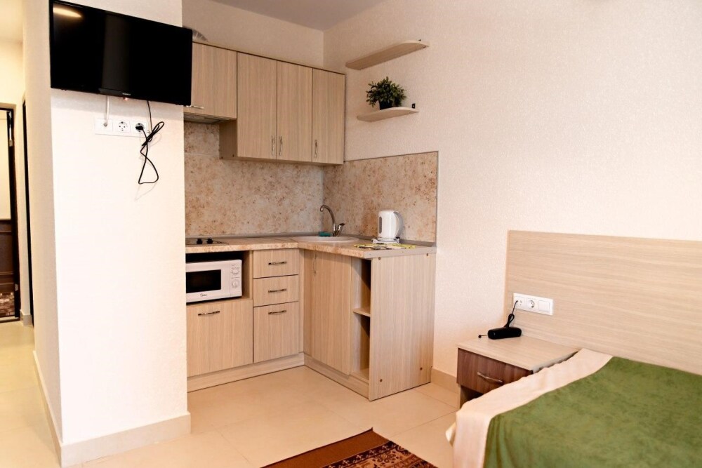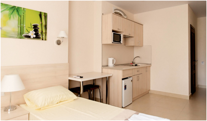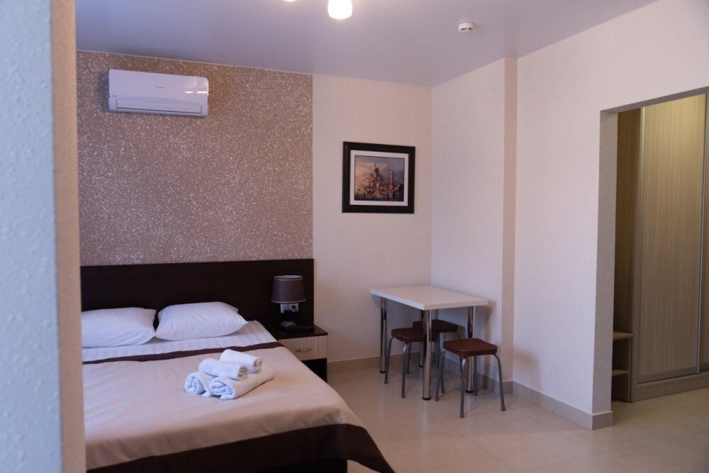 В наличии различные виды номеров: номера-студио, одноместные, двухместные, семейные номера. Номера оснащены холодильником, электрической и микроволновой печами, чайником и всей необходимой посудой. В каждом номере отдельный санузел, туалетные принадлежности входят в стоимость проживания, в номере имеется телевизор и городской телефон, очень удобные кровати, шкаф и письменный стол, Вы сможете отдохнуть и, если нужно, поработать, будете чувствовать себя, как дома. Wi-Fi и парковка предоставляются бесплатно.