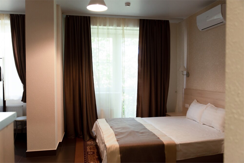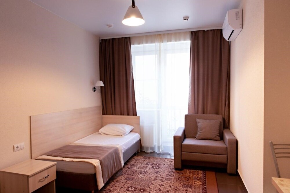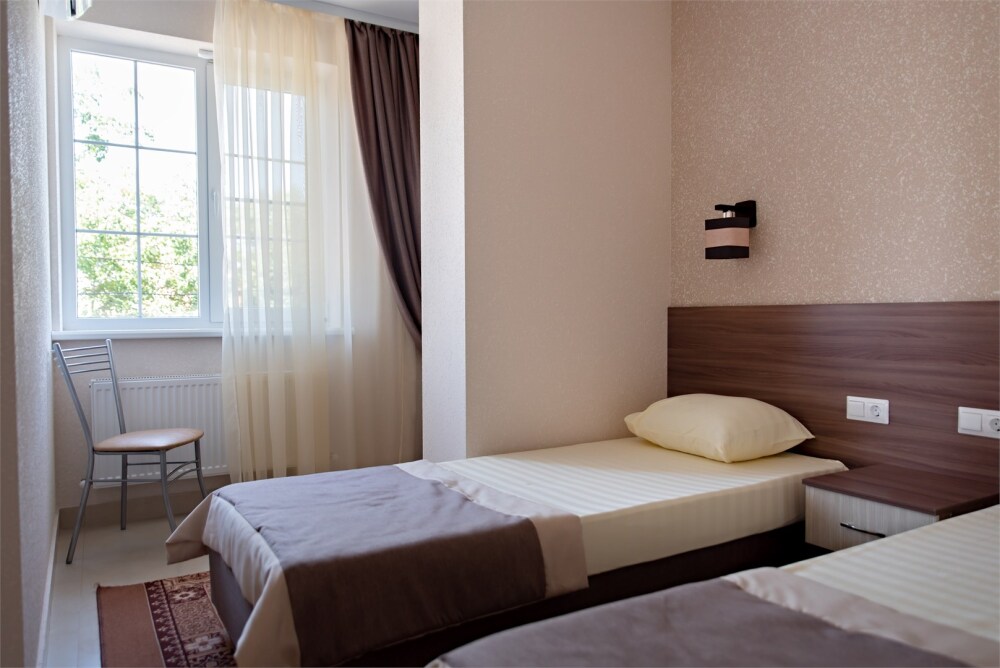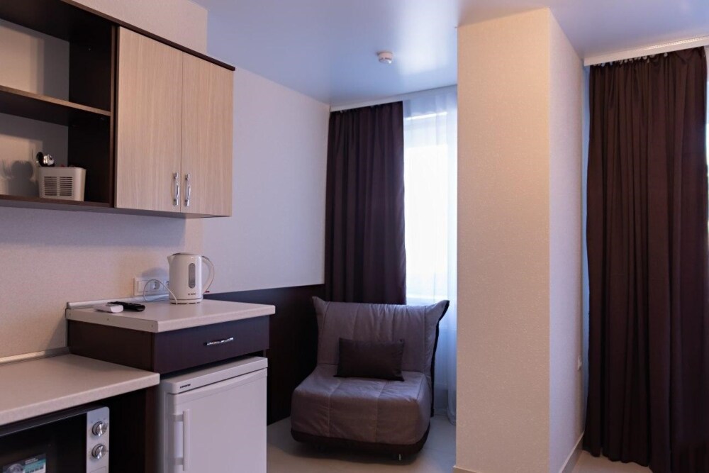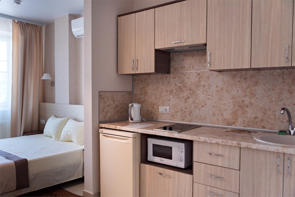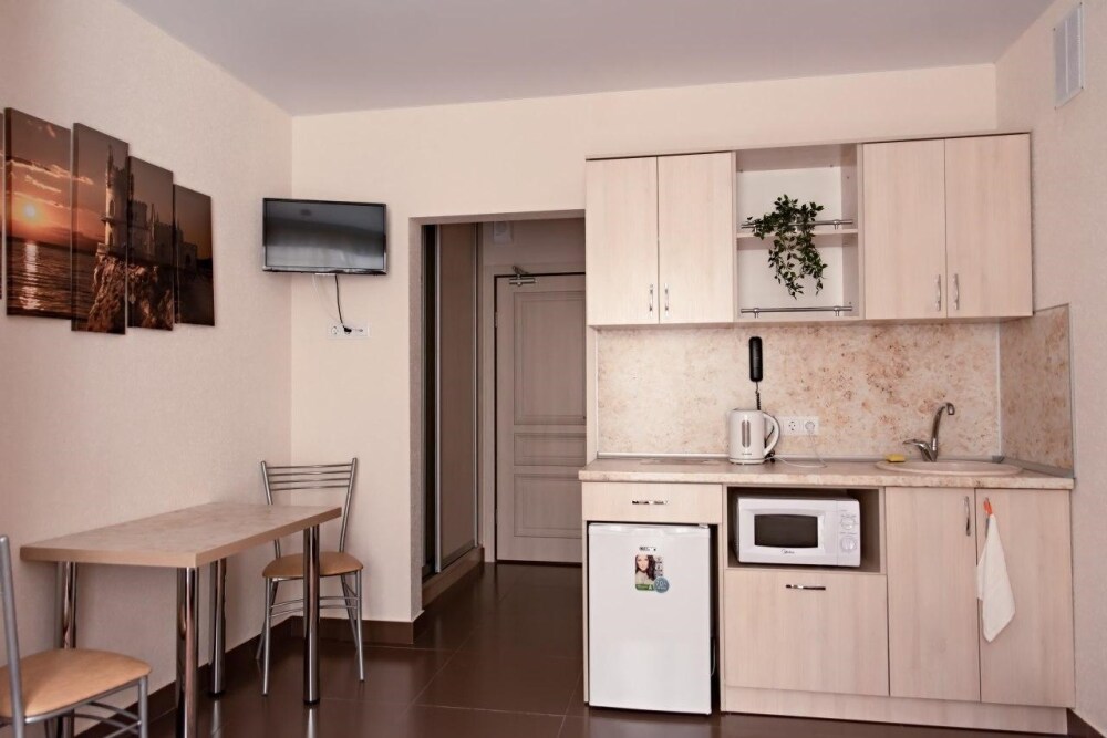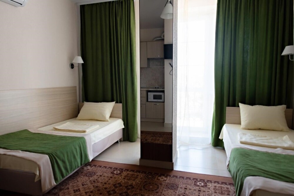 В наличии различные виды номеров: номера-студио, одноместные, двухместные, семейные номера. Номера оснащены холодильником, электрической и микроволновой печами, чайником и всей необходимой посудой. В каждом номере отдельный санузел, туалетные принадлежности входят в стоимость проживания, в номере имеется телевизор и городской телефон, очень удобные кровати, шкаф и письменный стол, Вы сможете отдохнуть и, если нужно, поработать, будете чувствовать себя, как дома. Wi-Fi и парковка предоставляются бесплатно.