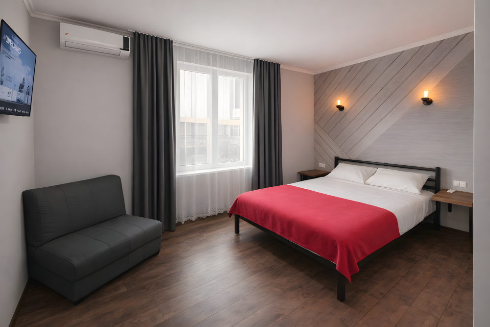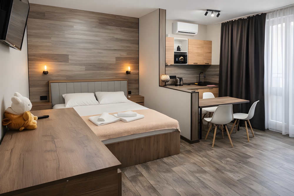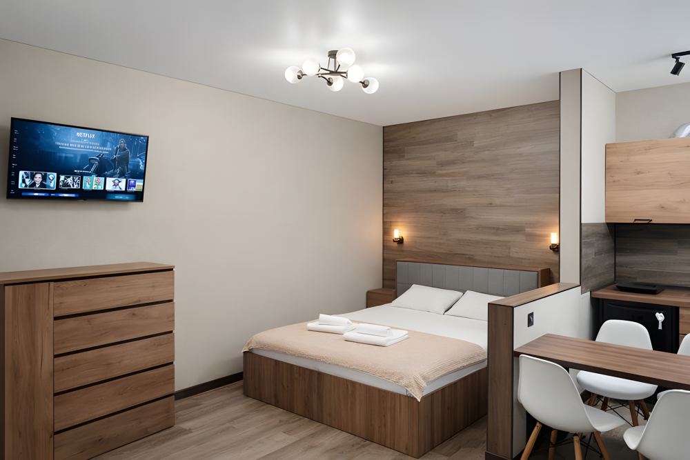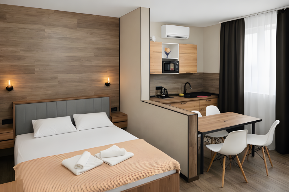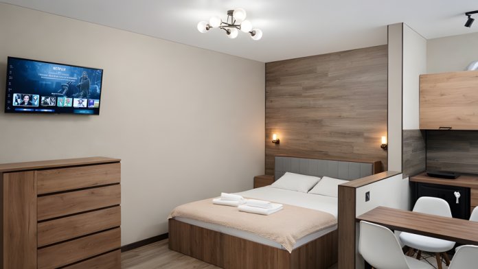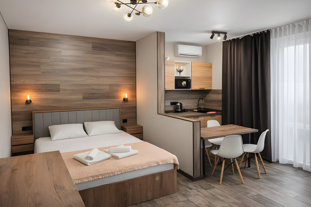 Просторный номер 30-35 м², с собственной кухней. Рассчитан на размещение до 5 гостей. Оптимален для семьи с детьми или длительного проживания.