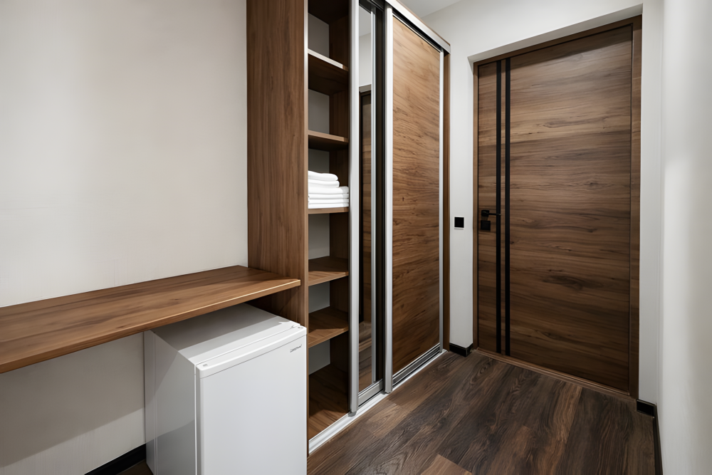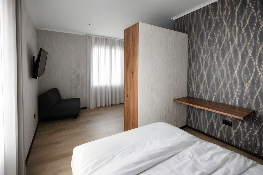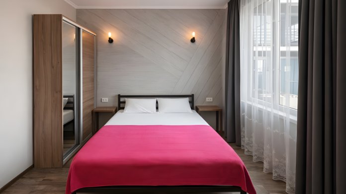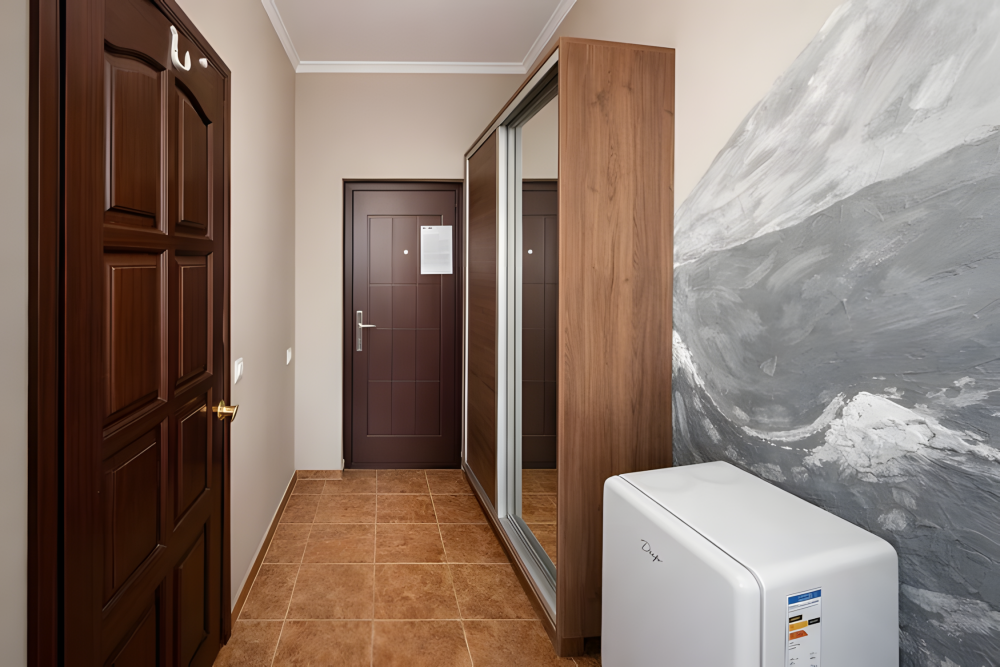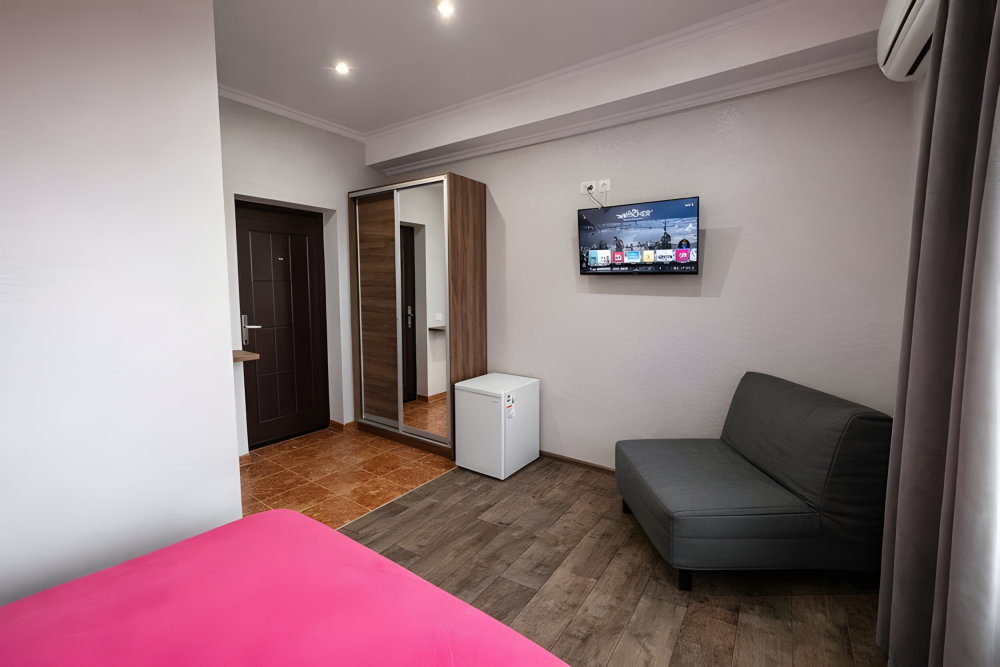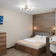 Однокомнатный номер площадью 18 м², рассчитан на размещение 2–3 гостей. Подходит для пары или семьи с ребенком.
