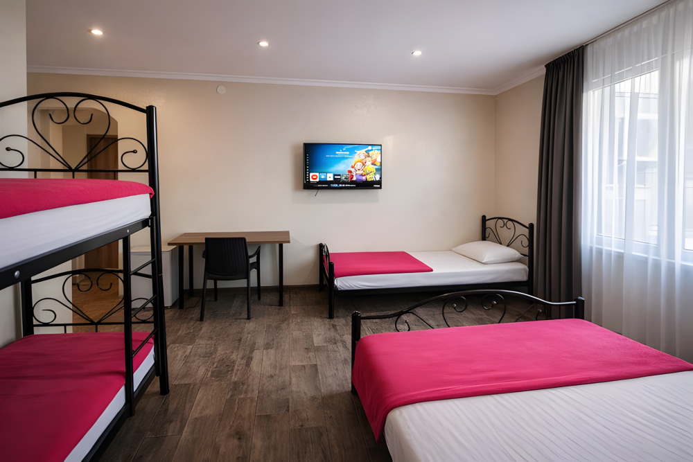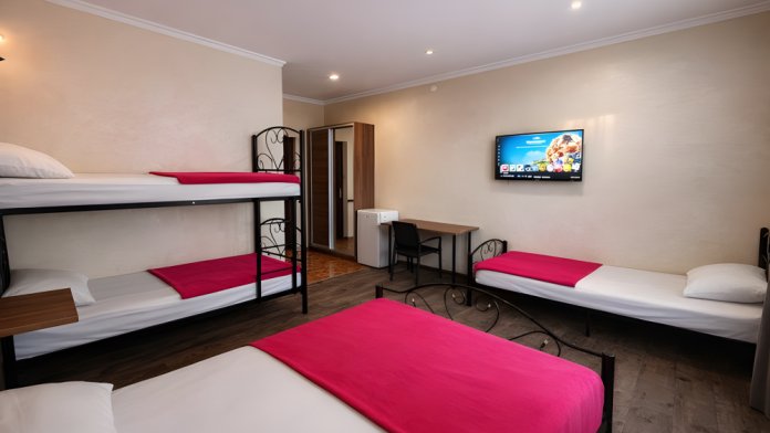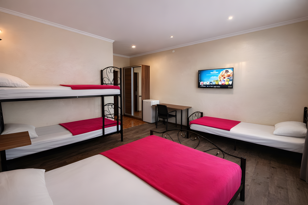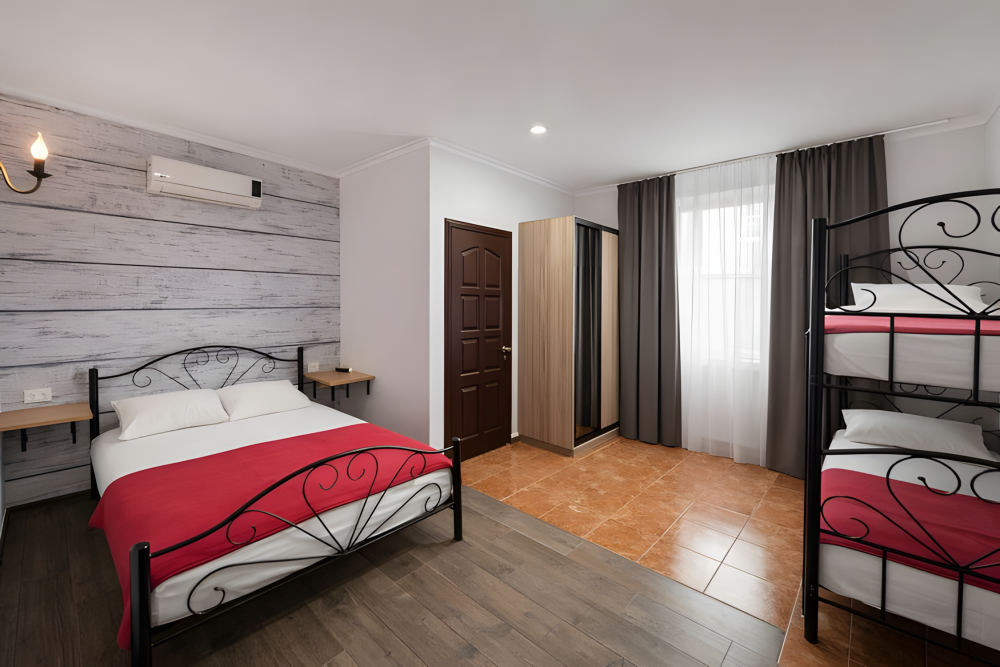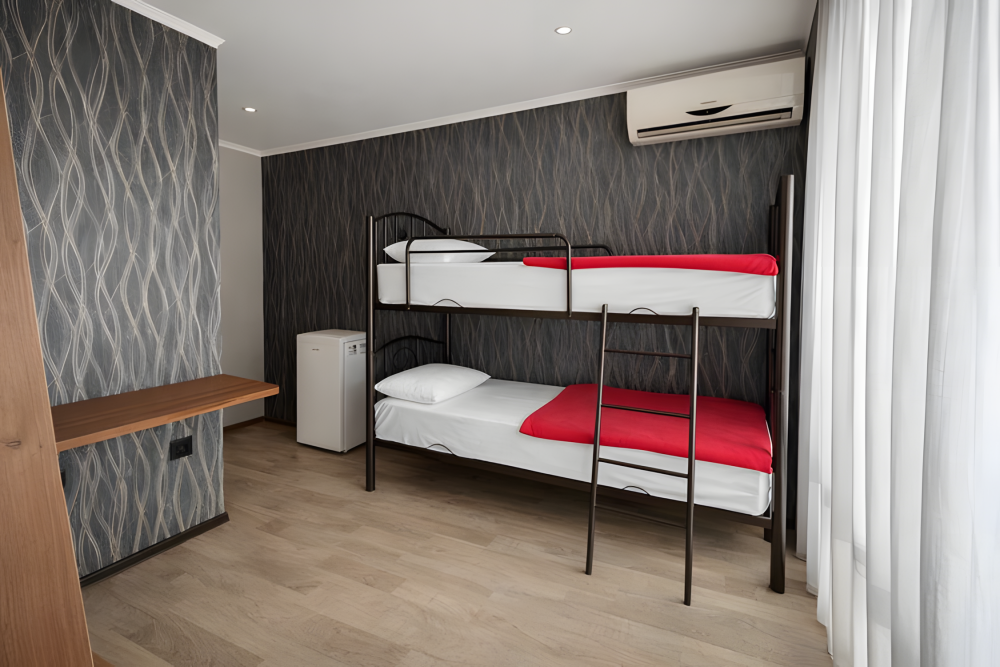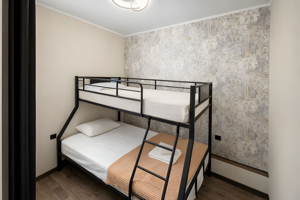 Варианты размещения: двуспальная кровать, двухъярусная кровать, и дополнительно спальное место.