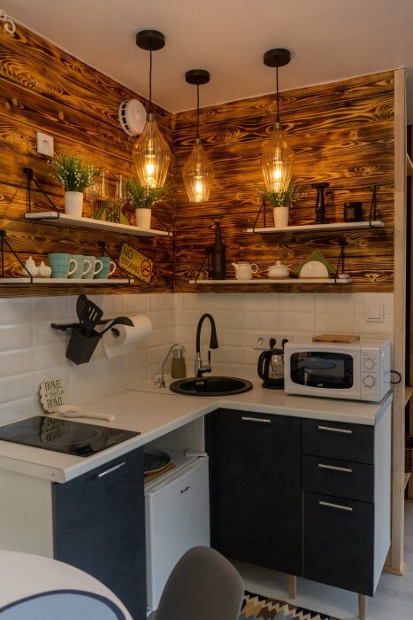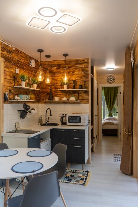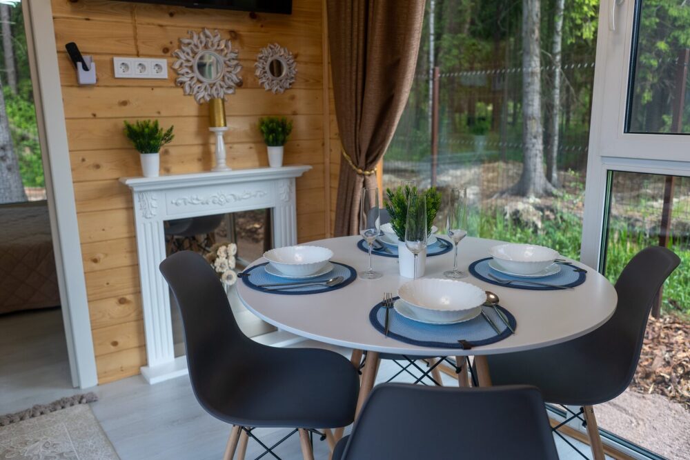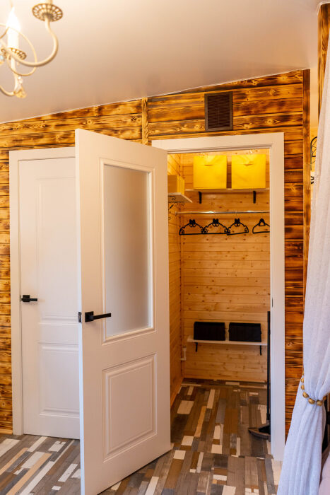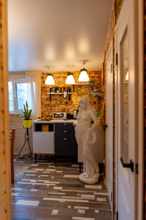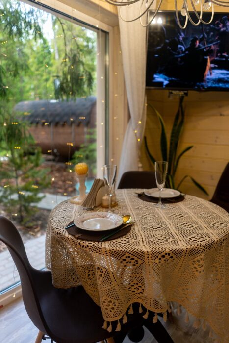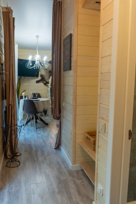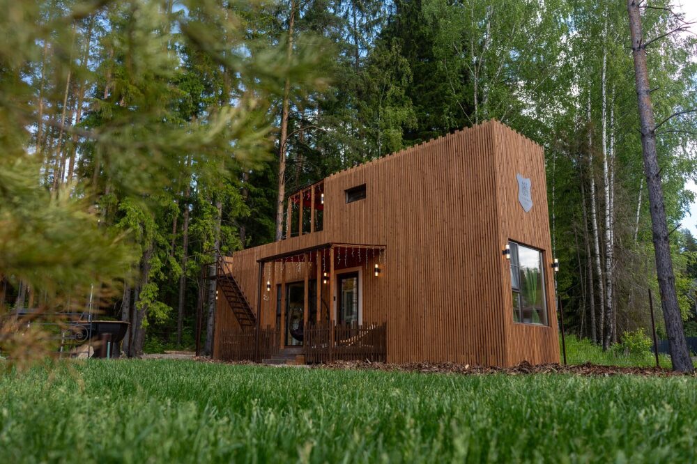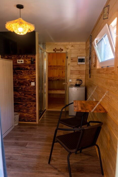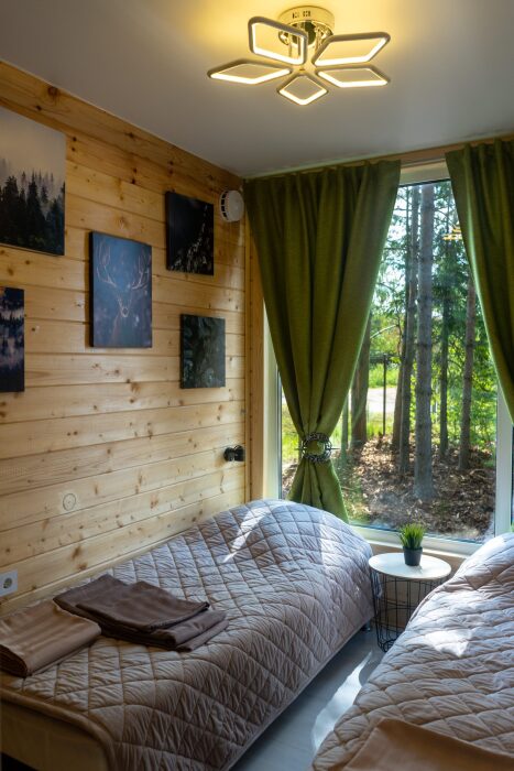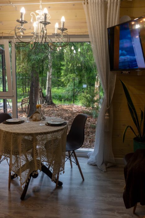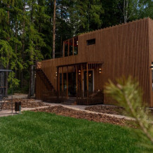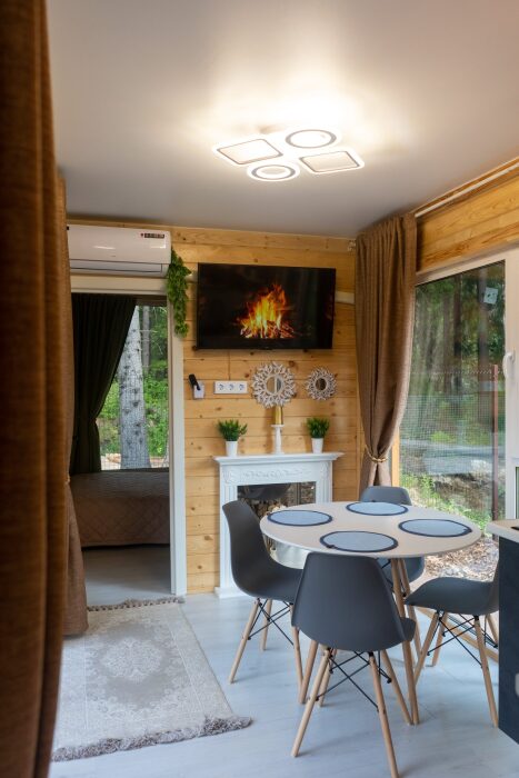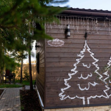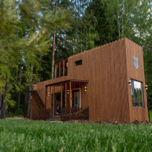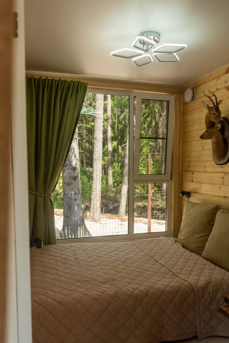 Коттедж для 3 гостей (2 взрослых + ребёнок), спальня, просторная кухня-гостиная, санузел с душем. Большие панорамные окна. В доме есть все необходимое для проживания: новая мебель и техника, посуда. В каждой комнате и санузле теплые полы. Wi-fi, каналы от ivi и кинопоказ.