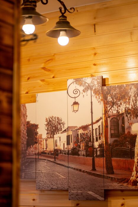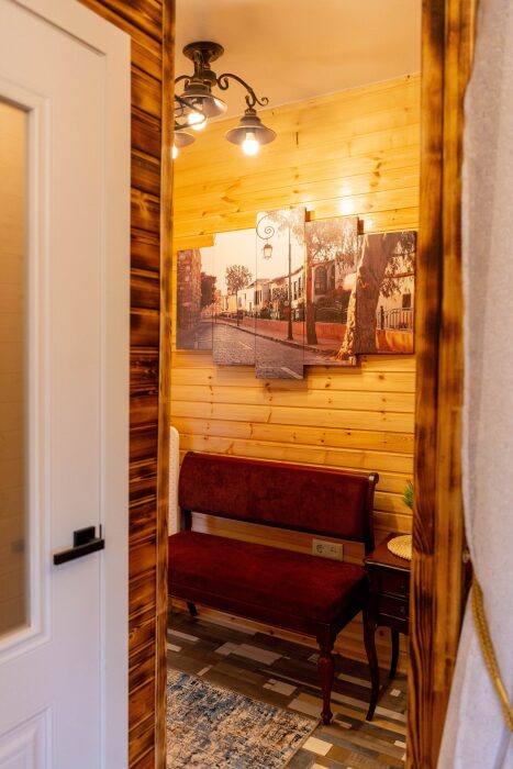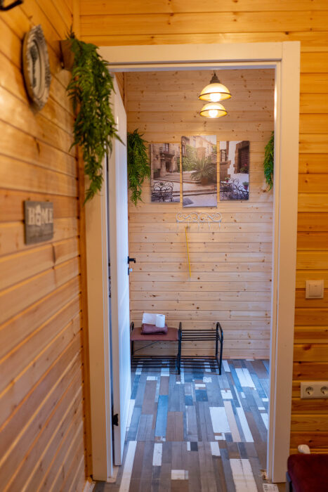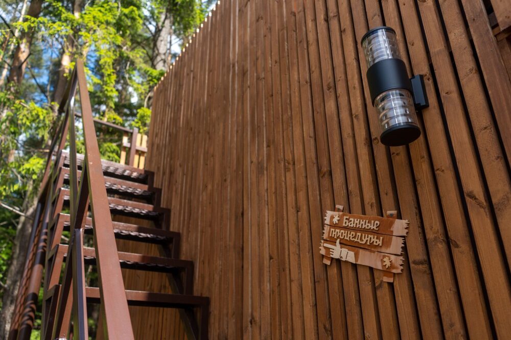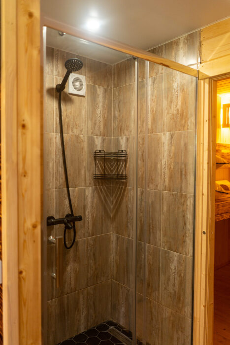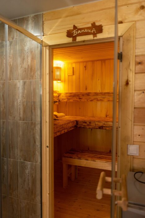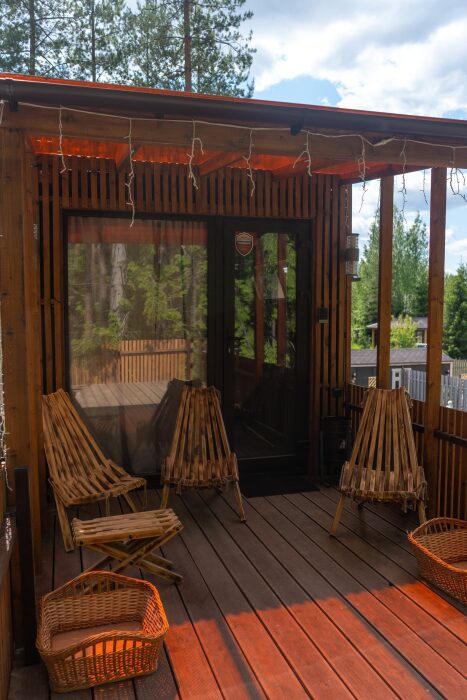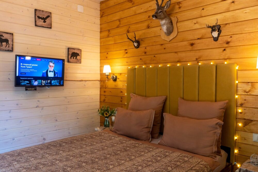 На втором этаже: банный комплекс с комнатой отдыха с панорамным окном (она же и комната для проживания 2-х человек с двуспальной кроватью), Wi-fi, Яндекс SMART-TV, холодильник, душевая и конечно сама БАНЯ (отдельная опция). Туалет только на 1-м этаже.