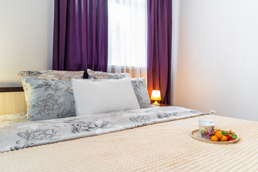 - а также: постельное белье, полотенца, ванные принадлежности, кофе, чай, микроволновая печь, фен.