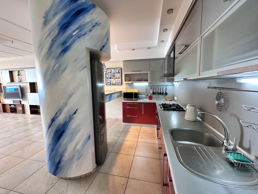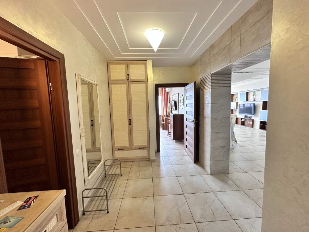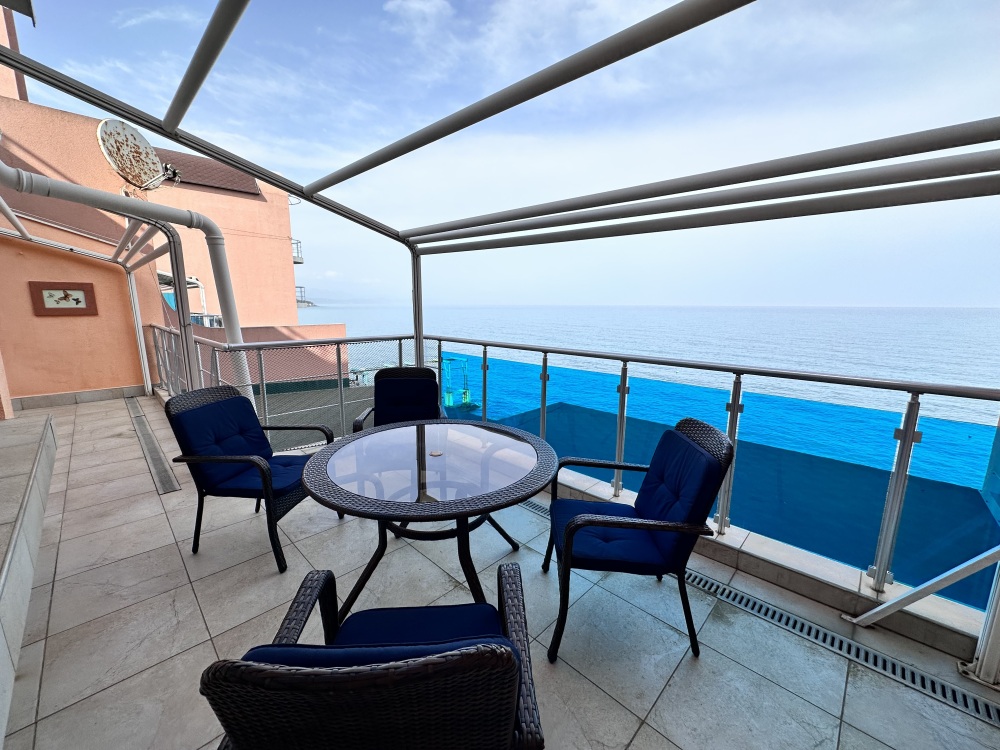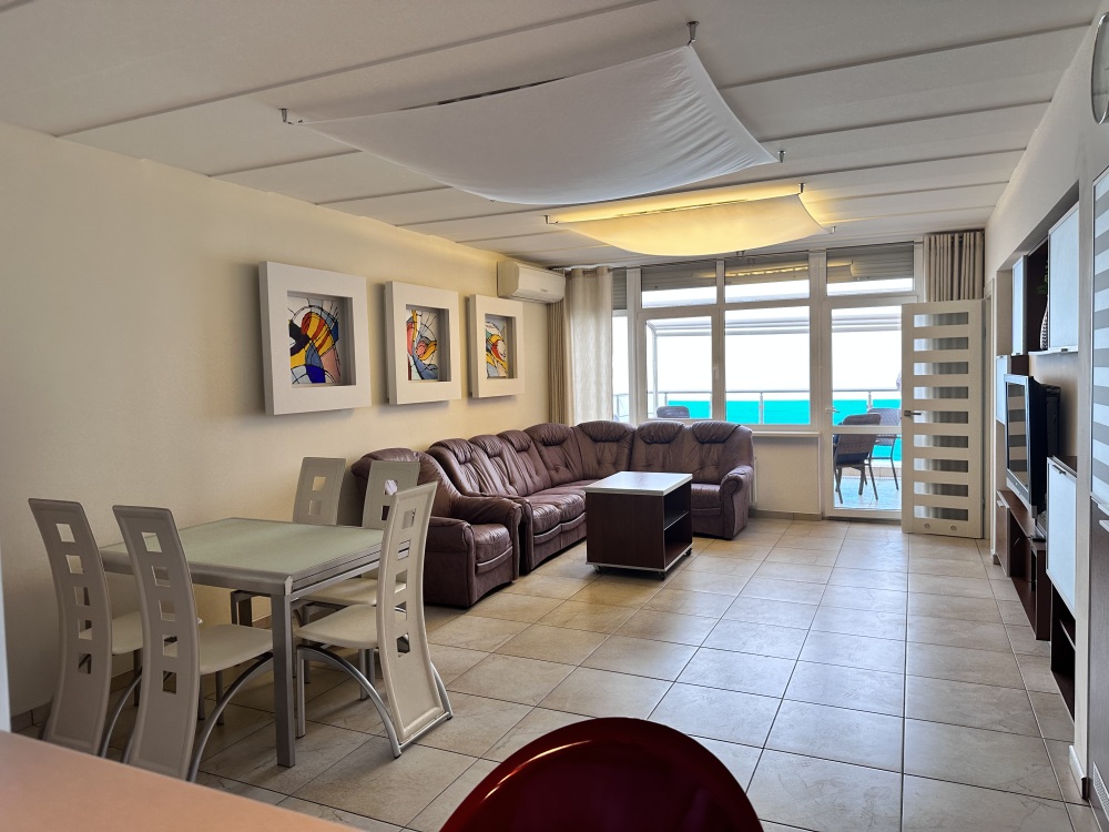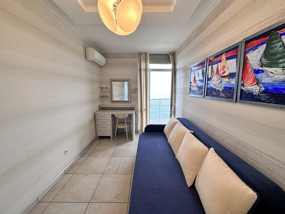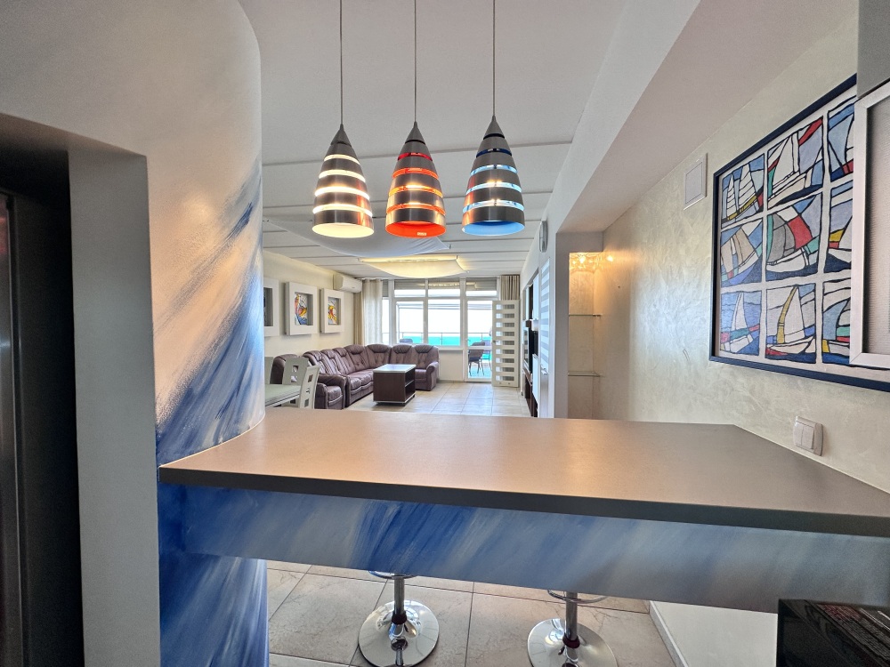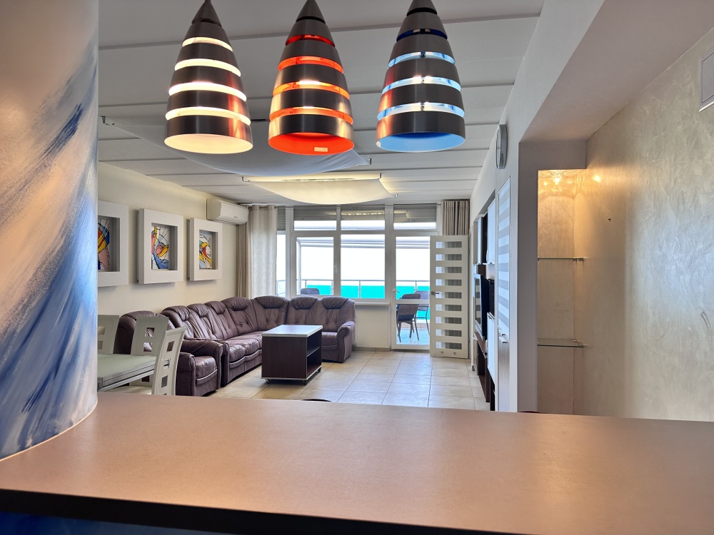 Апартаменты расположены на пятом этаже, поэтому из них Вы сможете любоваться панорамными видами на море. Планировка включает: две спальные комнаты (одна спальня с двуспальной кроватью, вторая – с раскладывающимся диваном), два совмещенных санузла (один из них в спальне); кухню-гостиную с угловым диваном (раскладывается) обеденным столом и барной стойкой; просторную лоджию площадью 35 кв.м., которая станет для Вас классной лаундж-зоной, где Вы сможете наслаждаться морским бризом в полном спокойствии и тишине. Установлены автоматические роллеты. В апартаменте выполнен качественный ремонт, оснащён хорошей мебелью и техникой. Коммуникации: электричество, вода, канализация. Установлена система теплый пол.