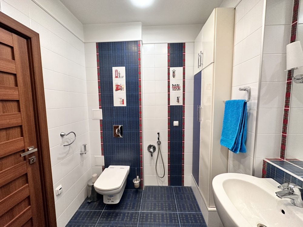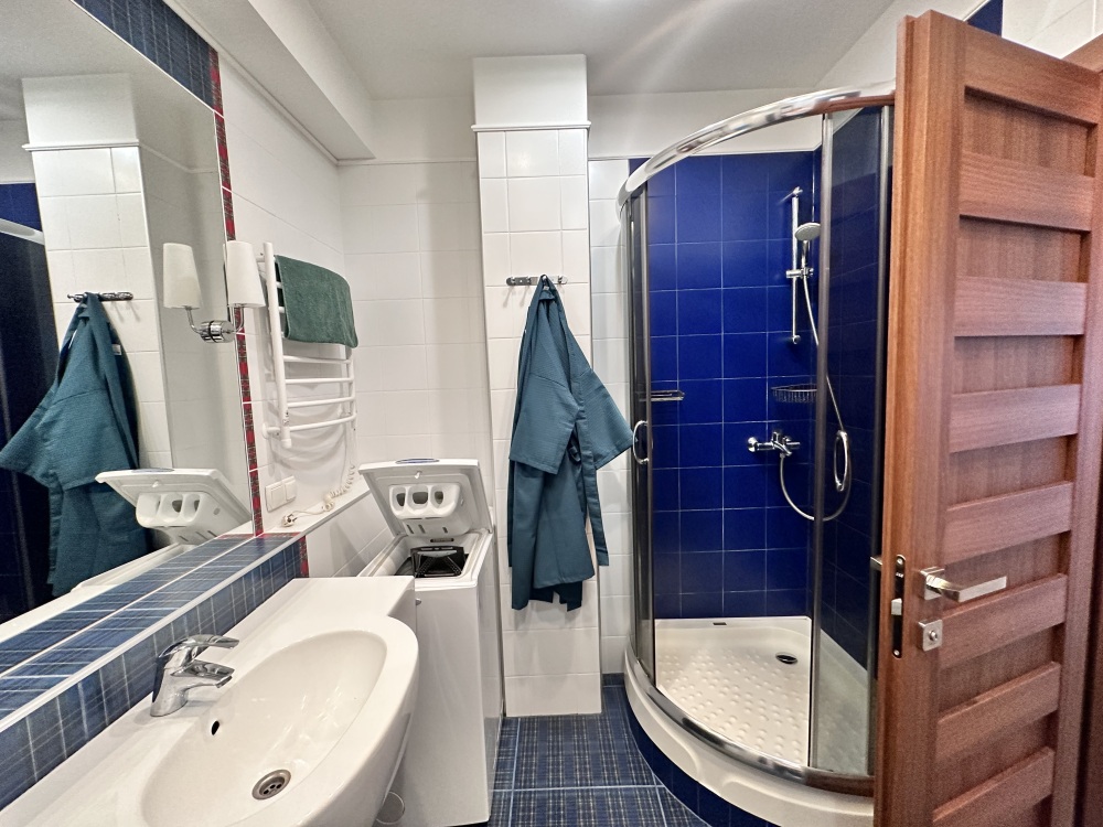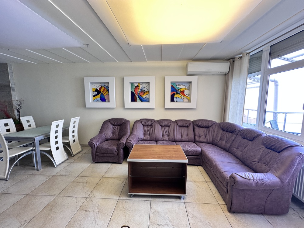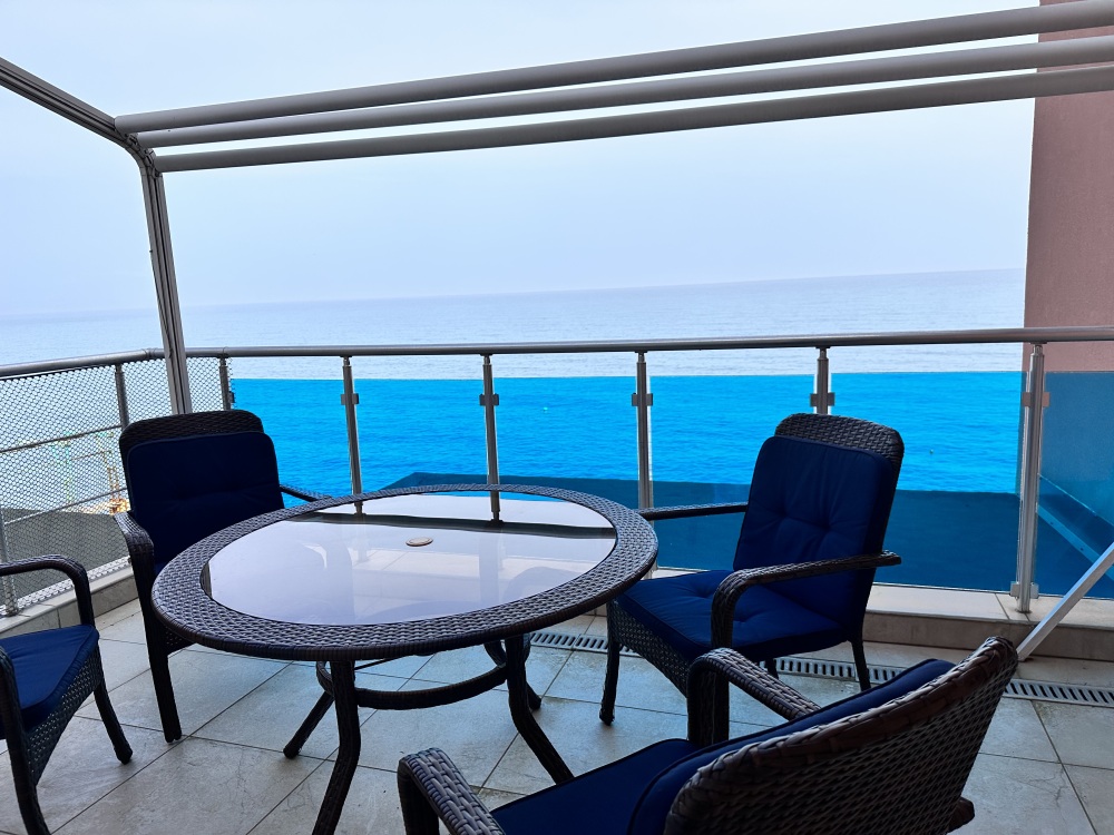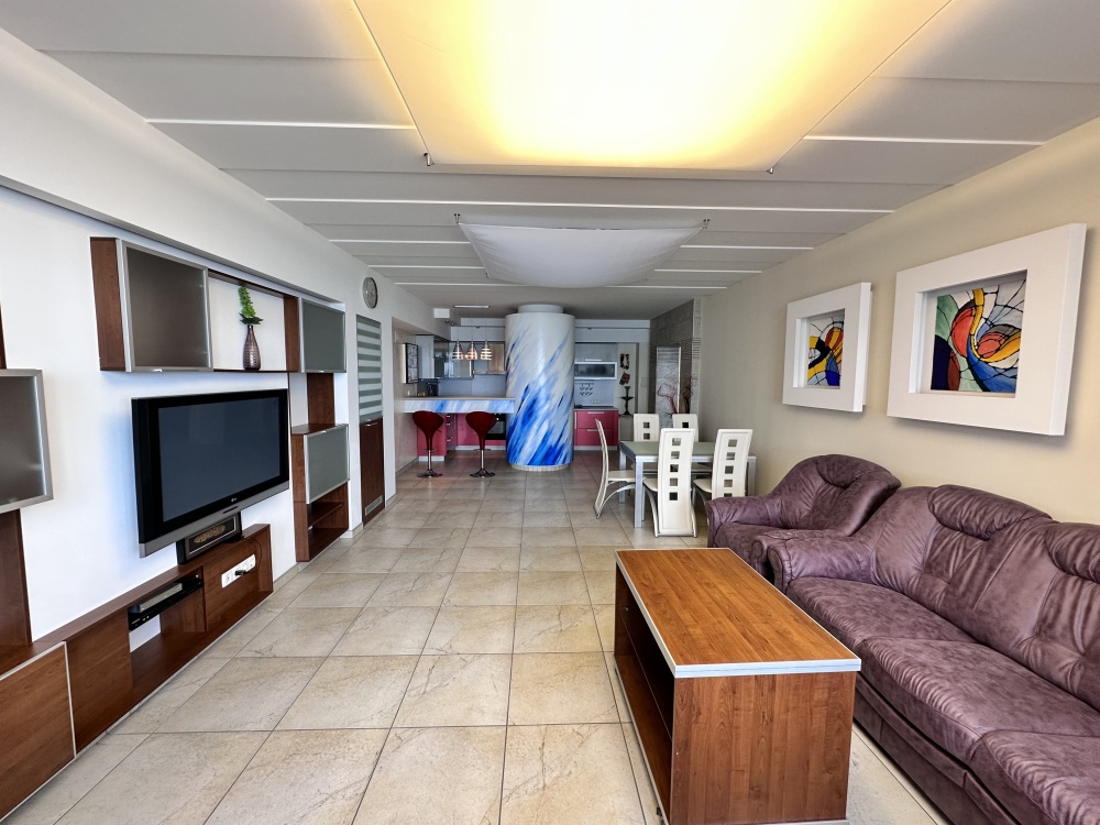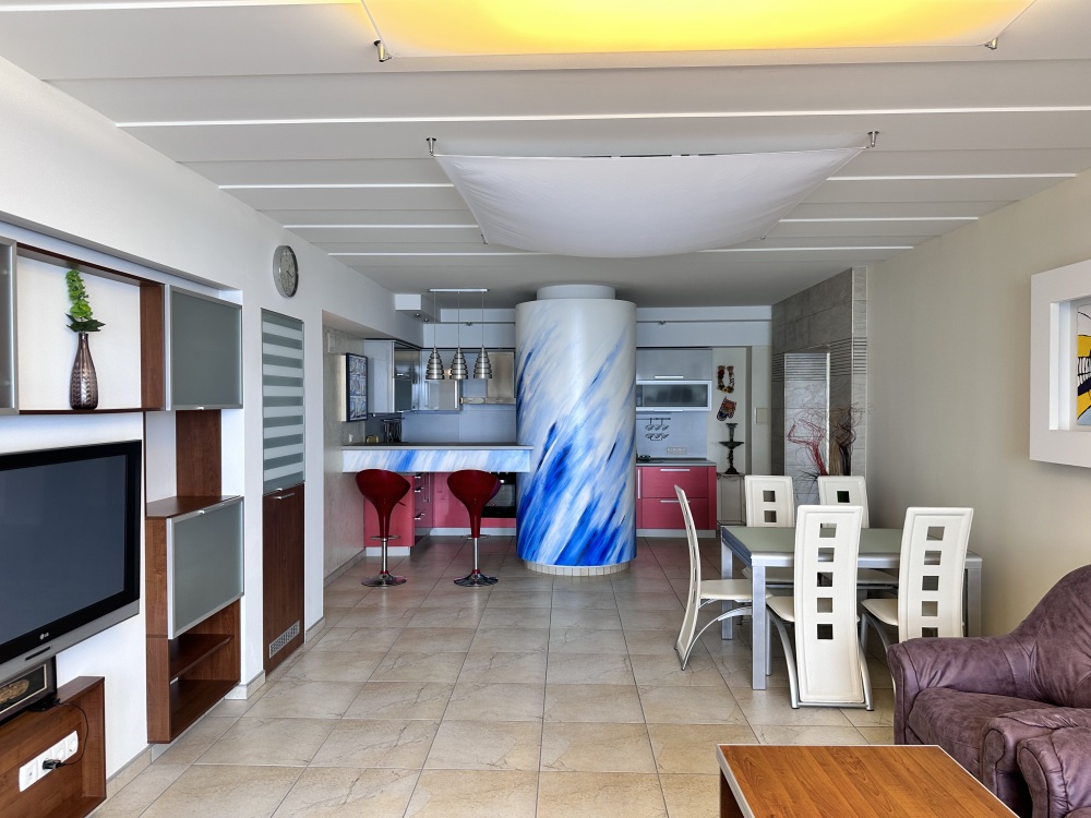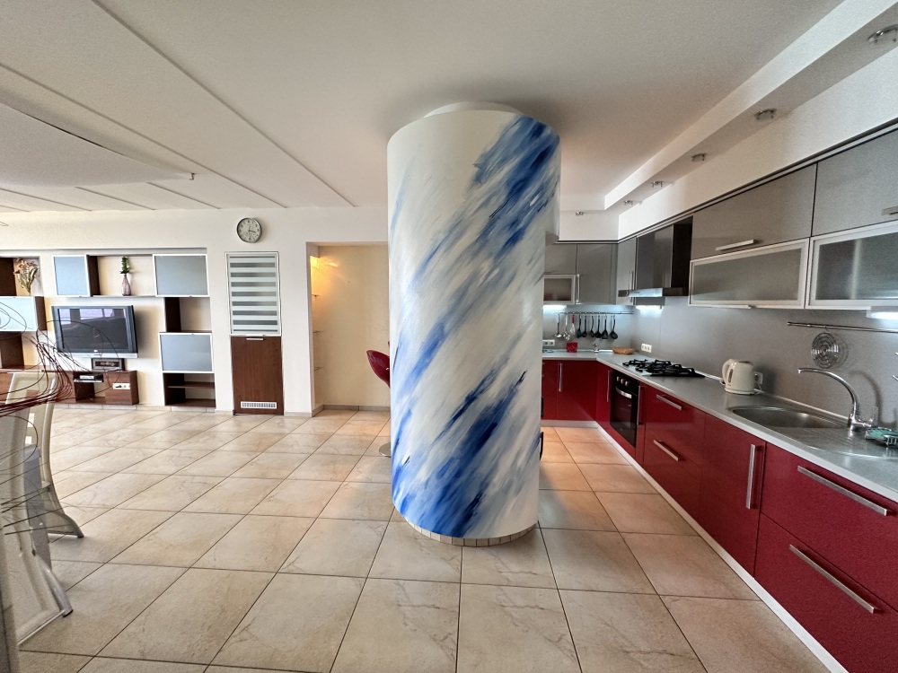 Апартаменты расположены на пятом этаже, поэтому из них Вы сможете любоваться панорамными видами на море. Планировка включает: две спальные комнаты (одна спальня с двуспальной кроватью, вторая – с раскладывающимся диваном), два совмещенных санузла (один из них в спальне); кухню-гостиную с угловым диваном (раскладывается) обеденным столом и барной стойкой; просторную лоджию площадью 35 кв.м., которая станет для Вас классной лаундж-зоной, где Вы сможете наслаждаться морским бризом в полном спокойствии и тишине. Установлены автоматические роллеты. В апартаменте выполнен качественный ремонт, оснащён хорошей мебелью и техникой. Коммуникации: электричество, вода, канализация. Установлена система теплый пол.