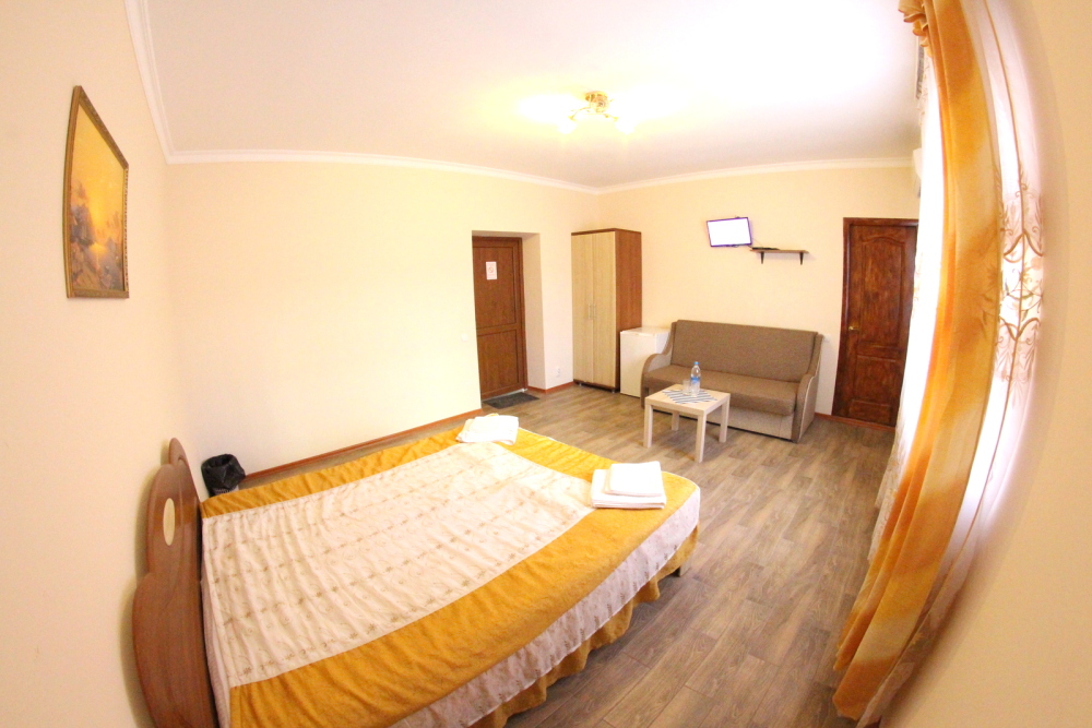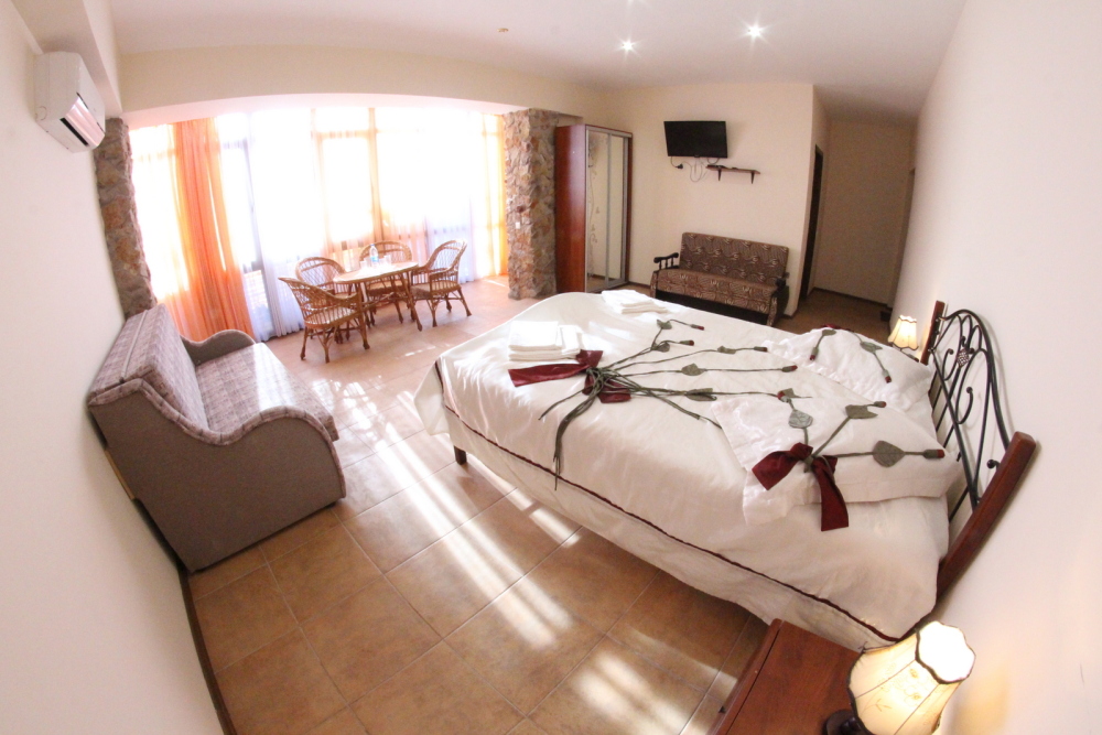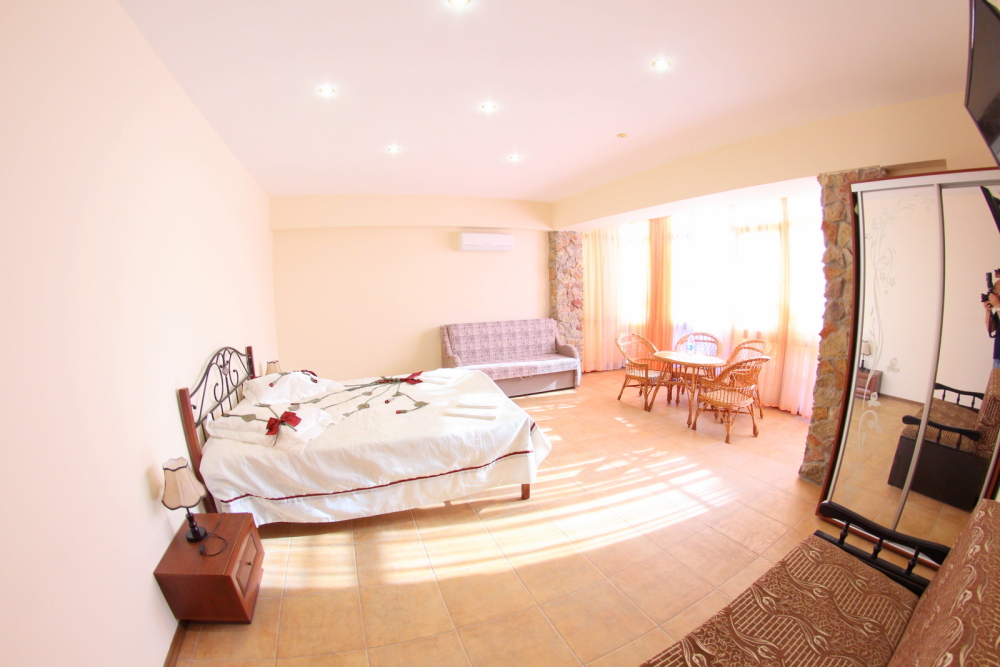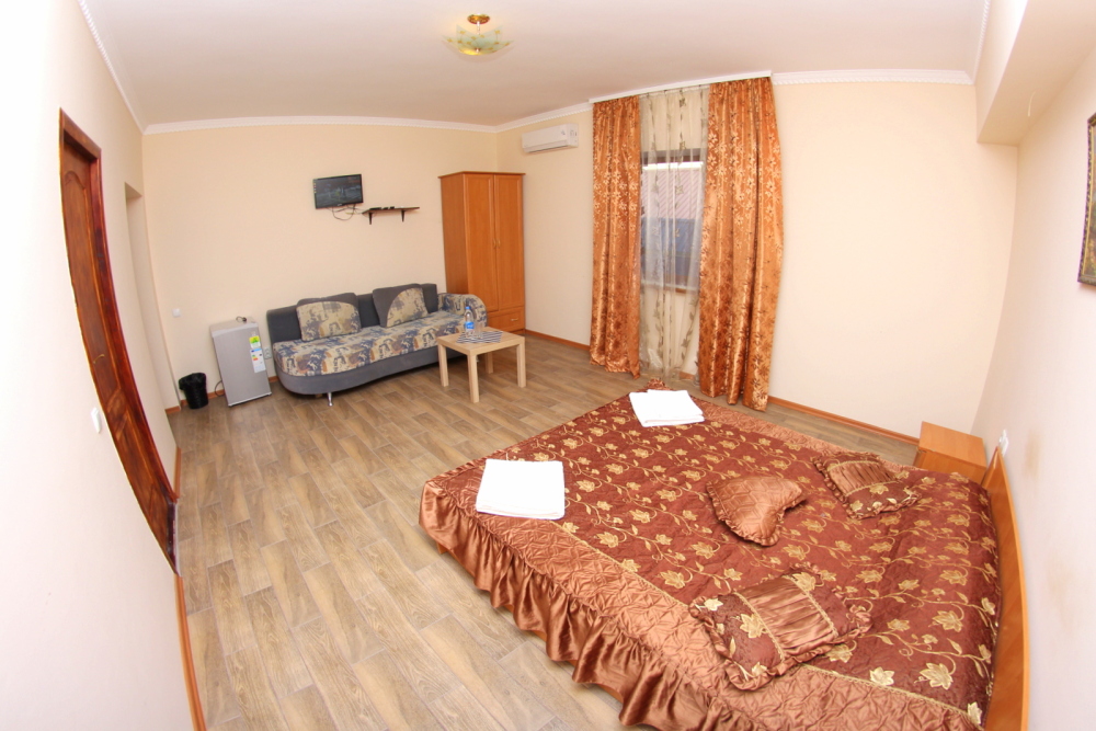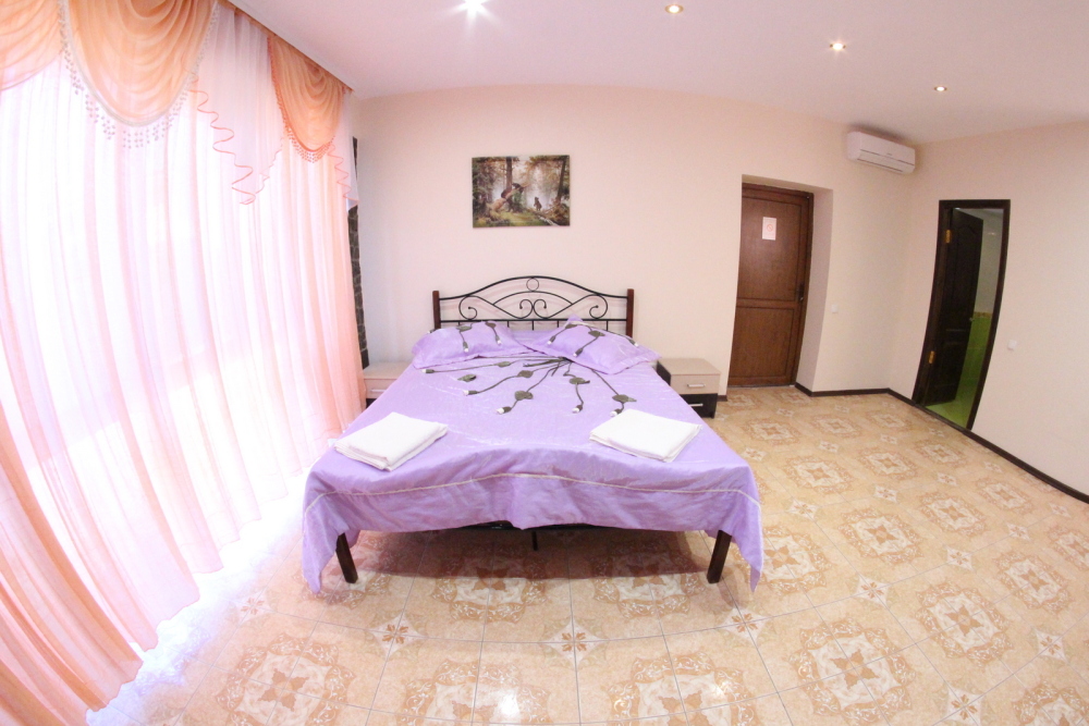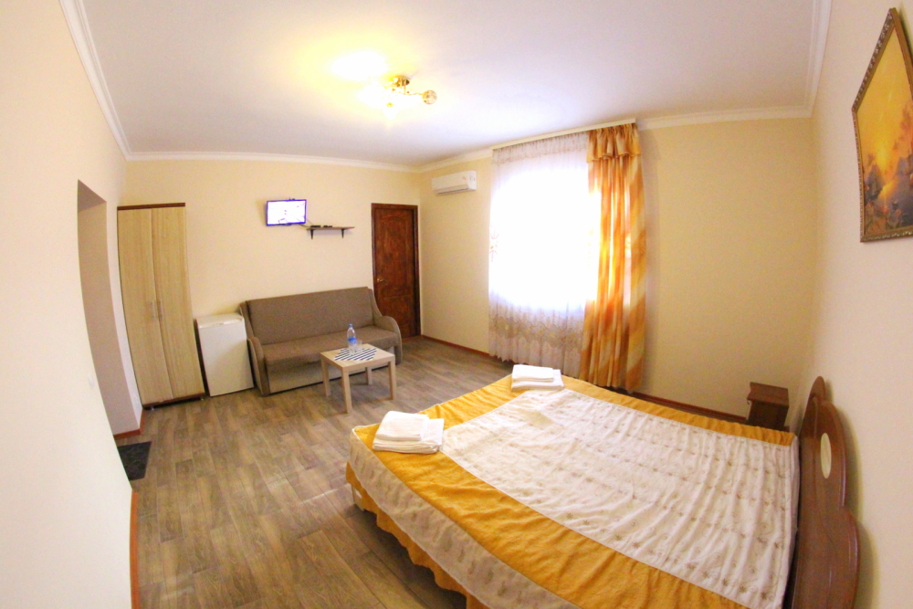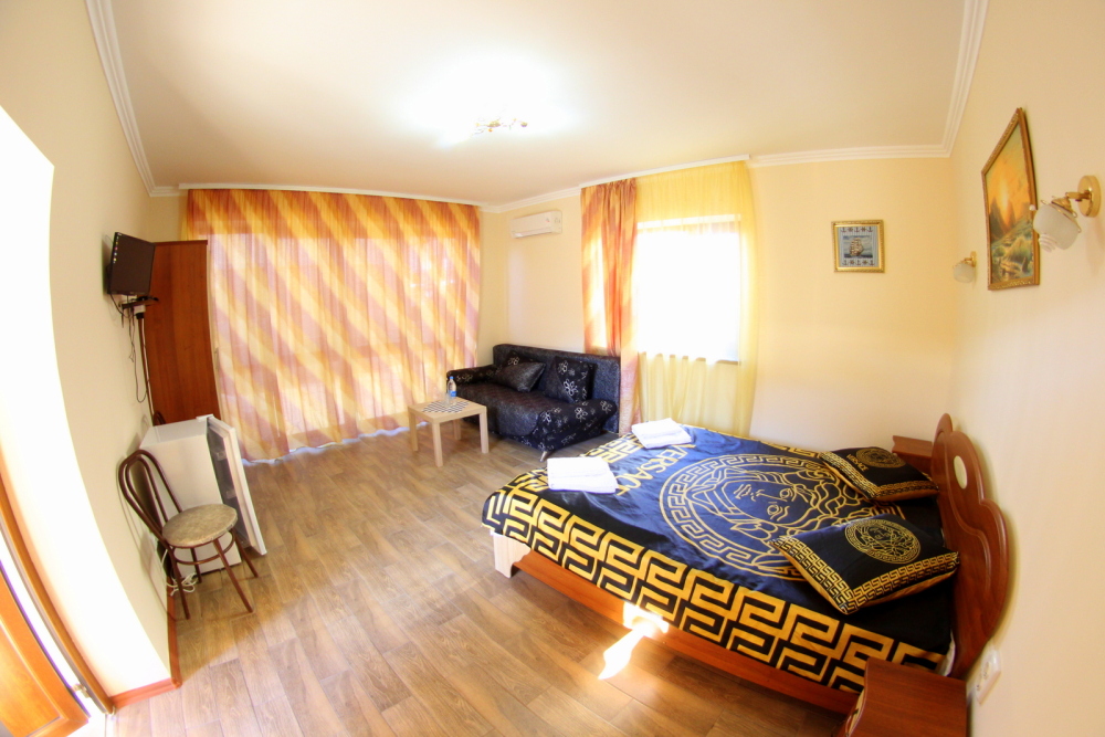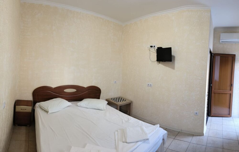 Во дворе отдельная кухня, мангальная зона и бассейн. В каждом номере свой отдельный санузел с душем, телевизором, кондиционером и холодильником. Бесплатный интернет Wi-Fi, трансфер. Пляж и центральная набережная расположены в 800 метрах от гостевого дома.