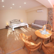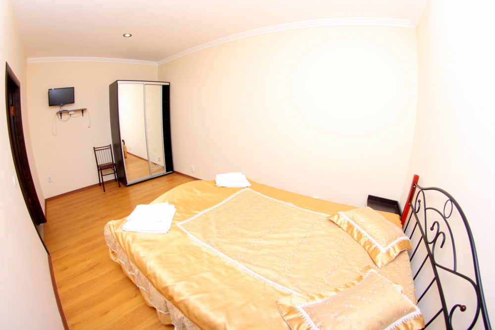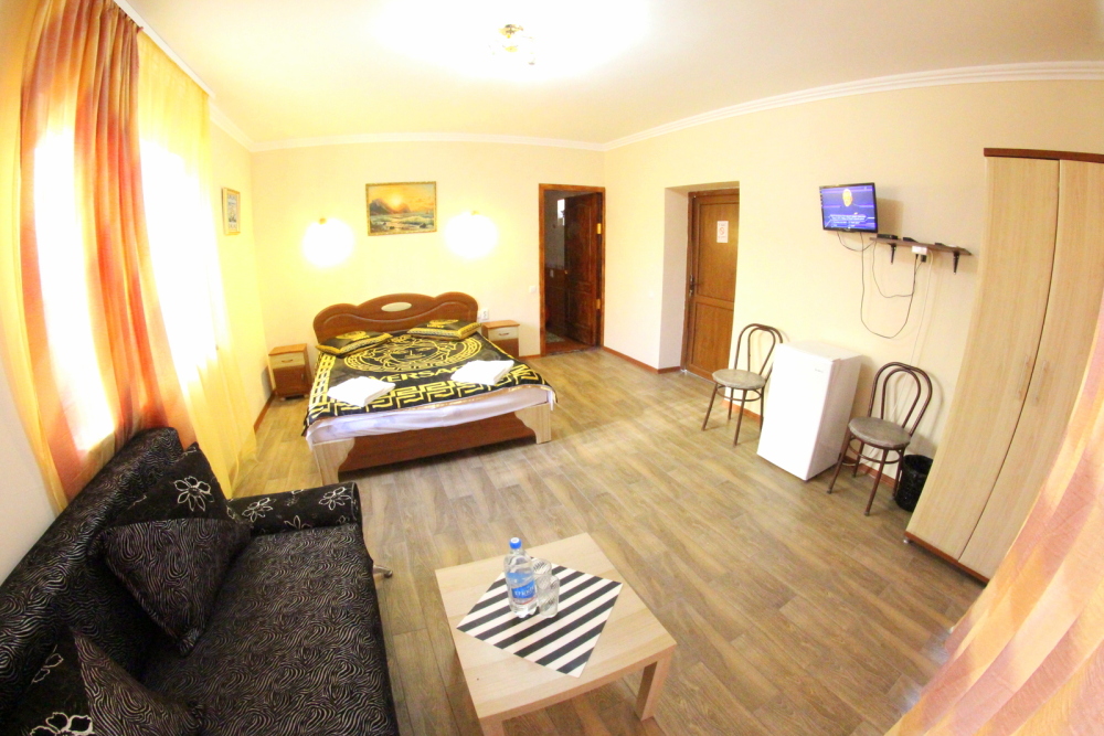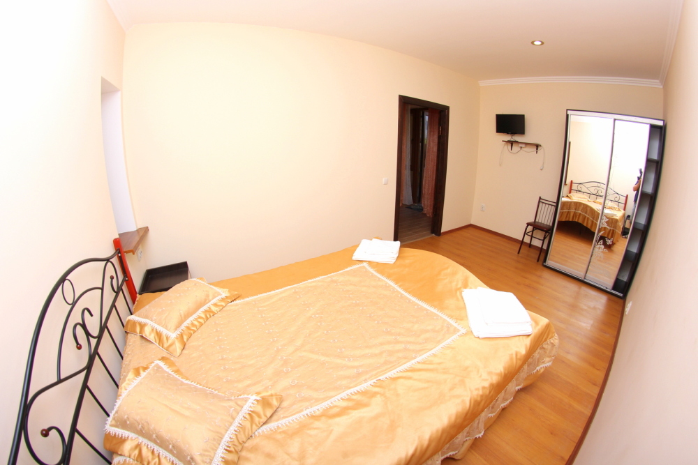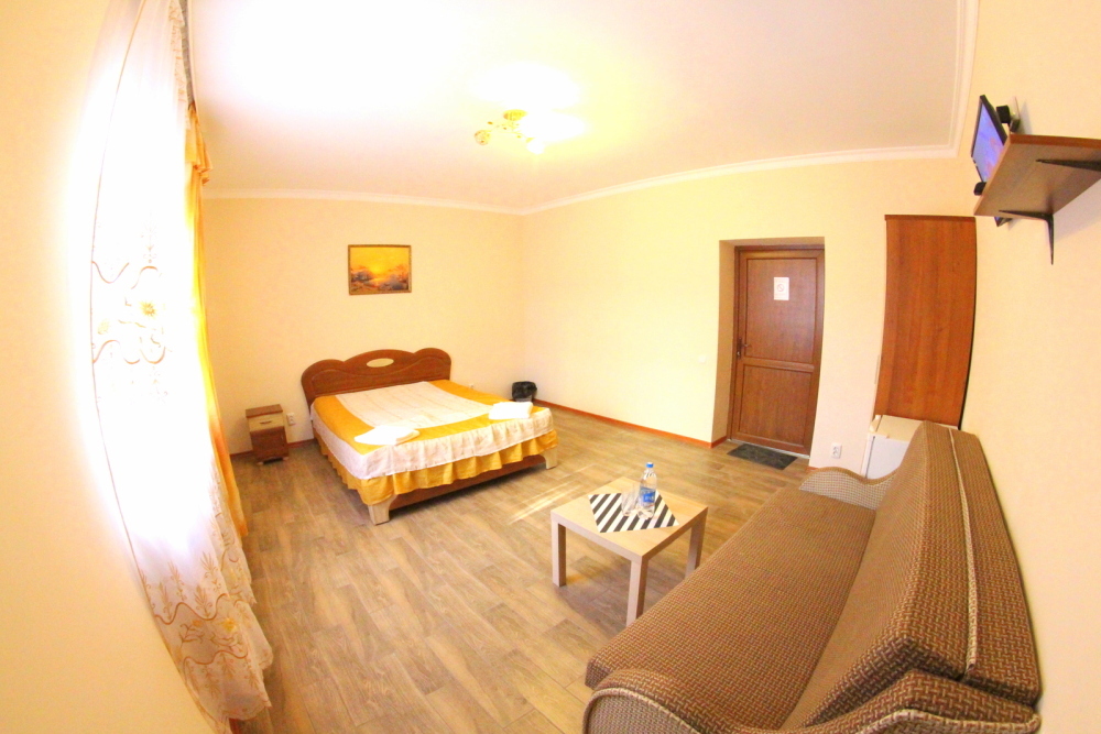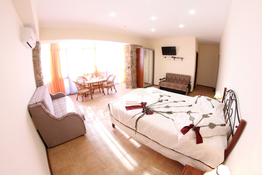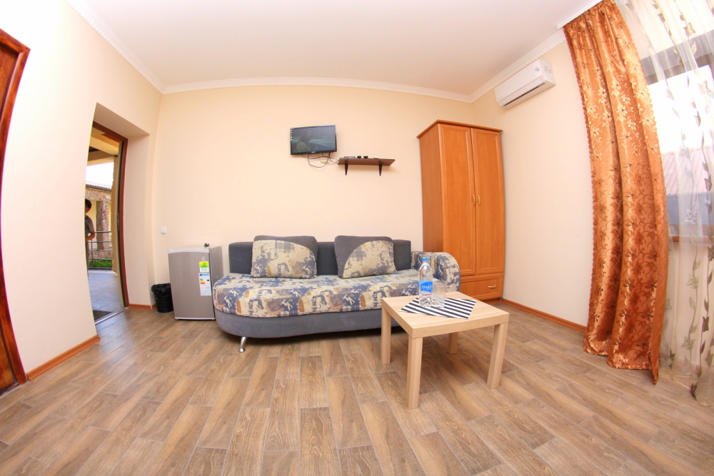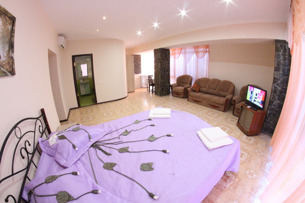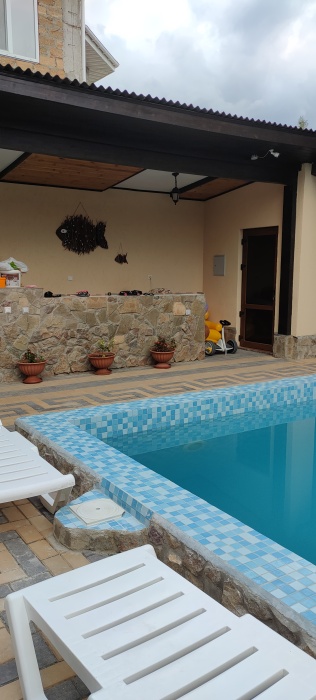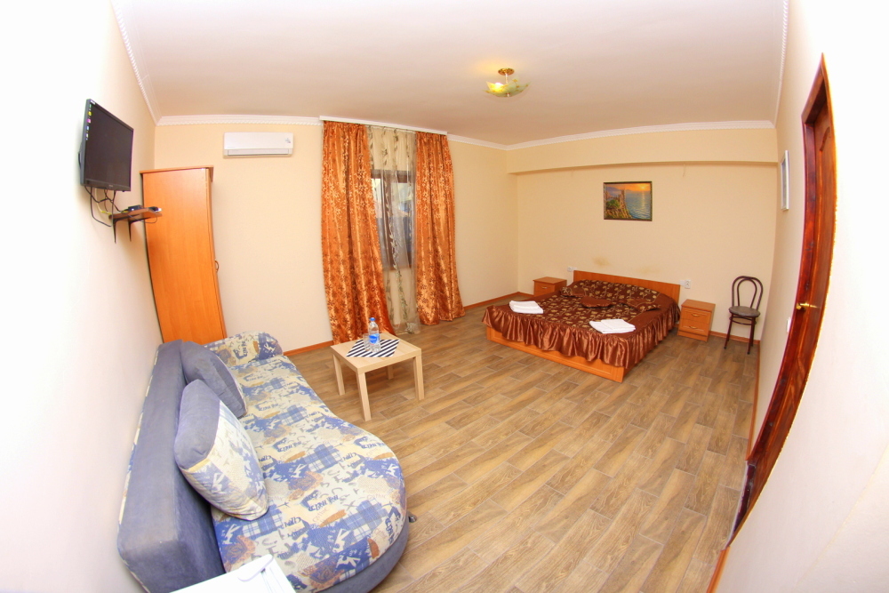 Во дворе отдельная кухня, мангальная зона и бассейн. В каждом номере свой отдельный санузел с душем, телевизором, кондиционером и холодильником. Бесплатный интернет Wi-Fi, трансфер. Пляж и центральная набережная расположены в 800 метрах от гостевого дома.