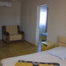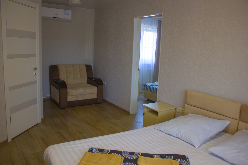 Двухкомнатный номер в отеле, предназначен для большой семьи, в нем с комфортом смогут разместиться пары с детьми любого возраста, для самых маленьких в отеле есть кроватки. В номере есть два телевизора - по одному в комнате.