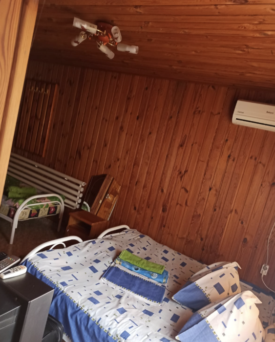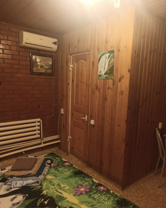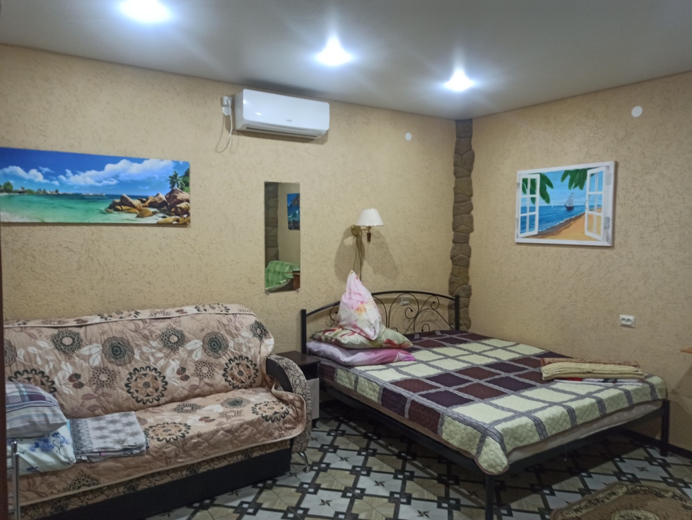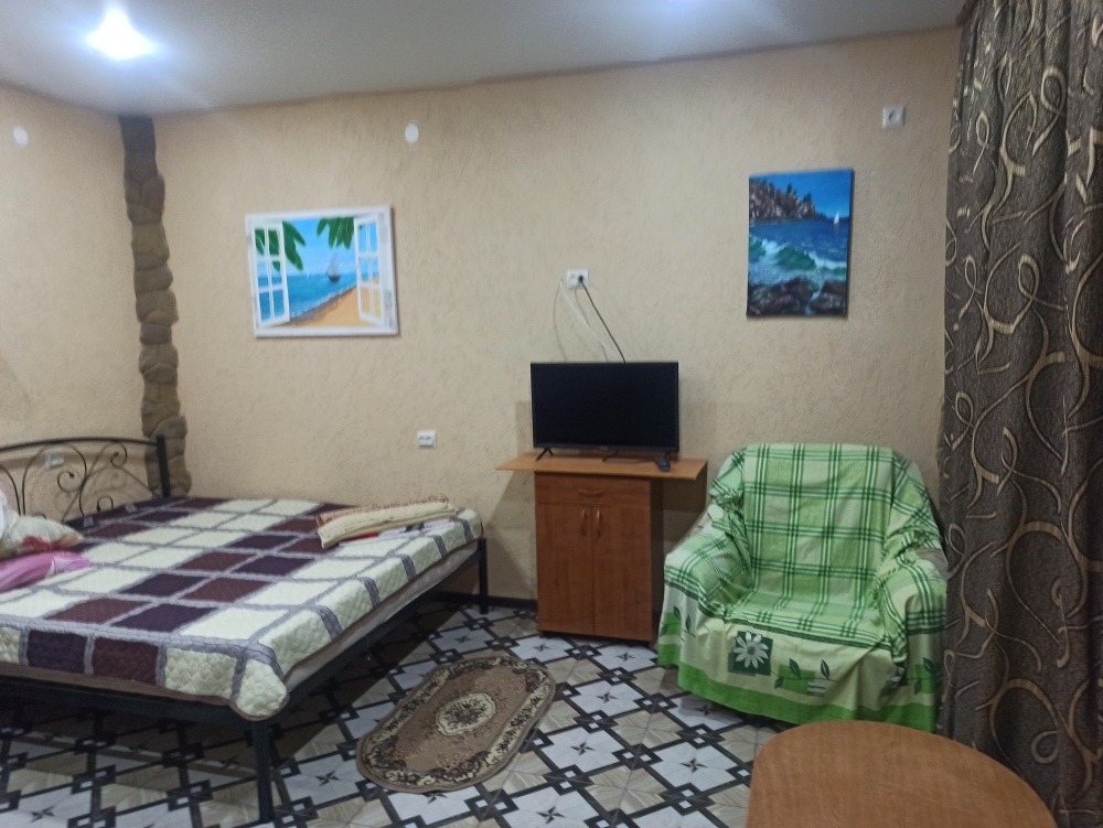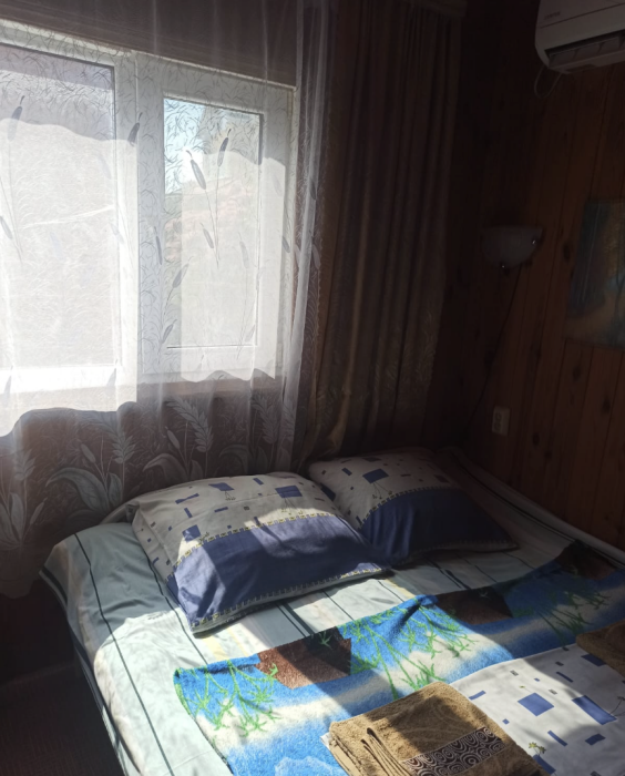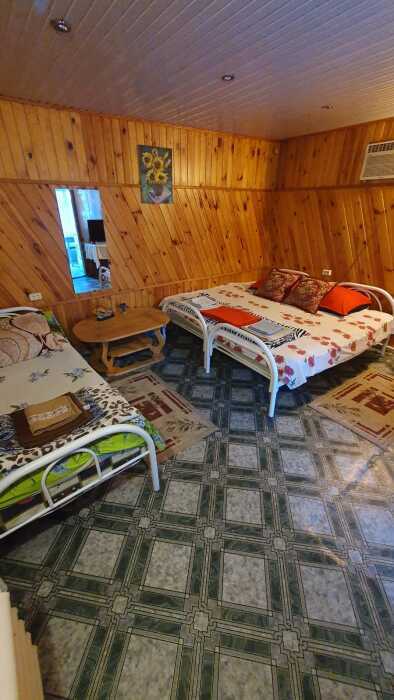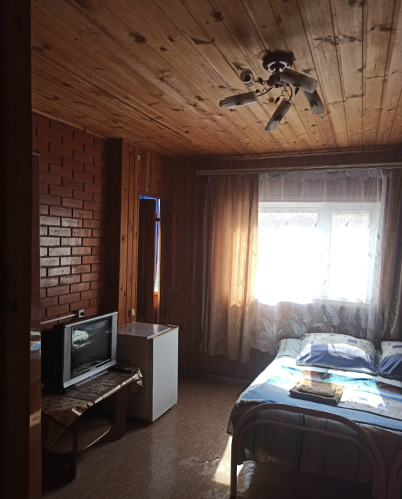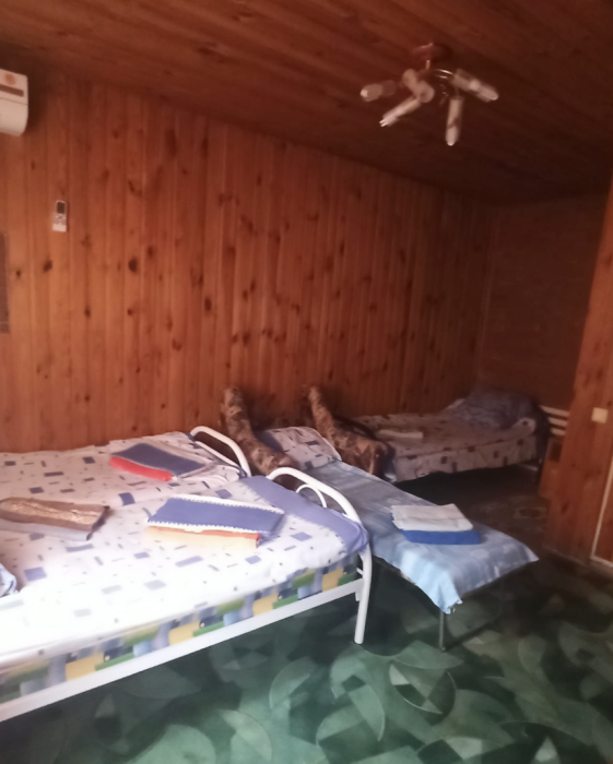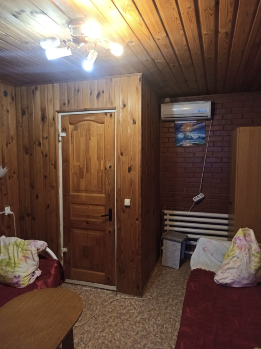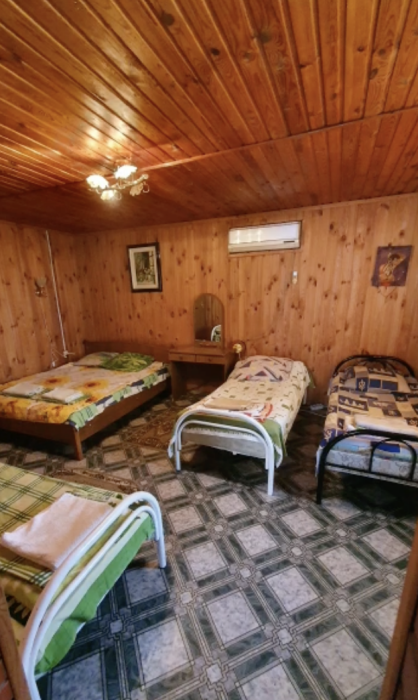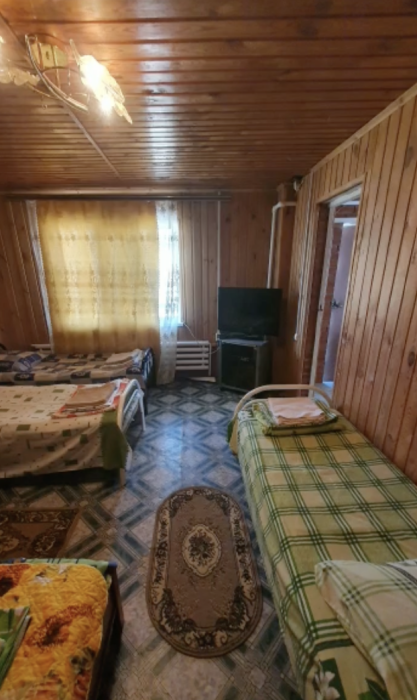 4-местный номер со всеми удобствами, на 1 этаже кирпичного дома: душ, туалет, кухня, посуда, холодильник, ТВ, сплит система, всё есть, стол на улице. А также детская площадка и большая зона отдыха с диванами, столиками и мангалом.