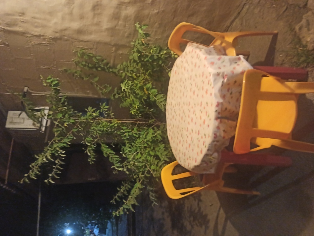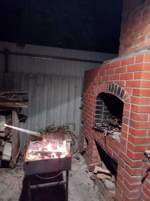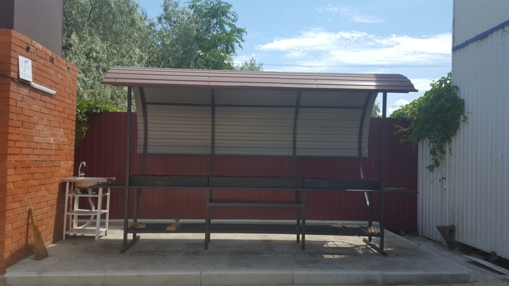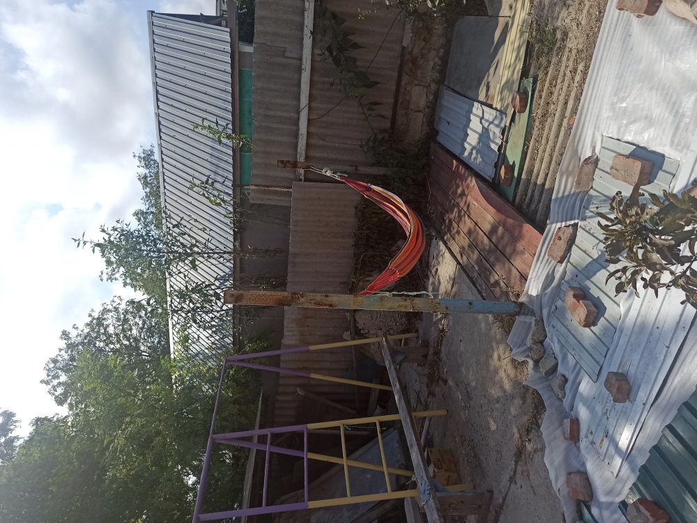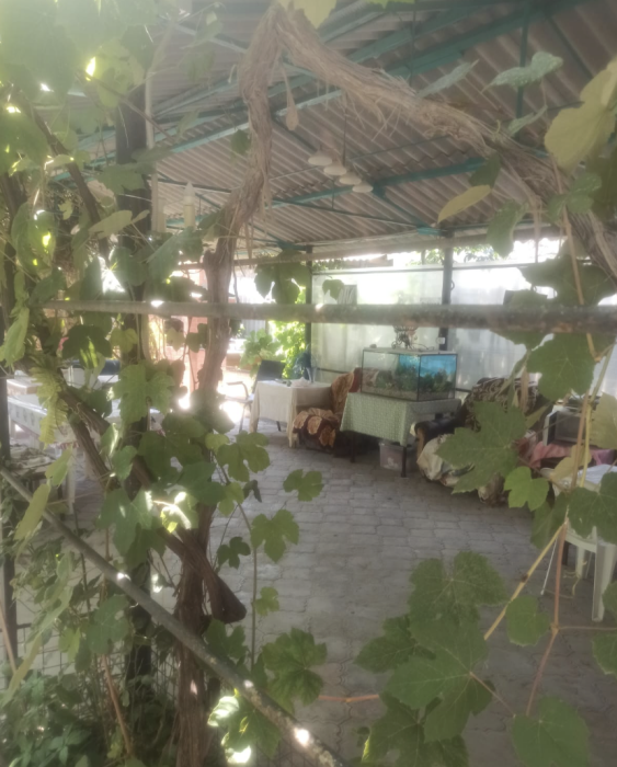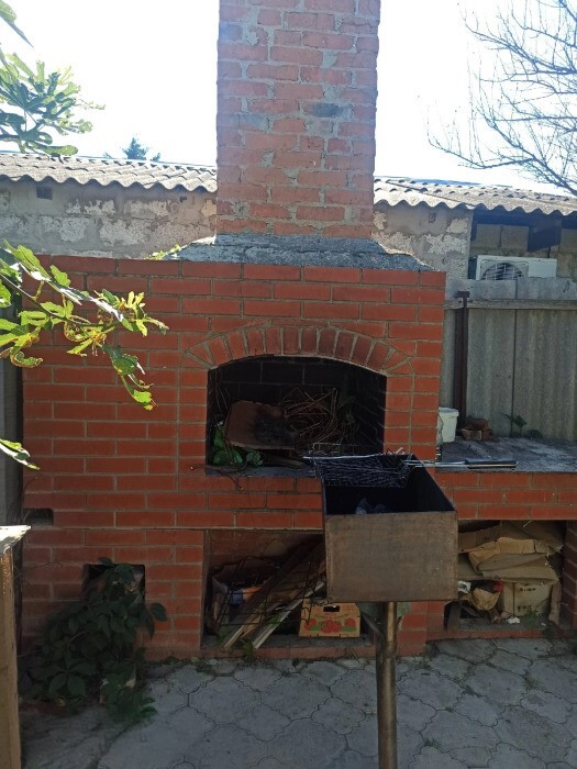 Место у дома, мангал, столики, диванчики, сад( вишня, персики, яблони), гамак
