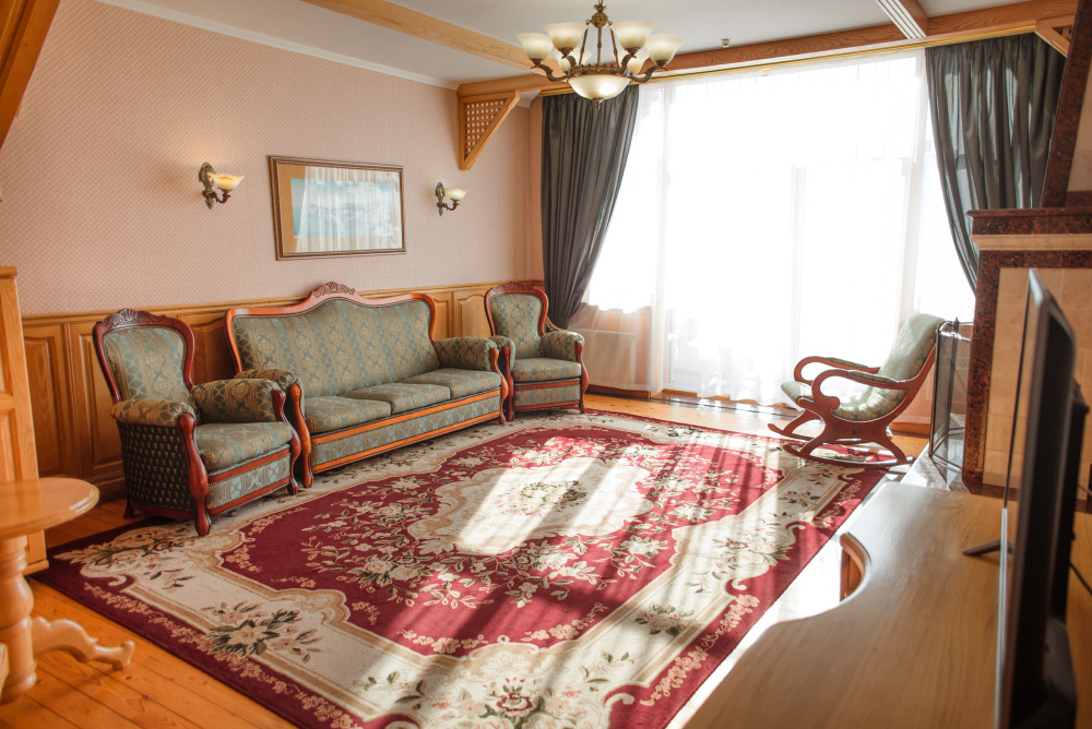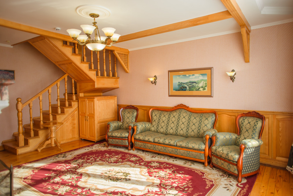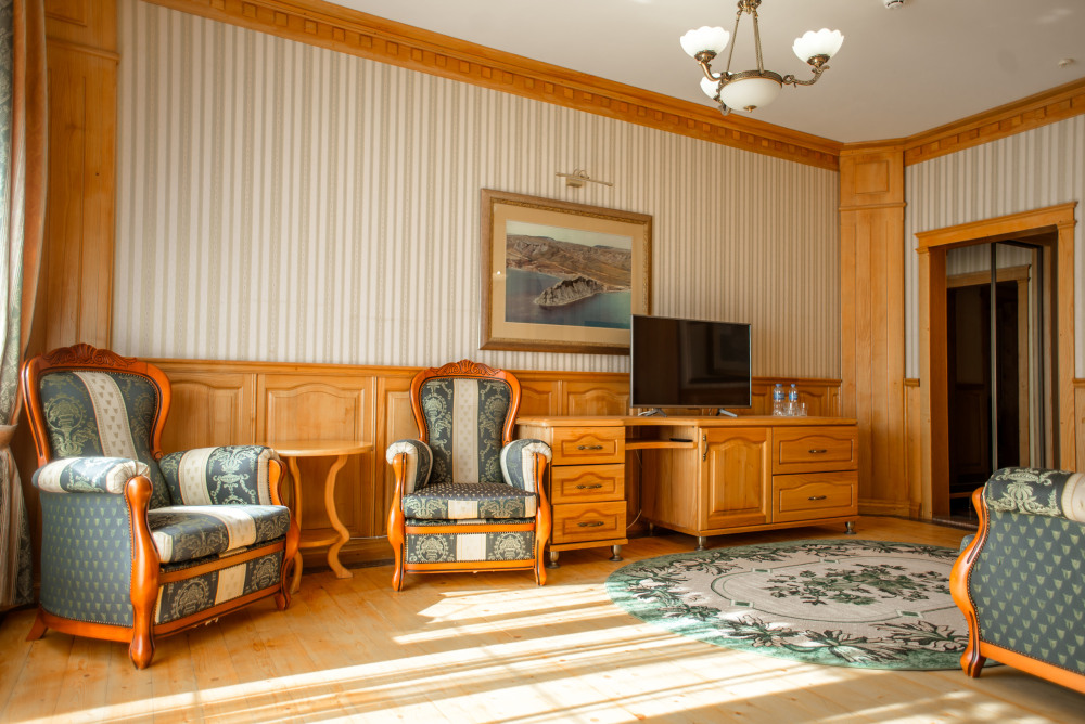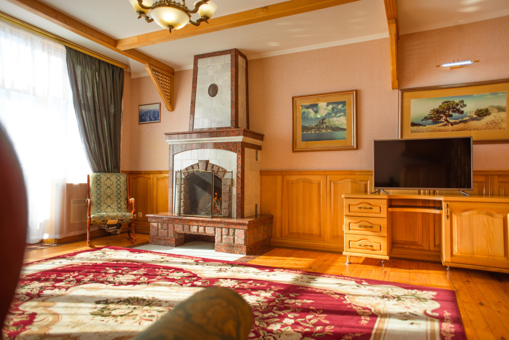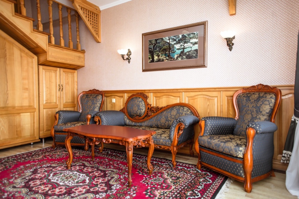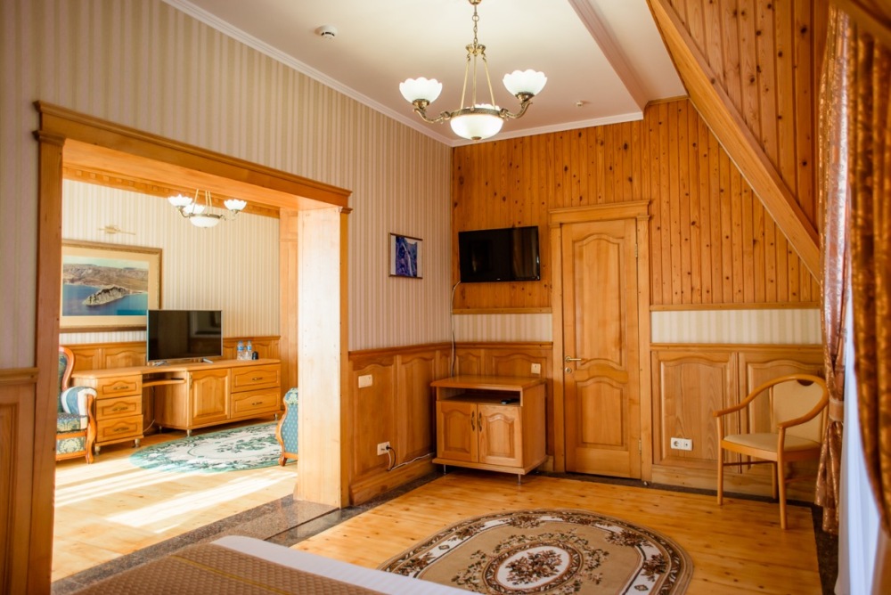 Каминный (с малой гостиной) – двухуровневый люкс с действующим камином и незабываемым видом на море. На первом этаже – небольшая гостиная с мебелью в классическом стиле, камином, спальней и гостевым санузлом. На втором – уютная зона для отдыха, оборудована диваном и телевизором, санузел с ванной.