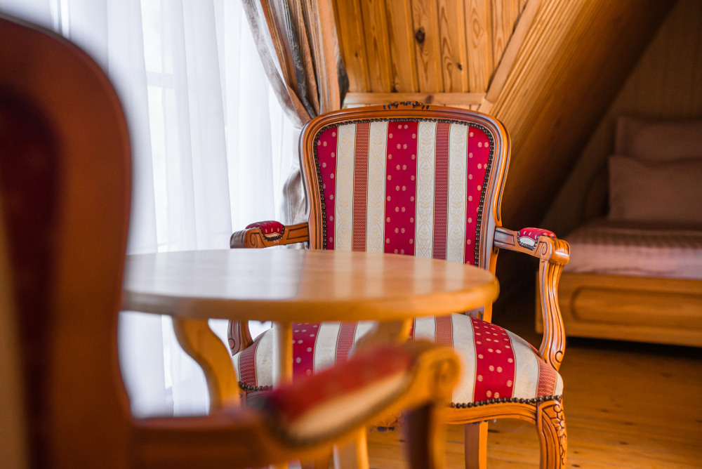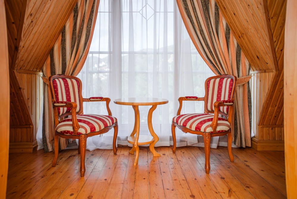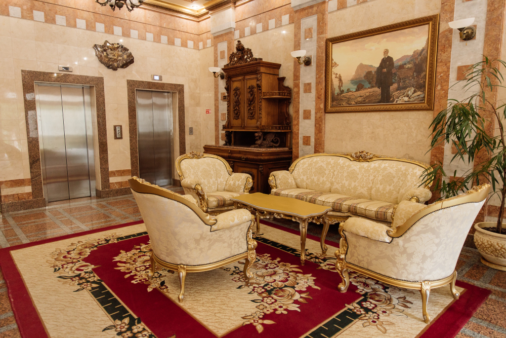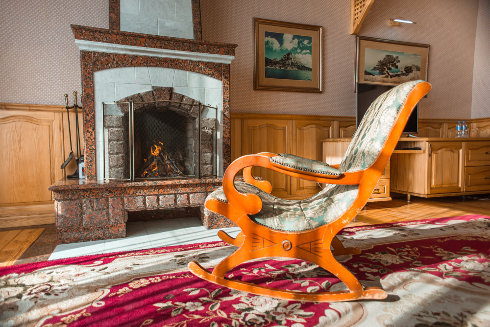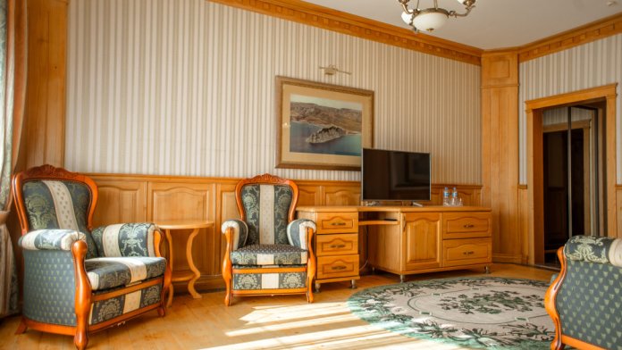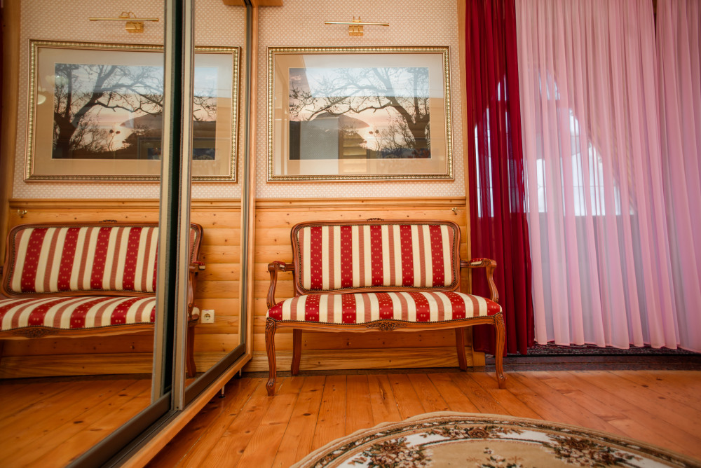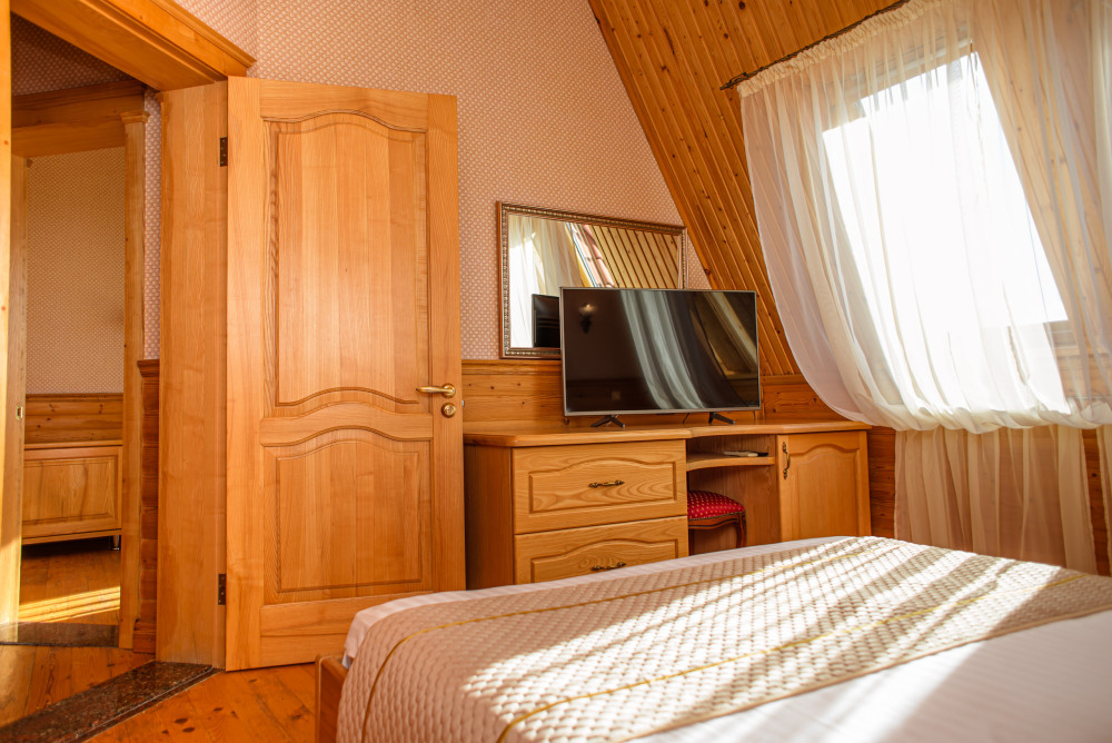 Каминный (с малой гостиной) – двухуровневый люкс с действующим камином и незабываемым видом на море. На первом этаже – небольшая гостиная с мебелью в классическом стиле, камином, спальней и гостевым санузлом. На втором – уютная зона для отдыха, оборудована диваном и телевизором, санузел с ванной.