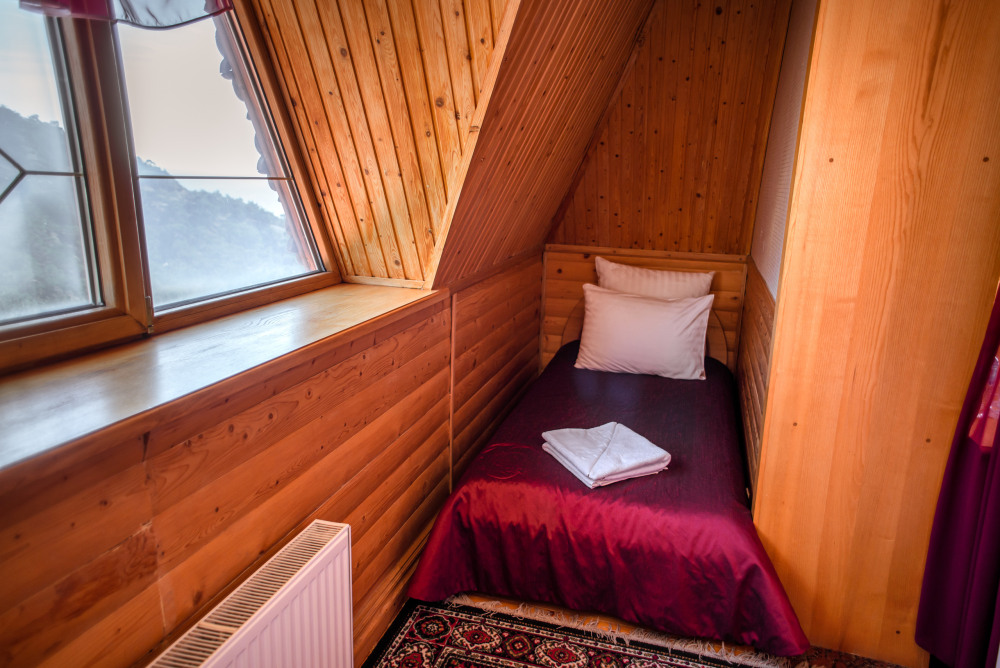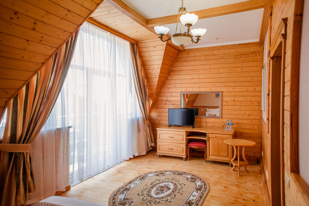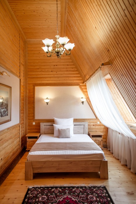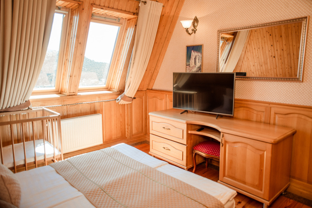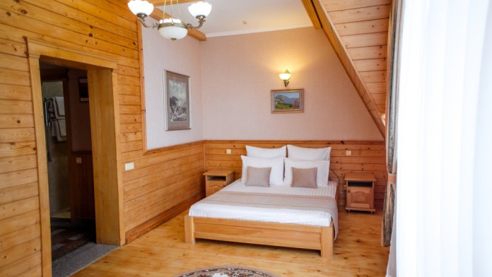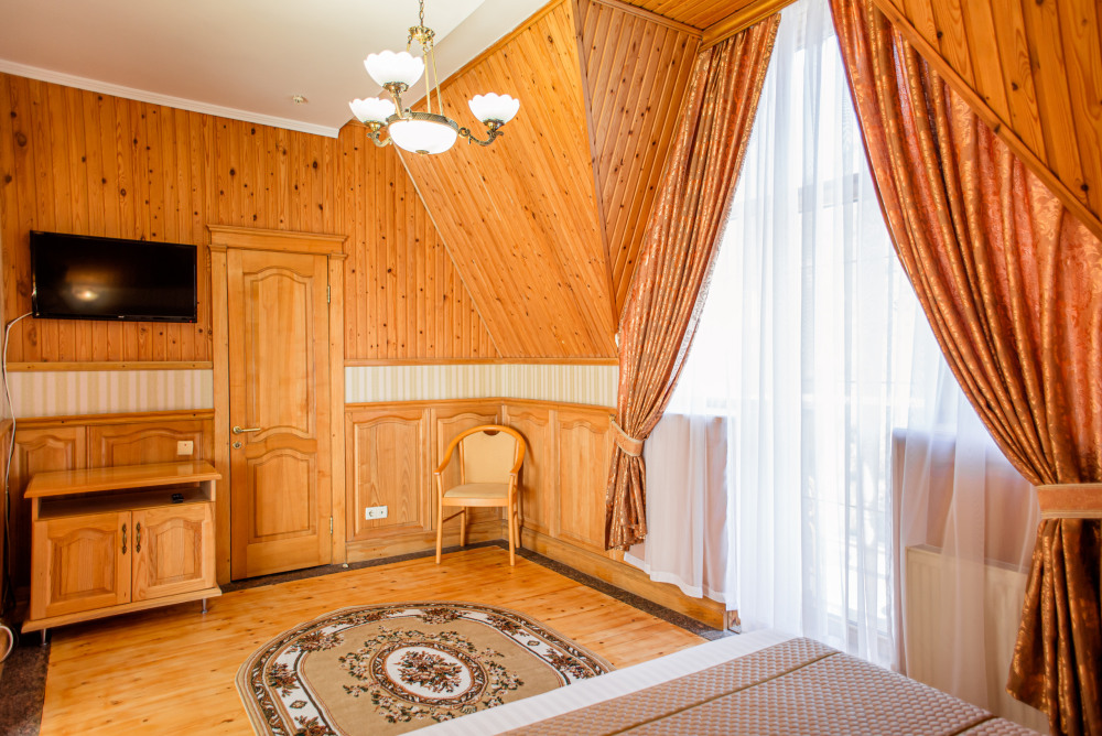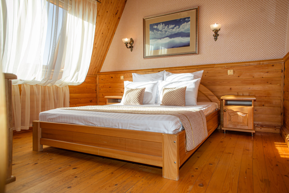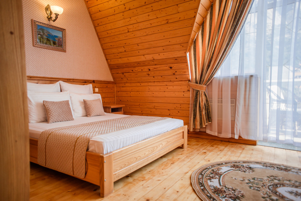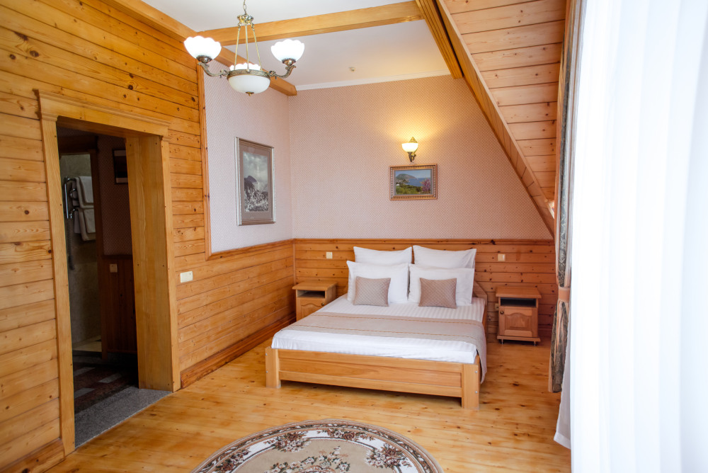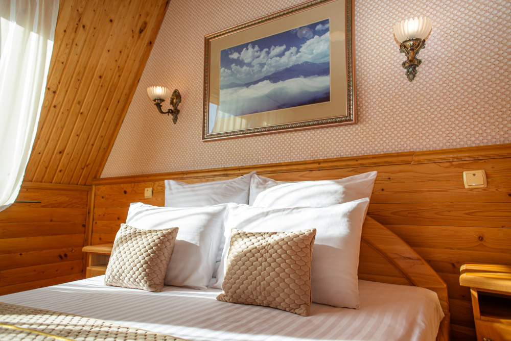 Однокомнатный уютный номер с одной двуспальной кроватью и видом на горы без балкона. Площадь номера 20 кв м.