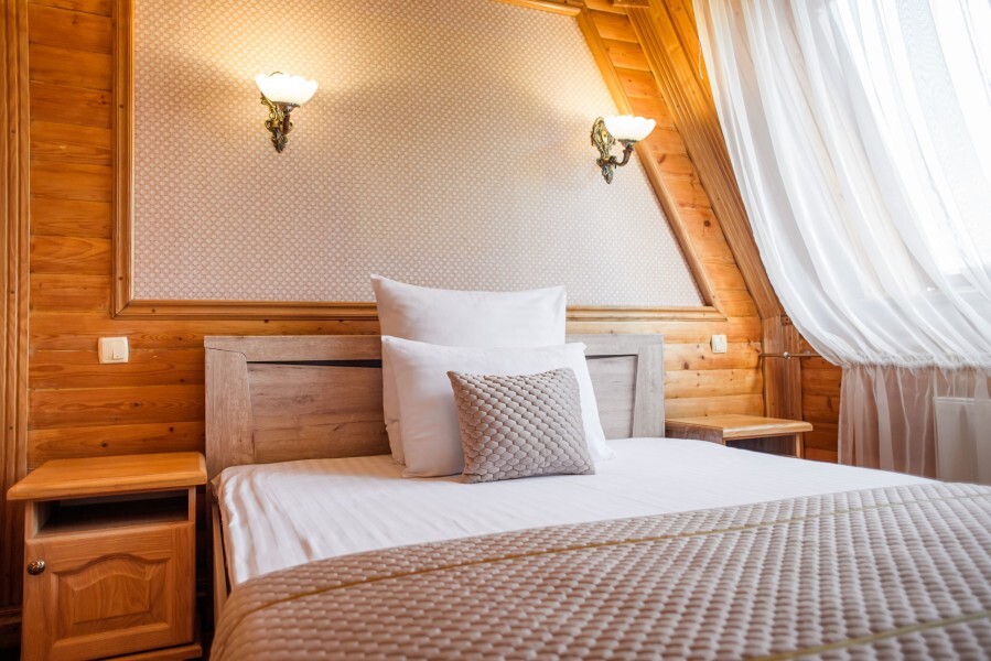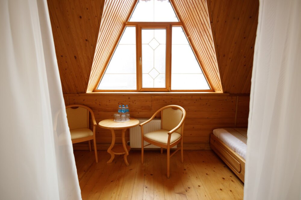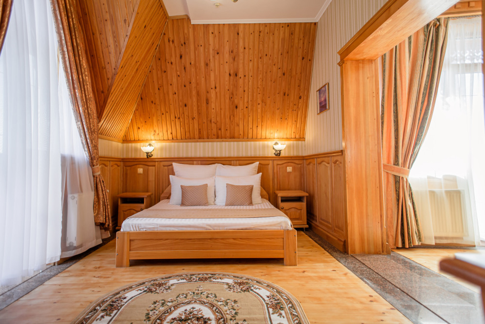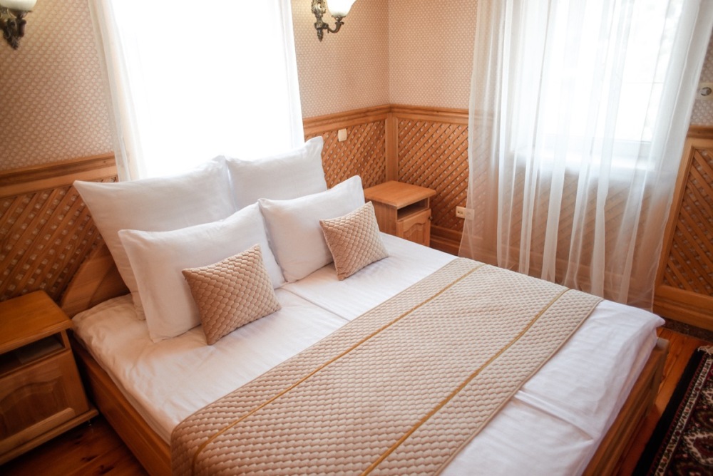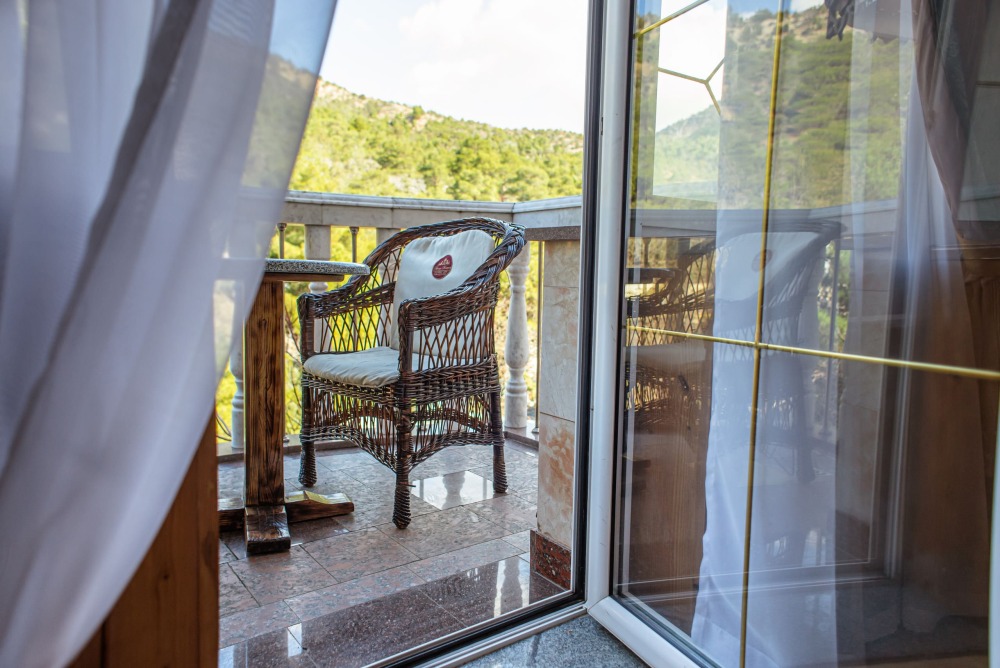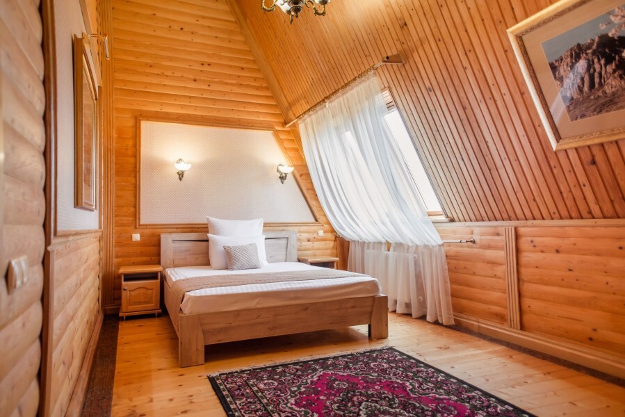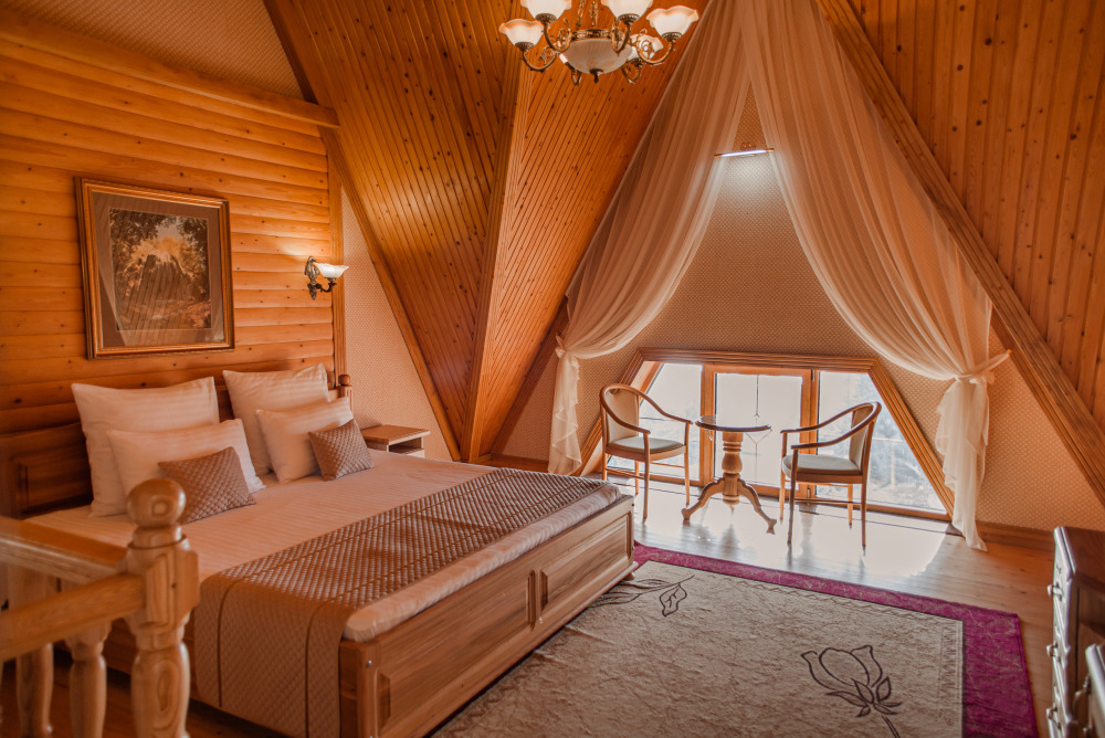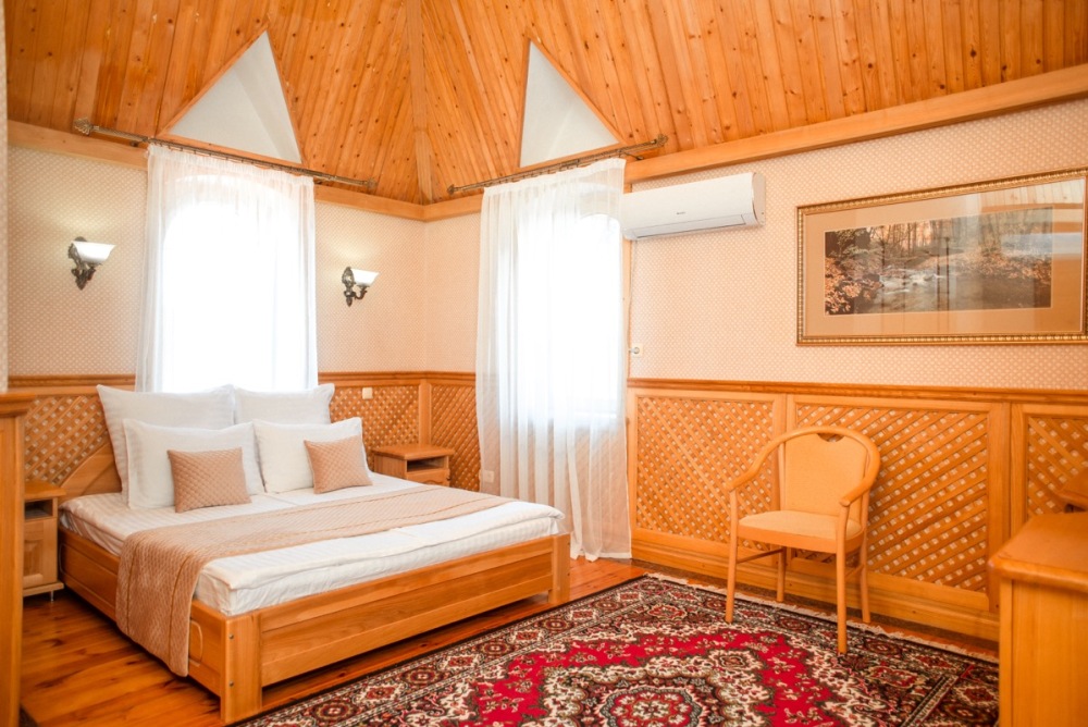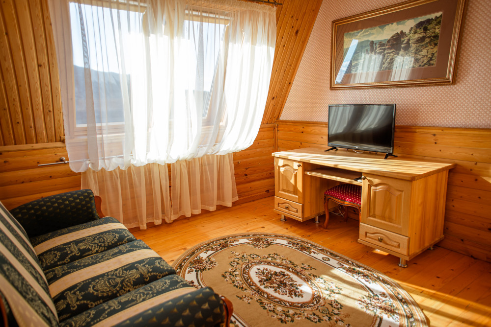 Однокомнатный уютный номер с одной двуспальной кроватью и видом на горы без балкона. Площадь номера 20 кв м.