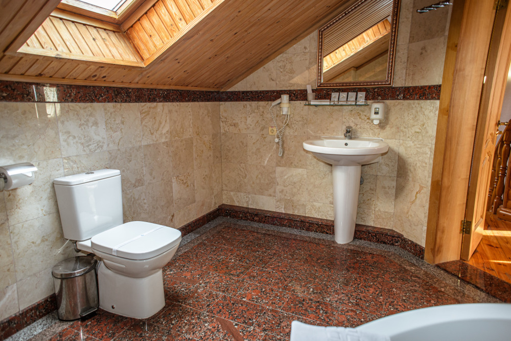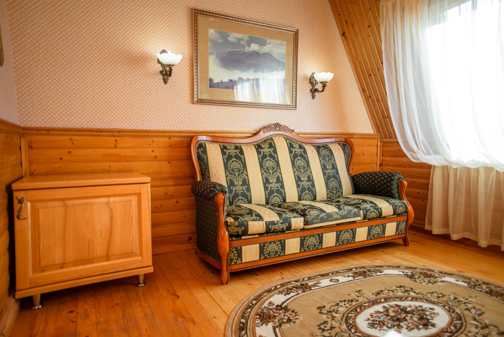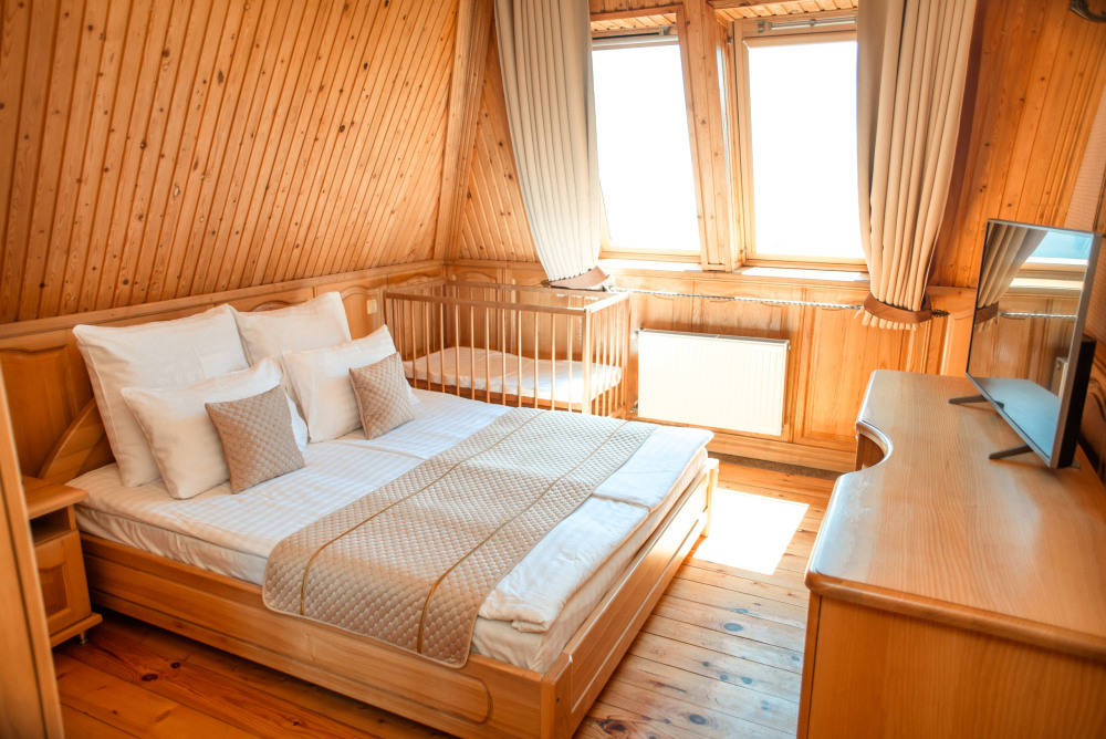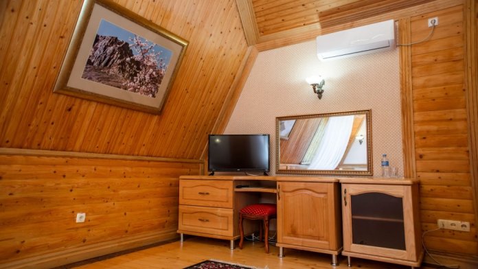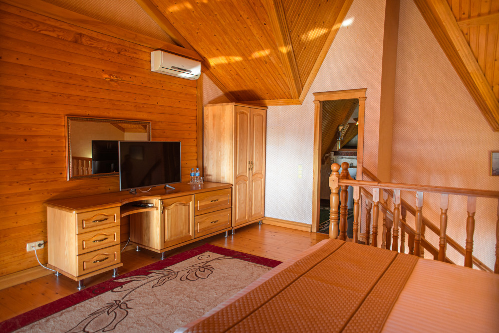 На первом этаже – уютная гостиная с двуспальным диваном, на втором этаже – спальня с двухспальной кроватью. На второй этаж ведет деревянная лестница. Есть 2 санузла, в одном из них ванная. В номерах установлены современные кондиционеры на обоих этажах.